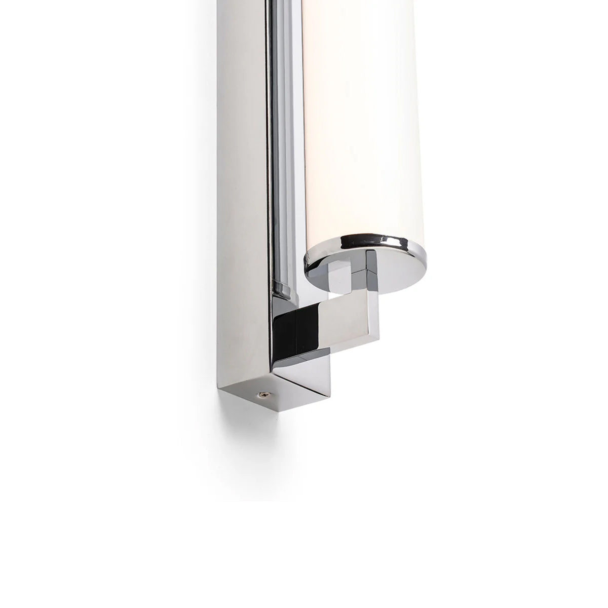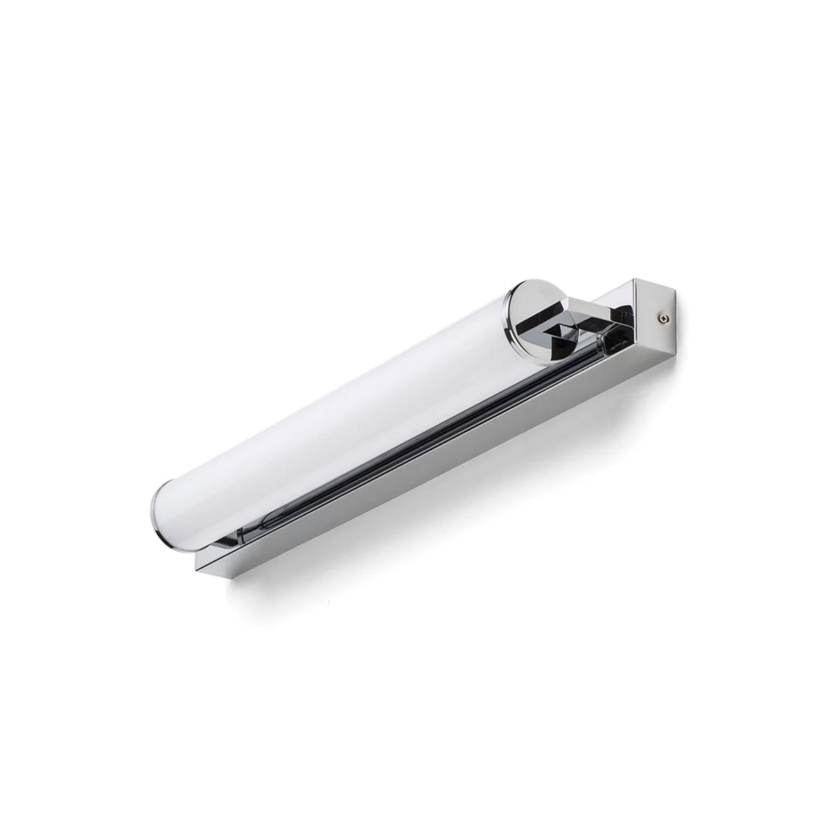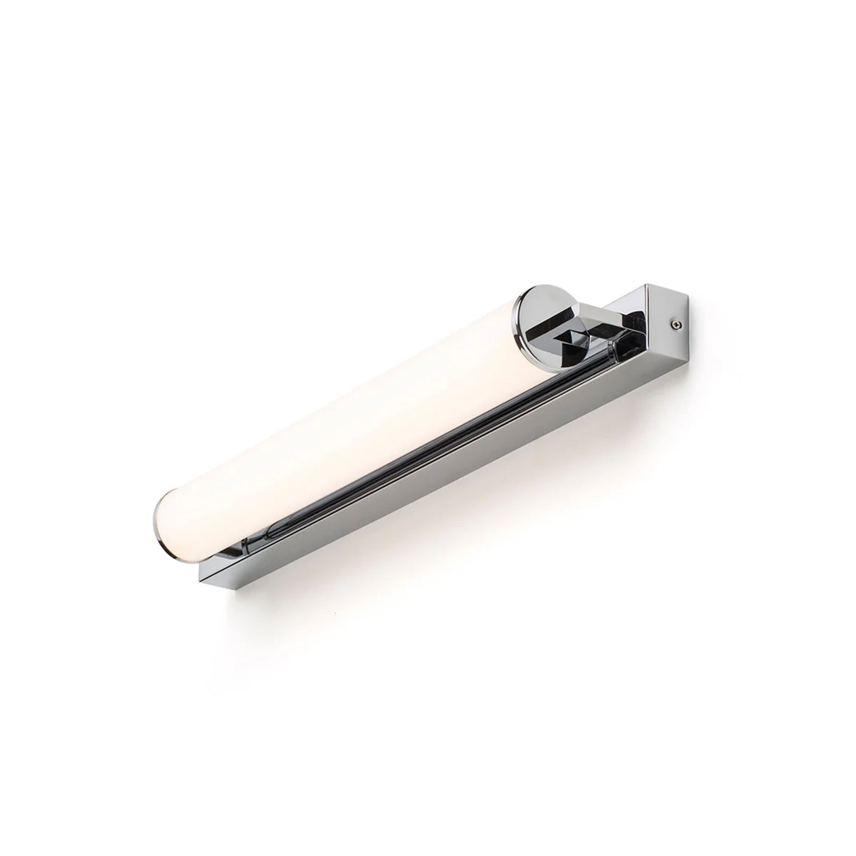 Corp de iluminat de perete pentru baie cu LED incorporat şi abajur in formă de tub de culoare opal pe o bază unghiulară solidă.