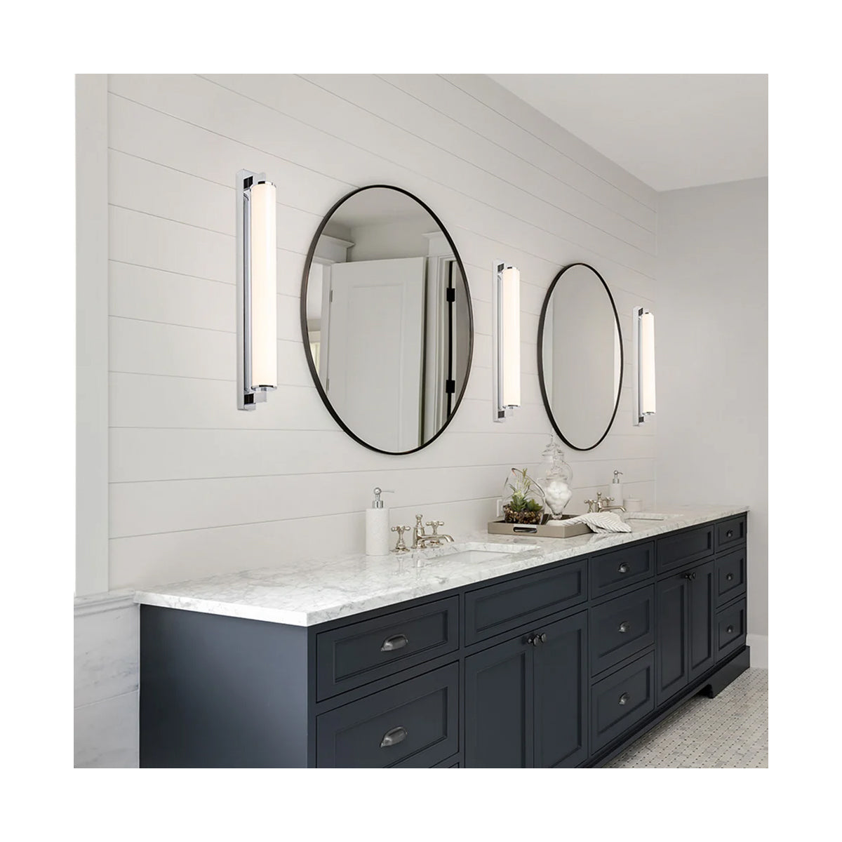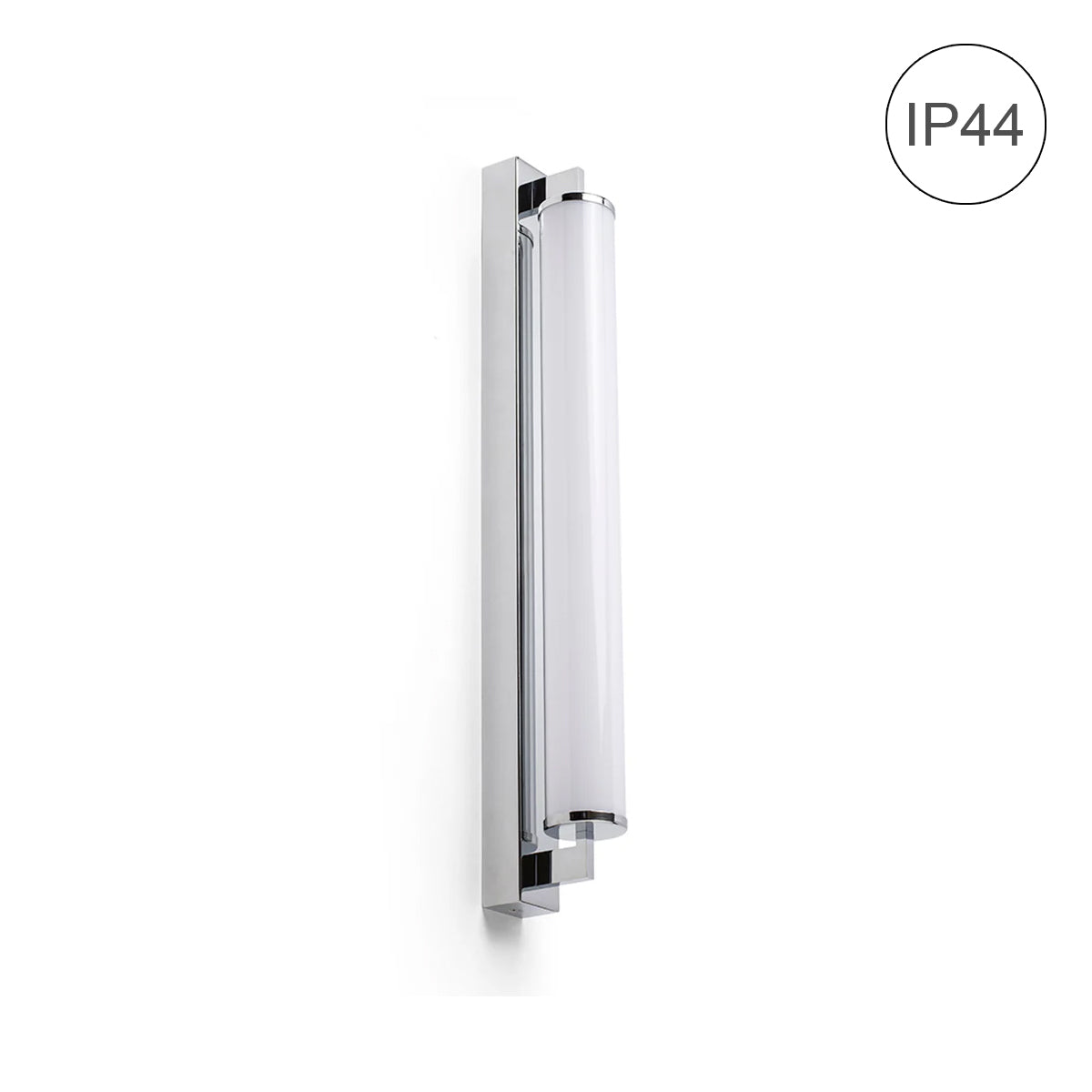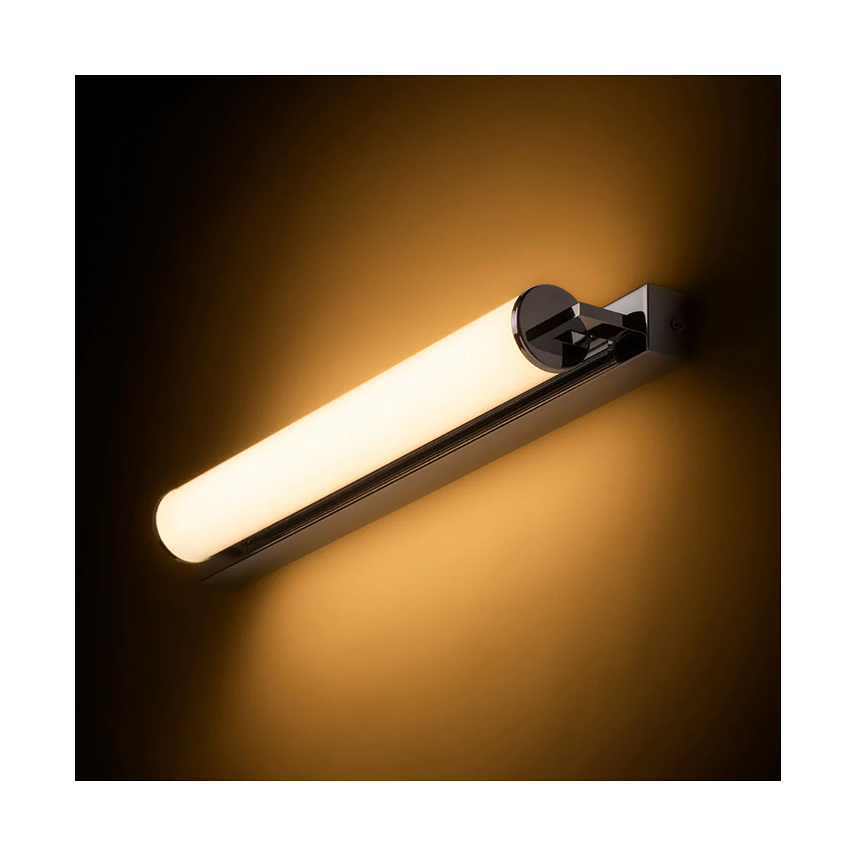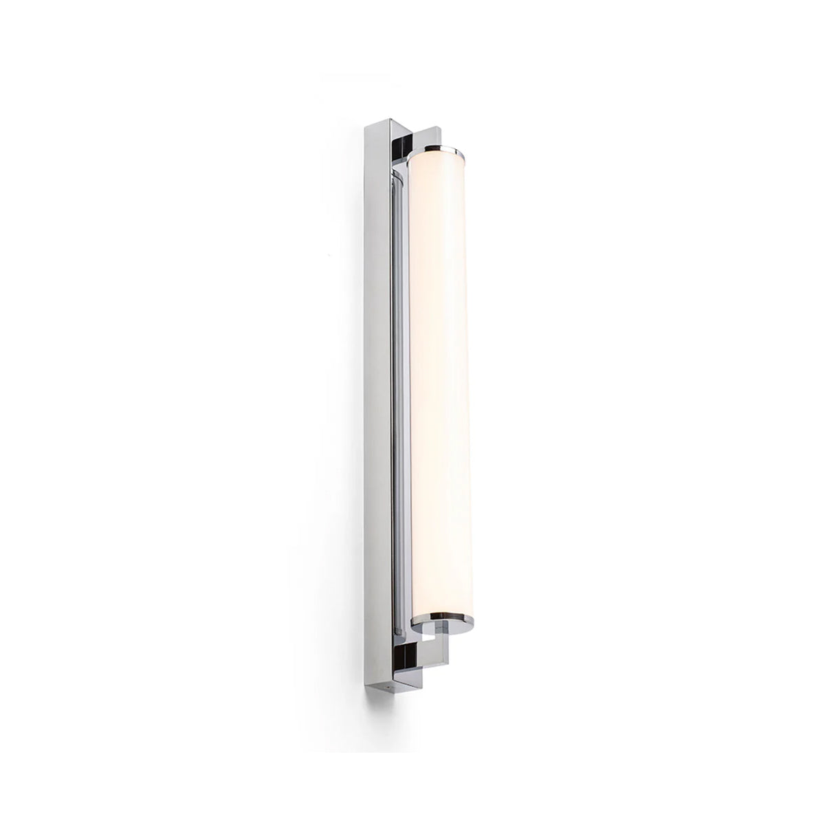 Corp de iluminat de perete pentru baie cu LED incorporat şi abajur in formă de tub de culoare opal pe o bază unghiulară solidă.