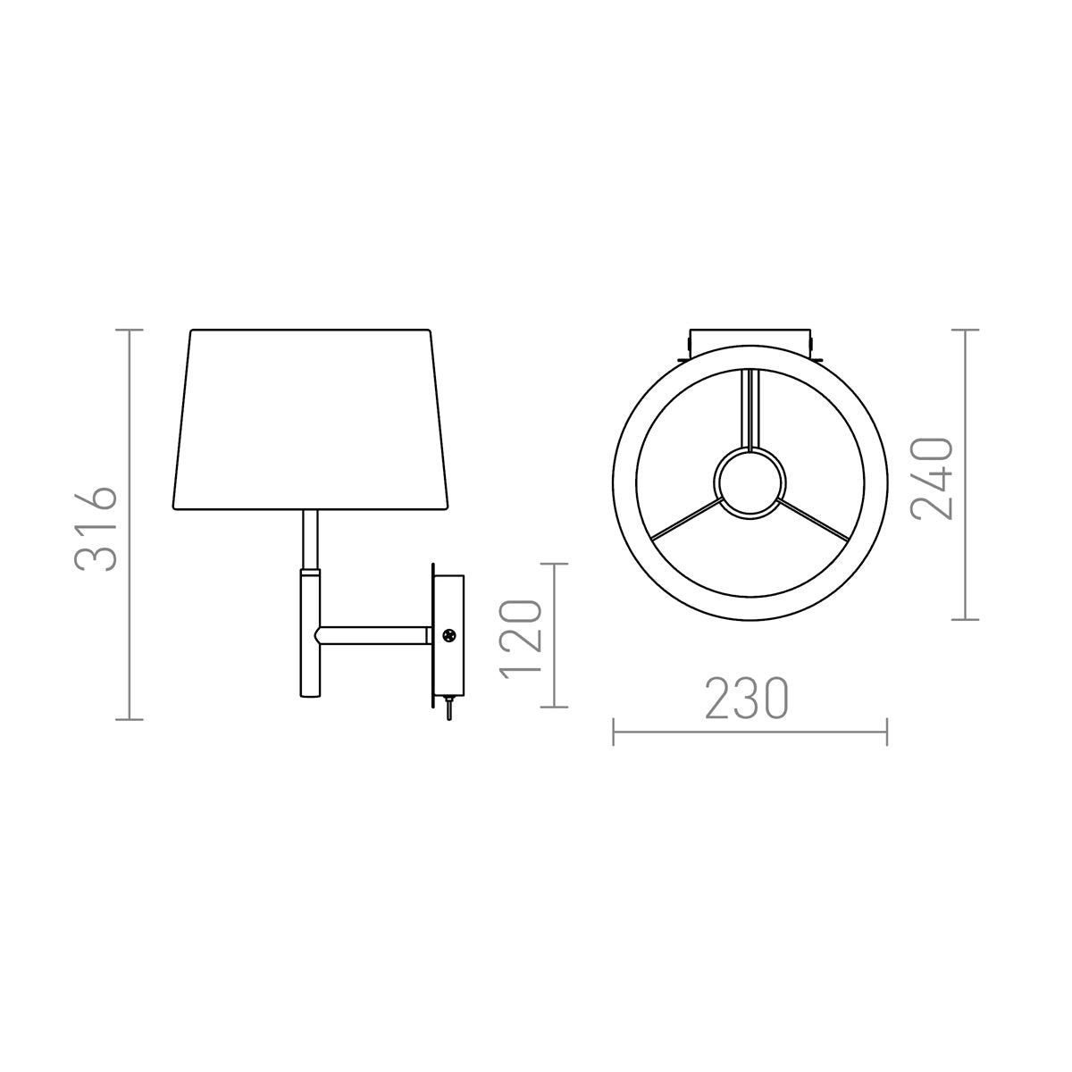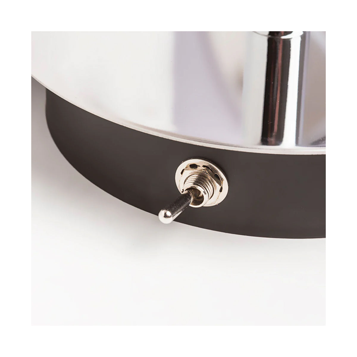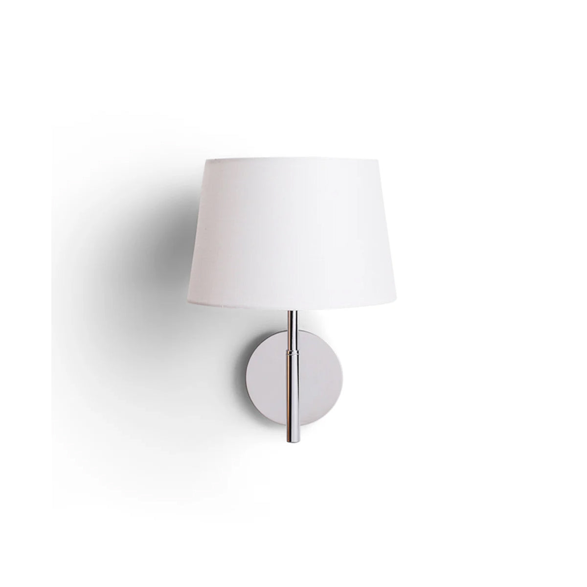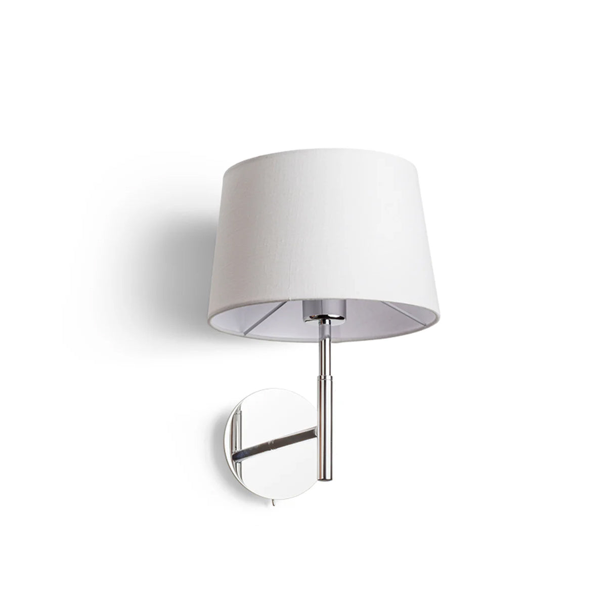 Corp de iluminat de perete cu comutator pe bază şi abajur textil alb structurat pe o bază metalică crom.