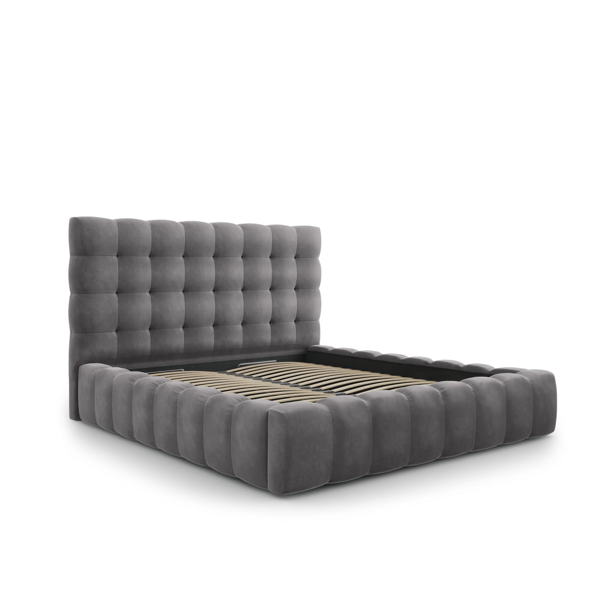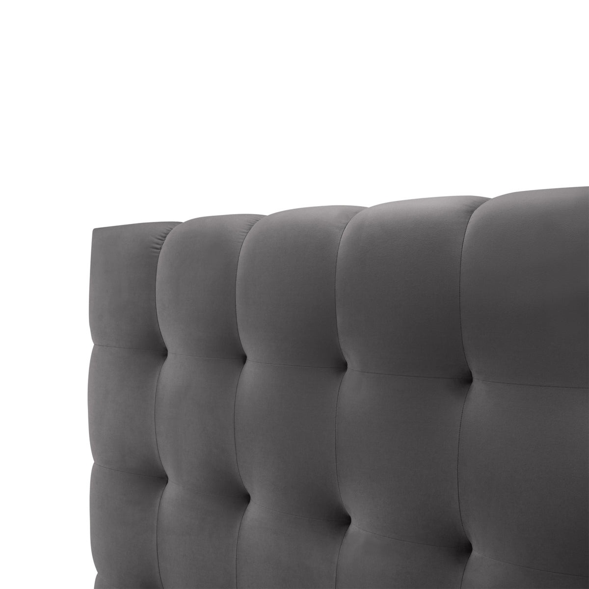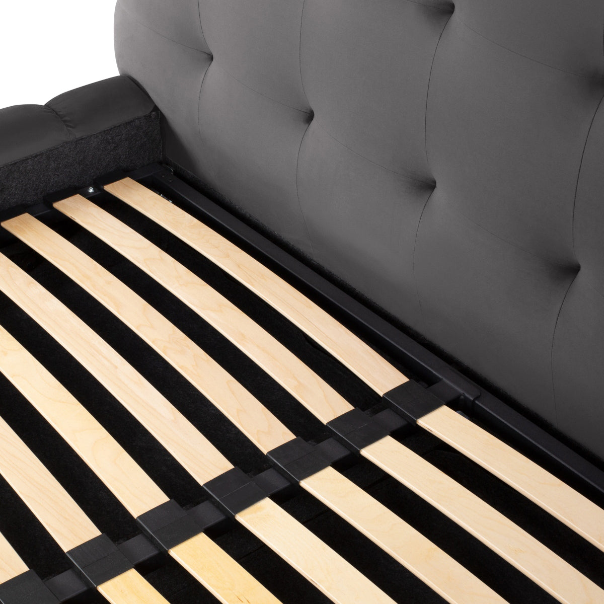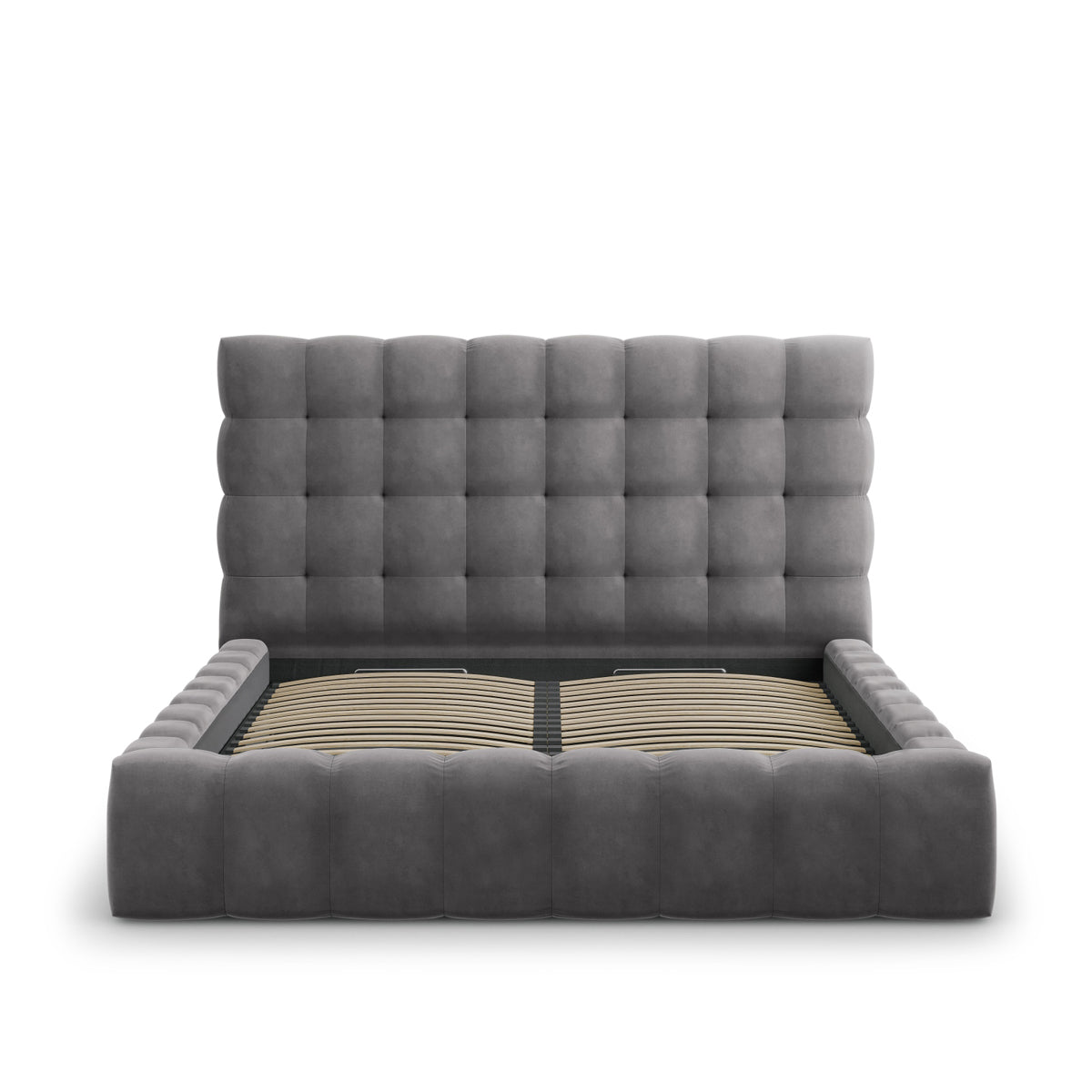Pat tapițat în catifea gri închis, cu tăblie și ladă de depozitare.