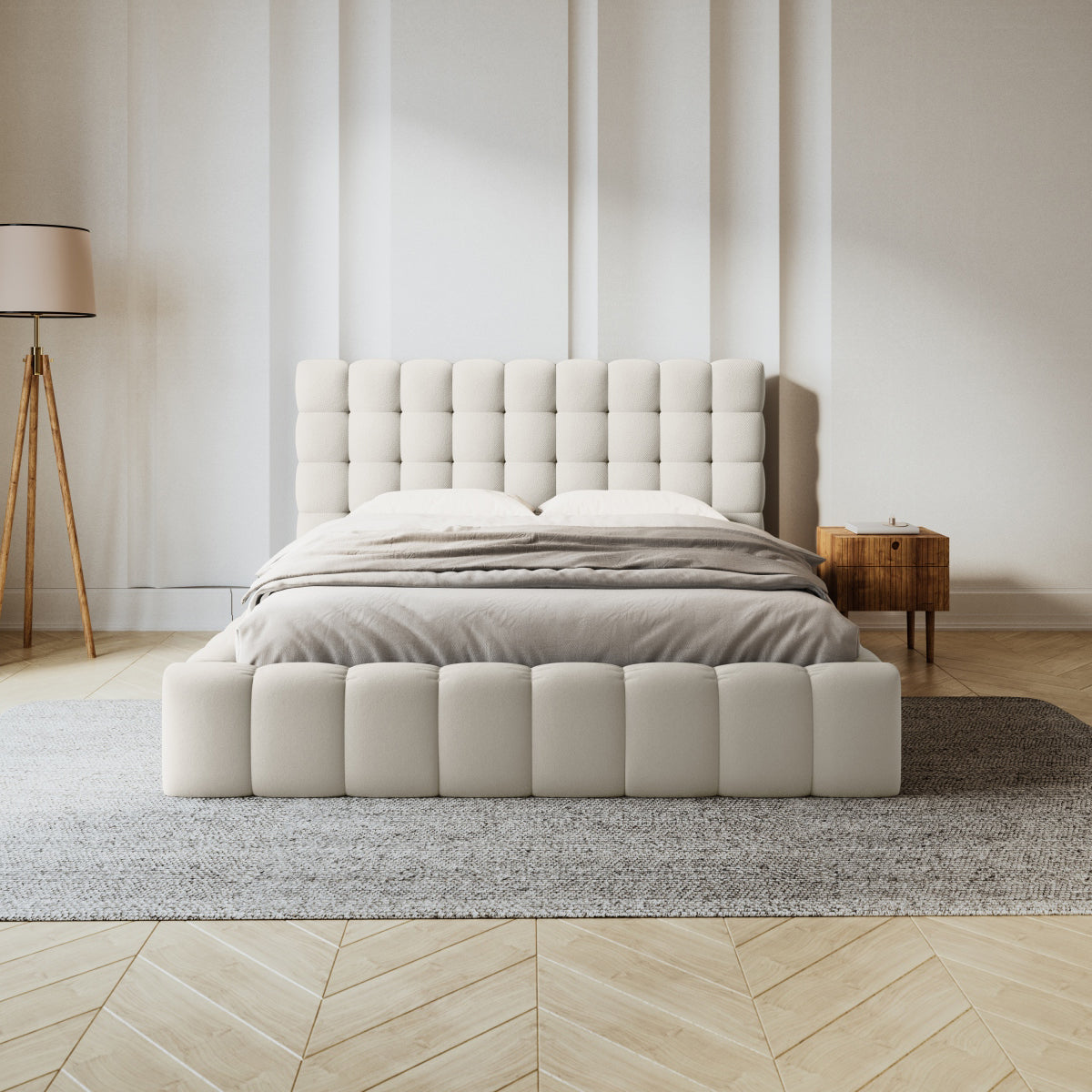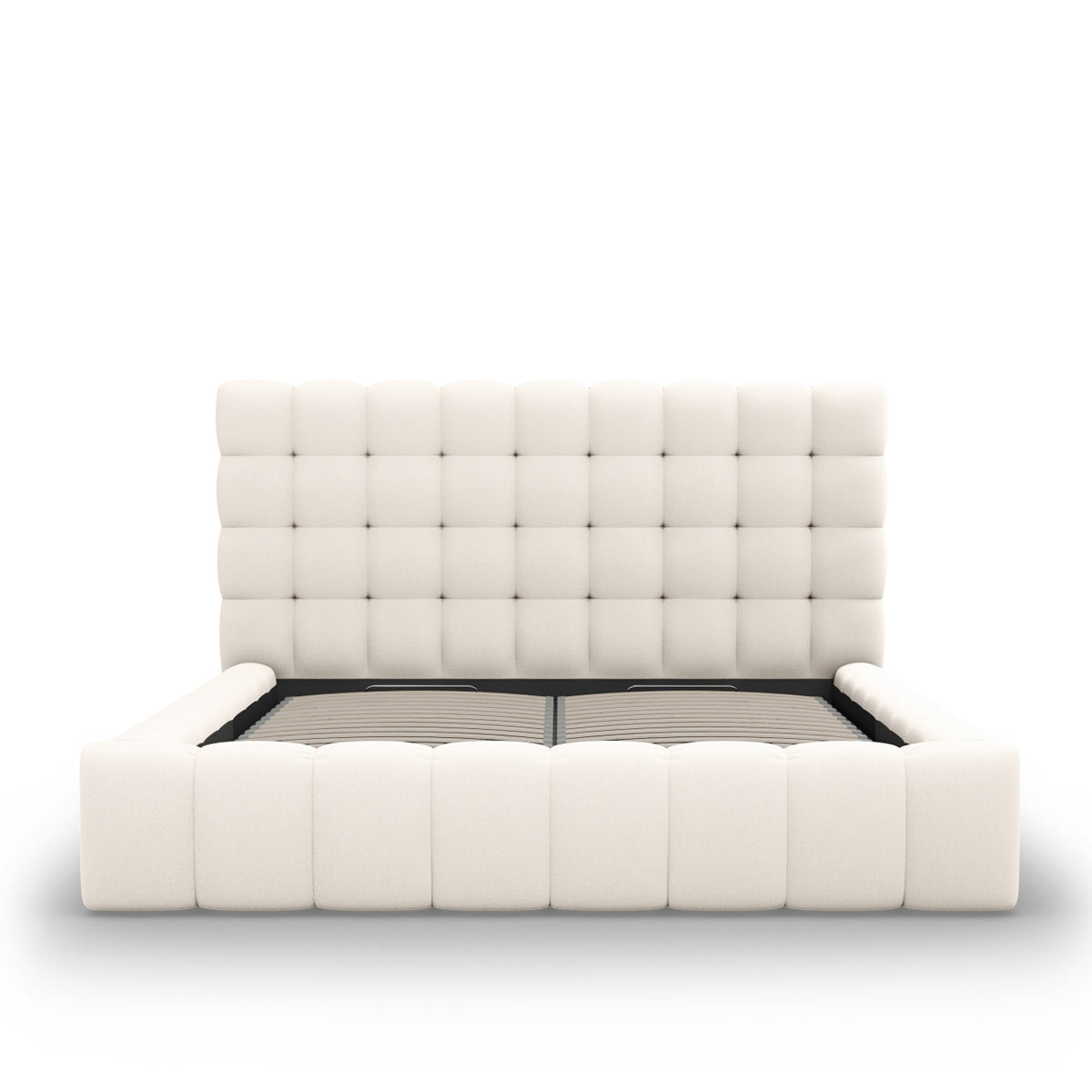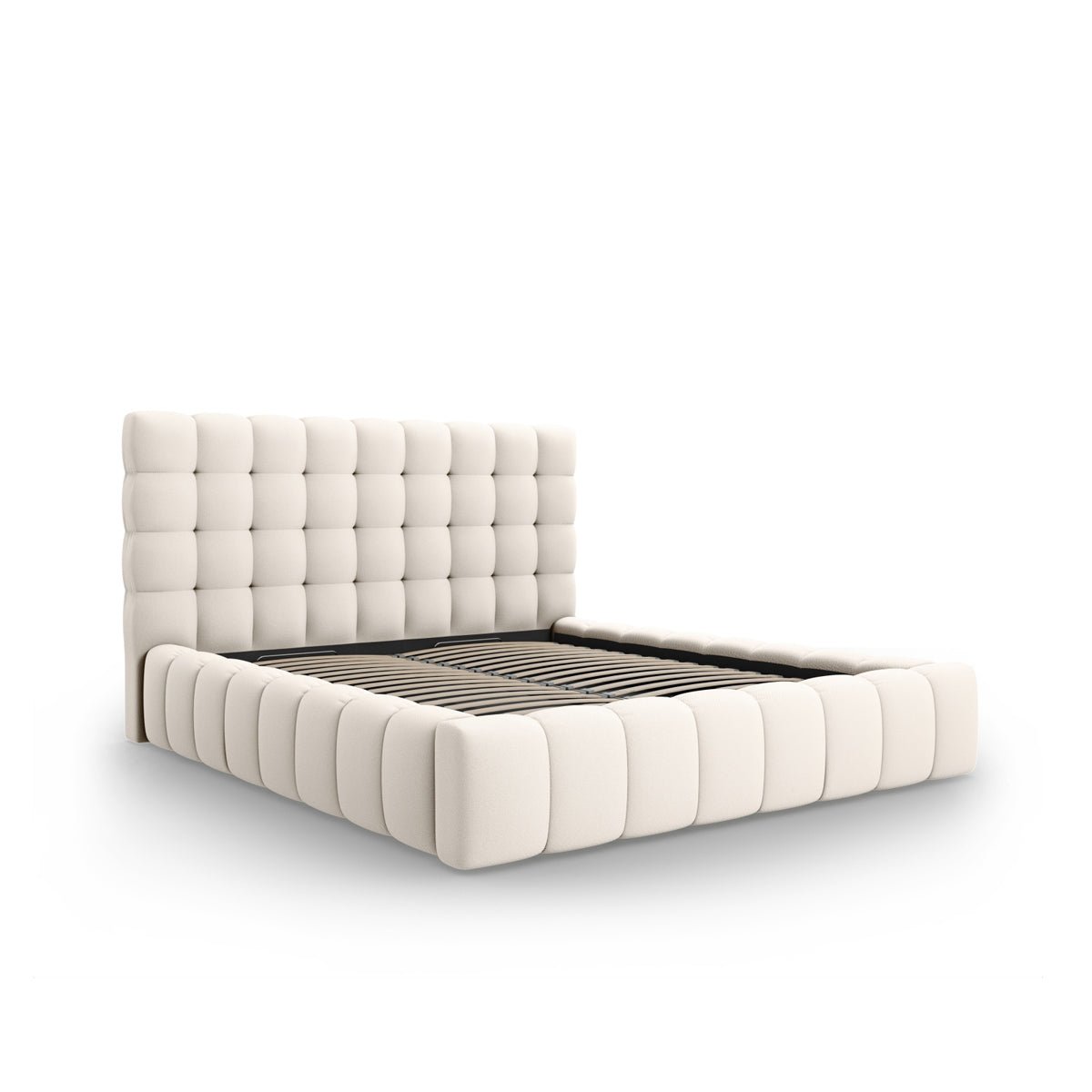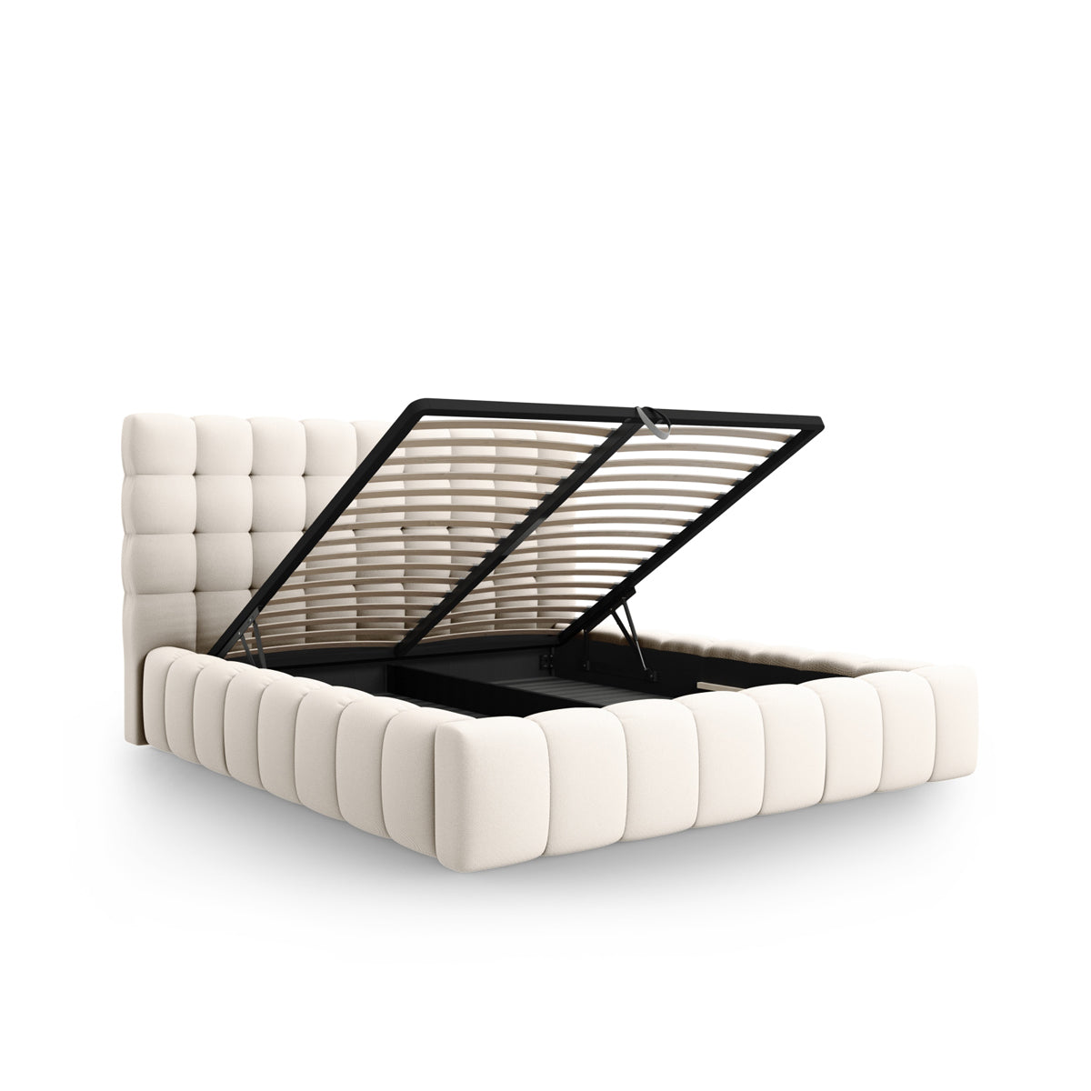 Pat tapițat în ţesatură structurată bej deschis, cu tăblie și ladă de depozitare.