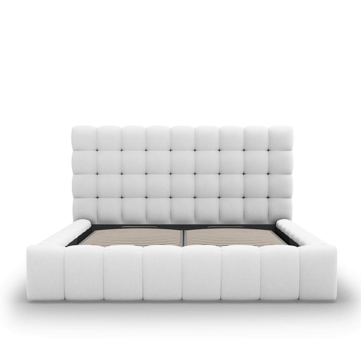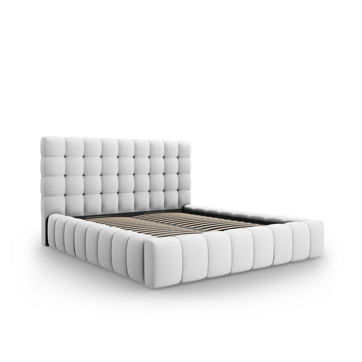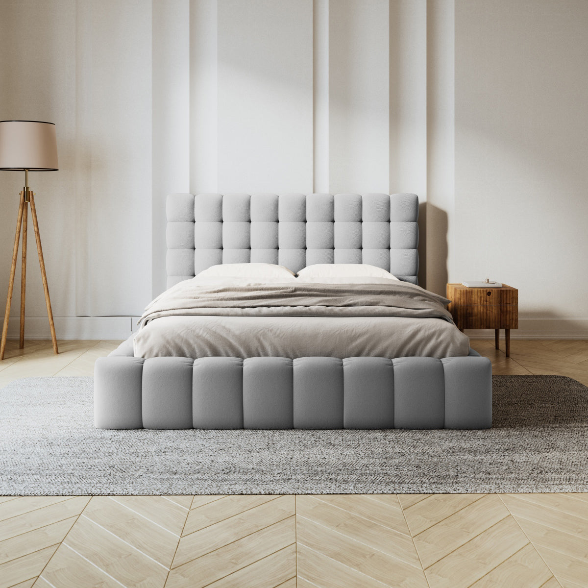Pat tapițat în ţesatură structurată gri deschis, cu tăblie și ladă de depozitare.