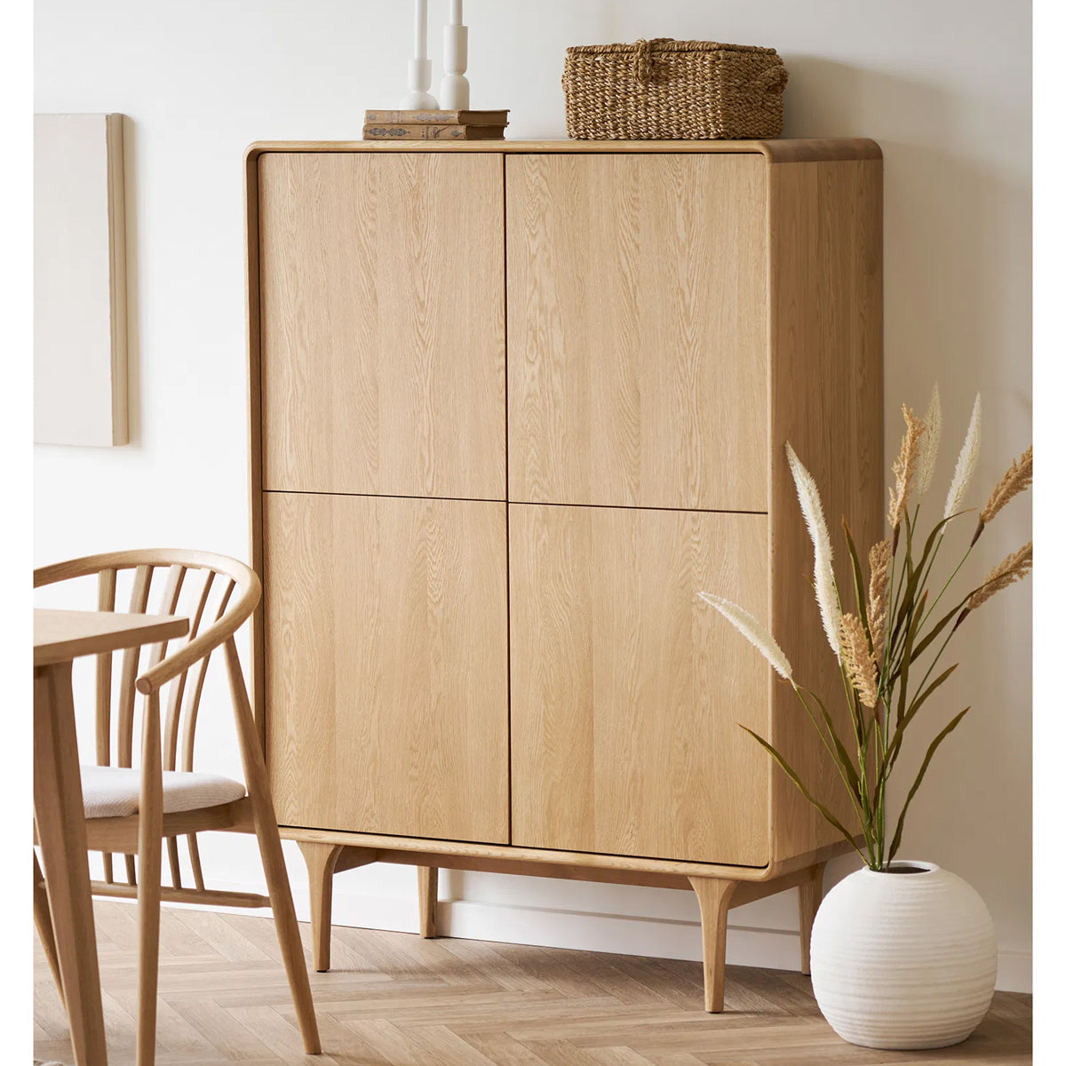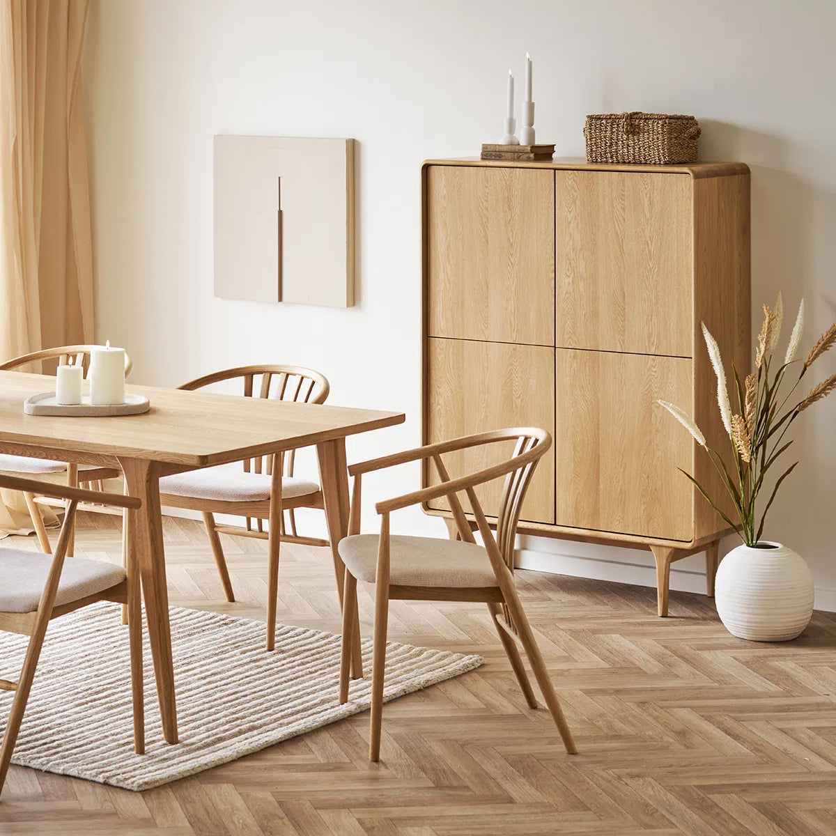 Realizat din stejar masiv și MDF furniruit cu stejar, aduce un aer cald și elegant în living sau dining.