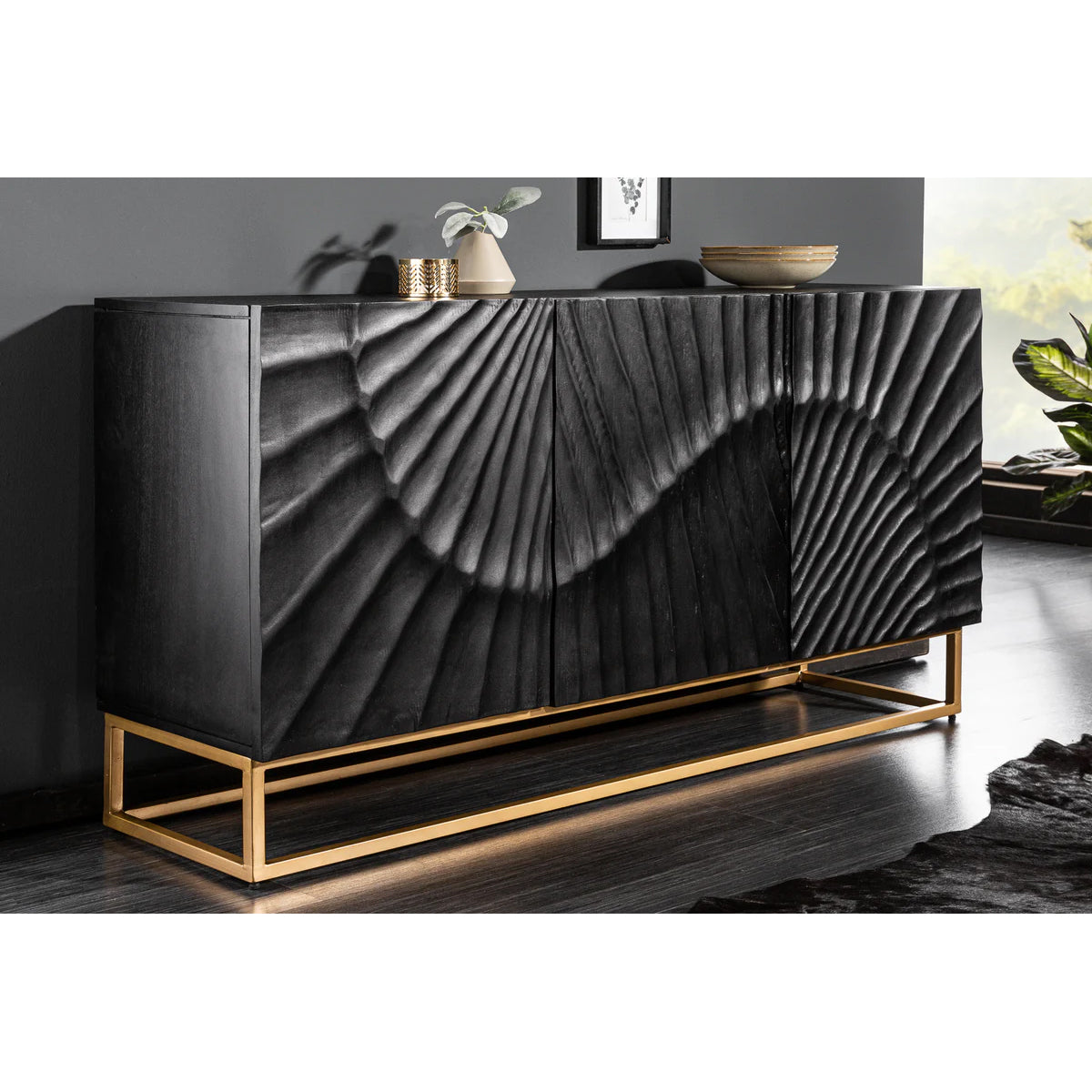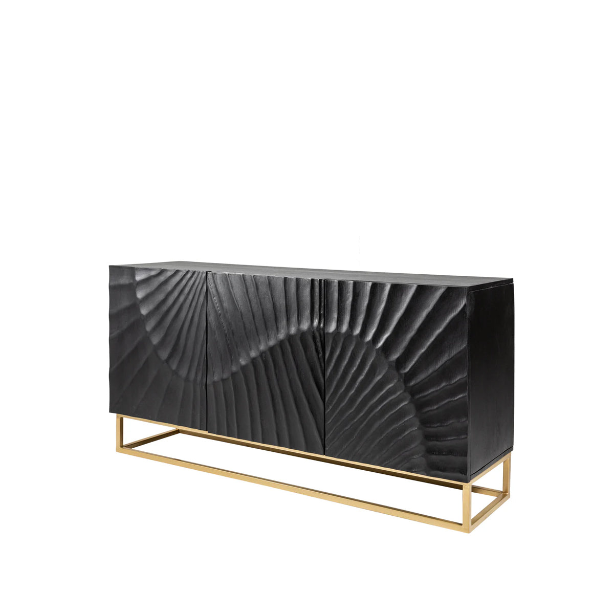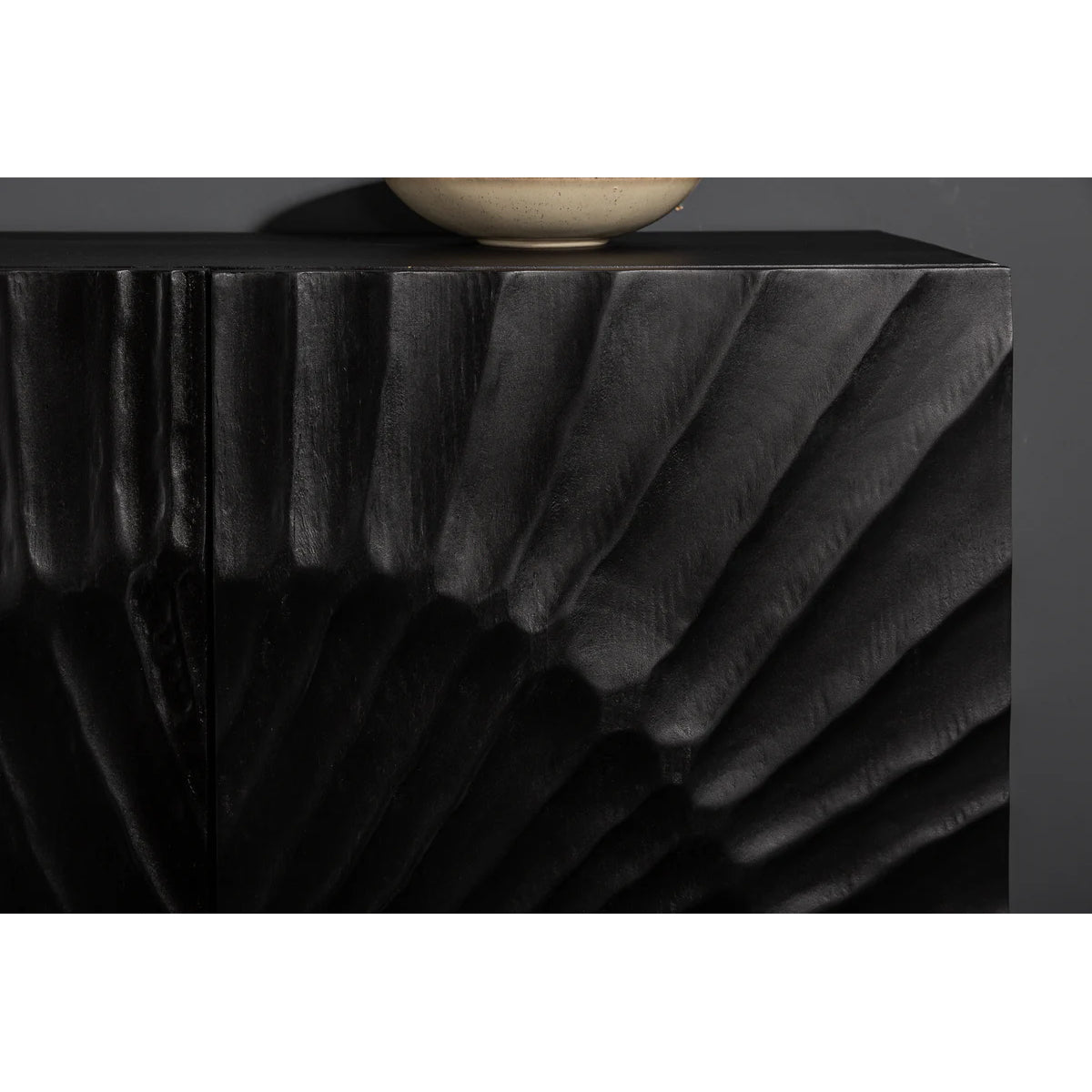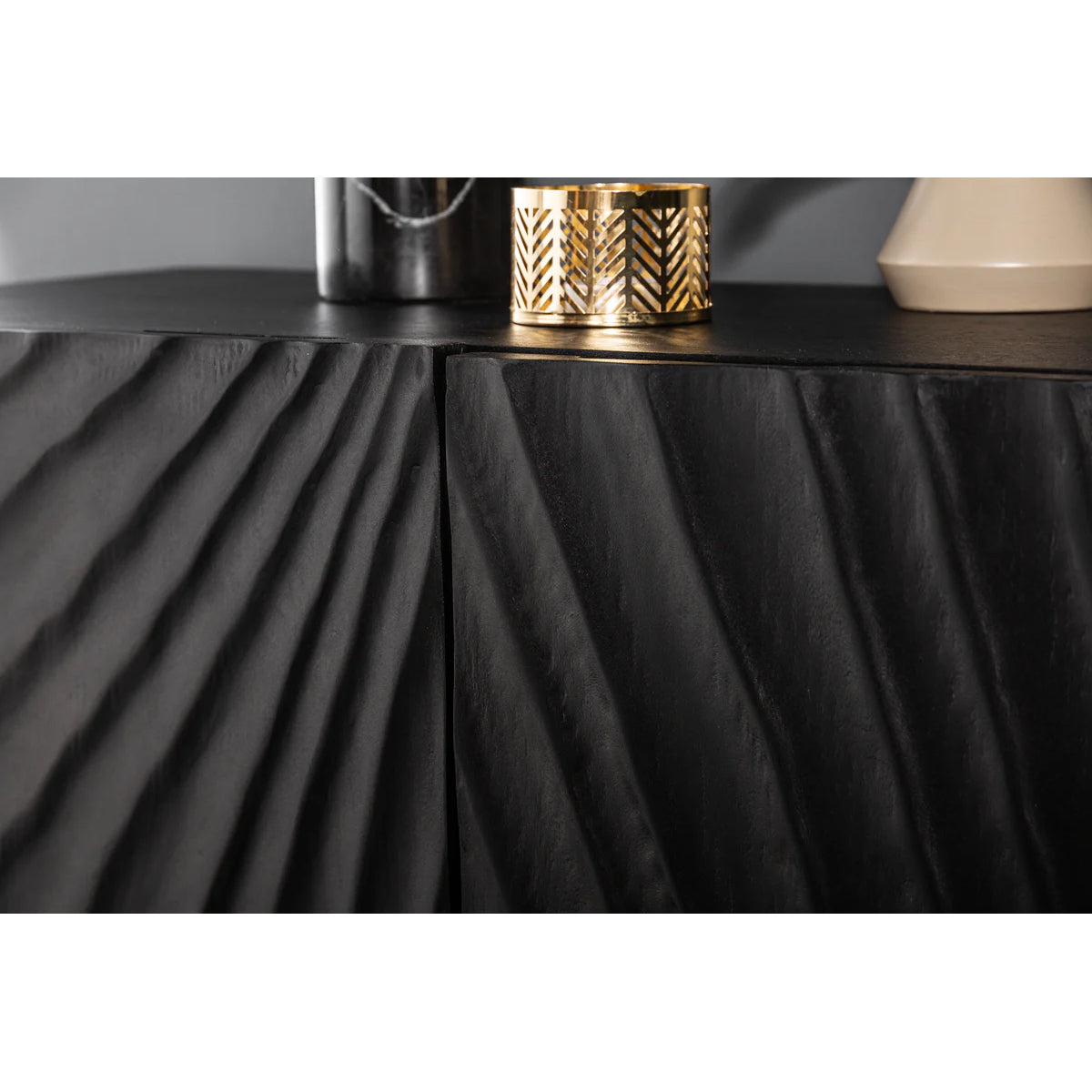 Cu o prezență mai compactă, dar la fel de sculpturală, bufetul DUNE în versiunea cu 3 uși se remarcă prin textura sa vibrantă și finisajul profund al lemnului de mango.