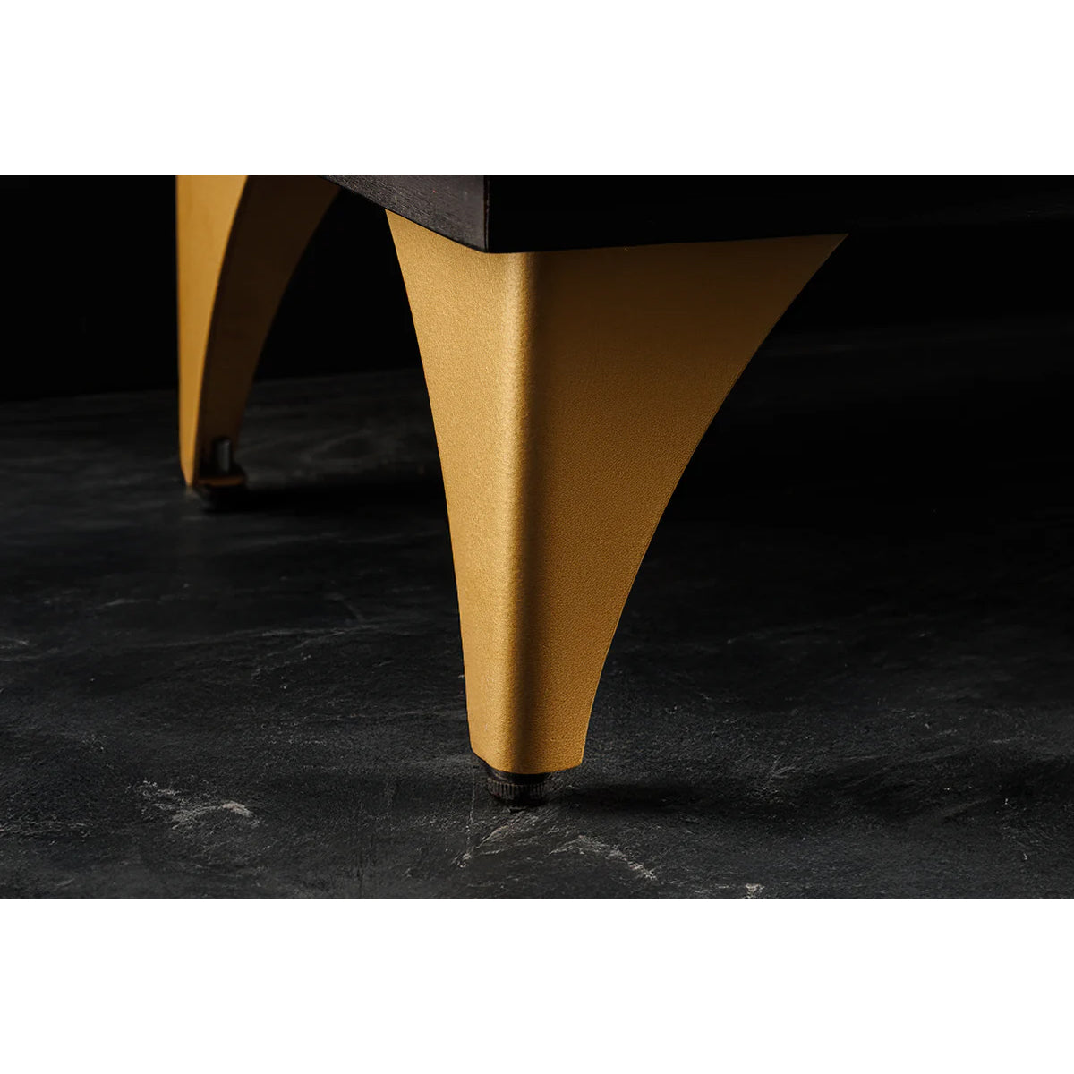 Picioarele elegante din metal auriu îl ridică vizual, oferindu-i grație și aer, iar combinația de negru intens și aur cald creează o prezență scenografică.