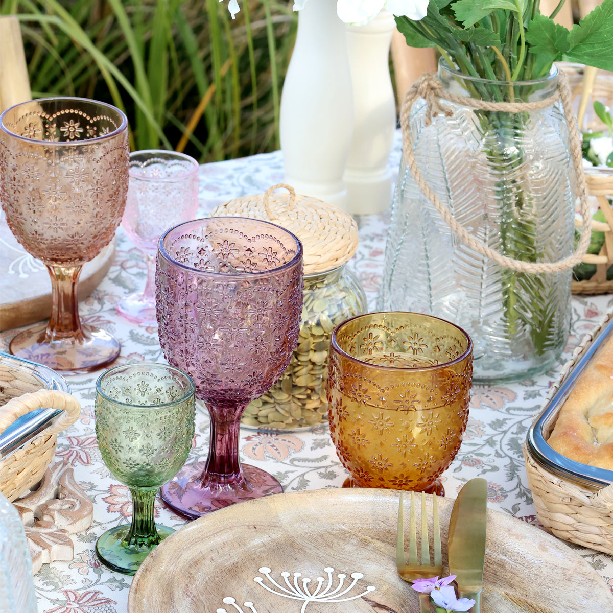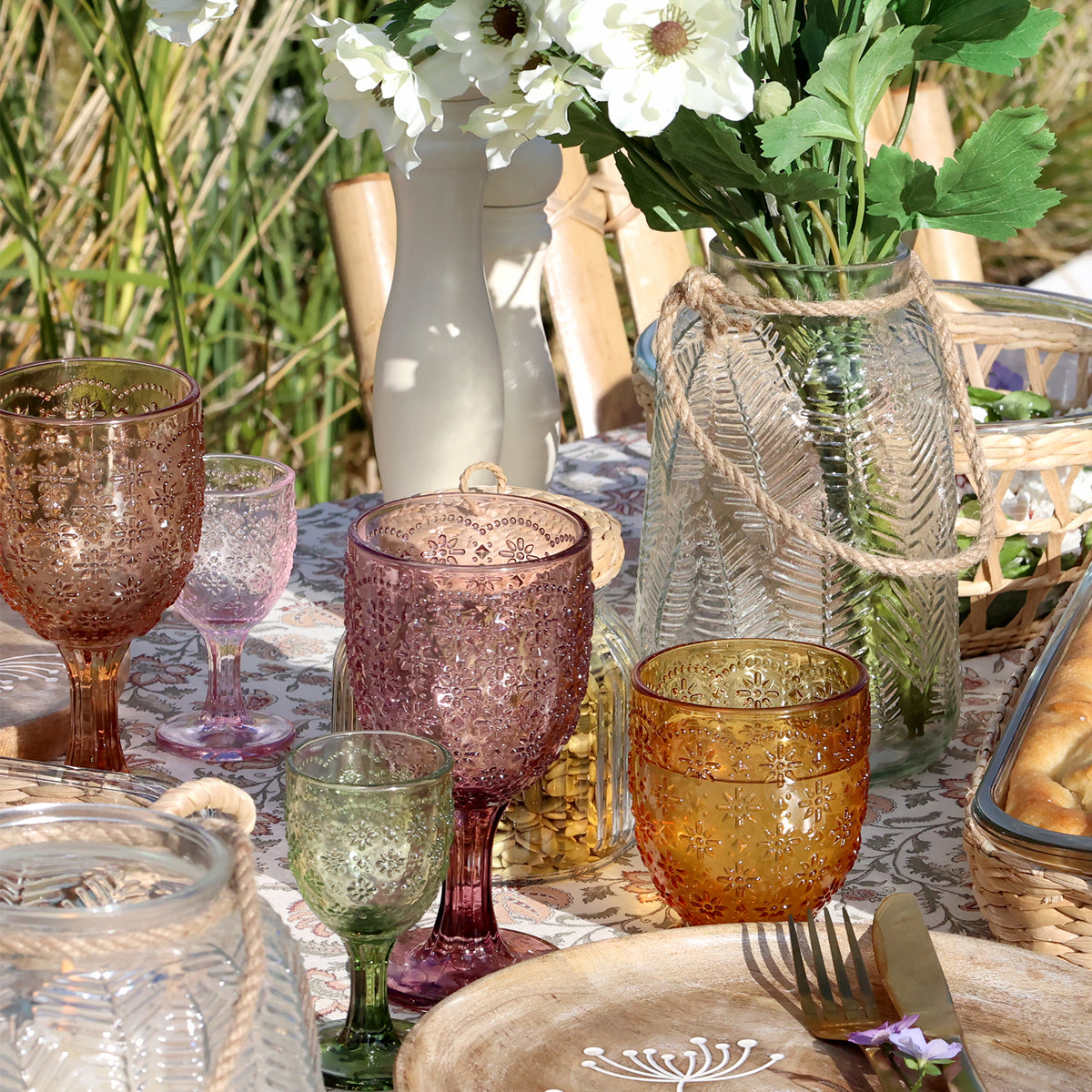 Set de 6 pahare pentru vin din sticlă colorată, cu decor în relief, stil vintage/boho.