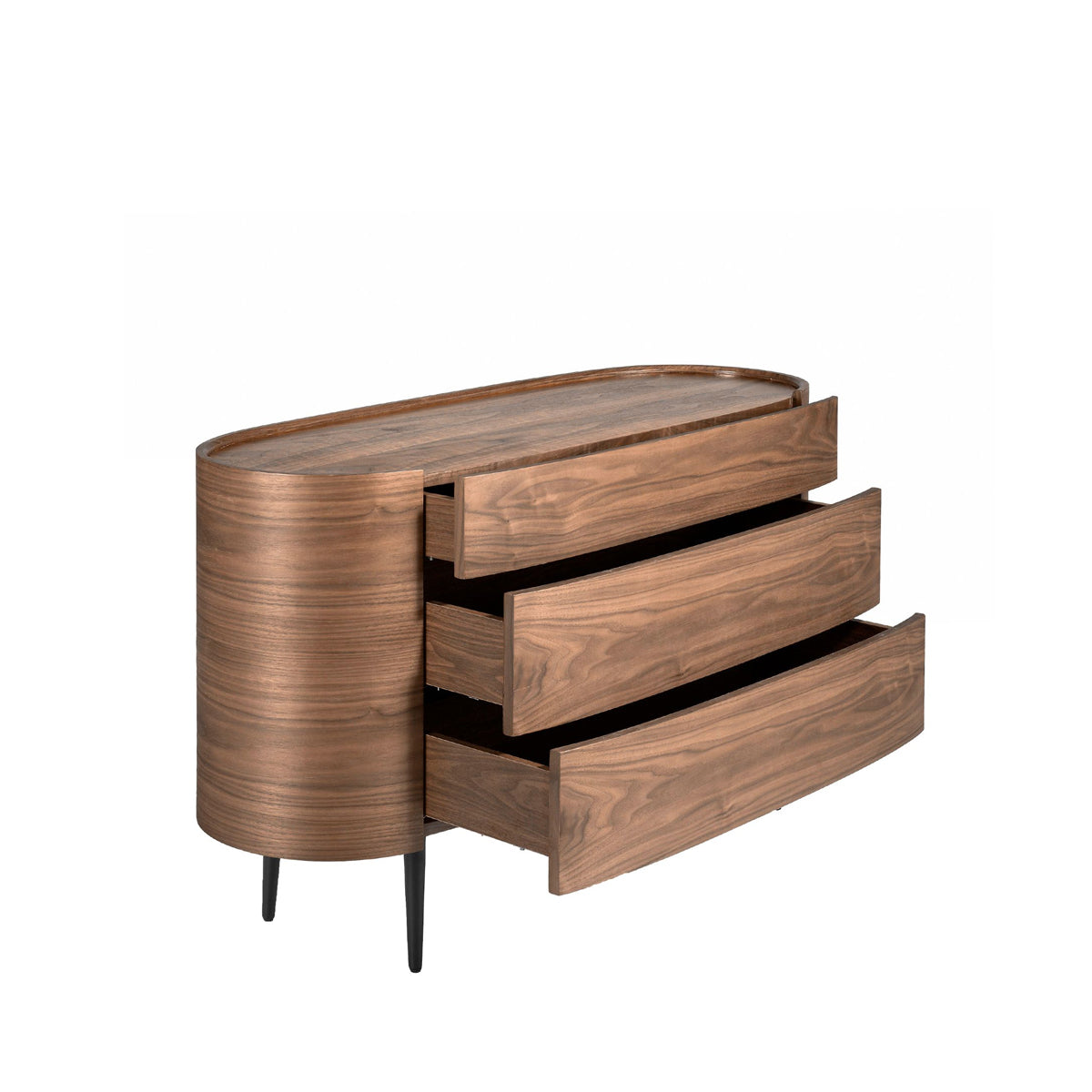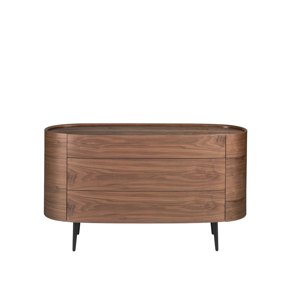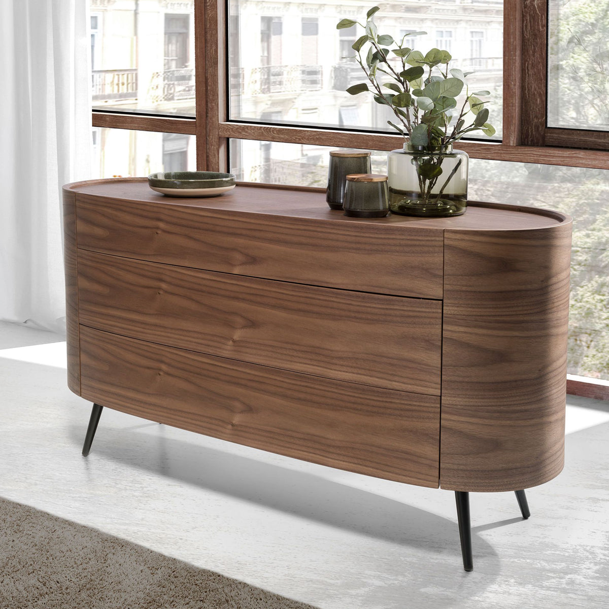 Comodă cu design modern, cu structură din lemn furniruită cu nuc natural și picioare din oțel inoxidabil negru.