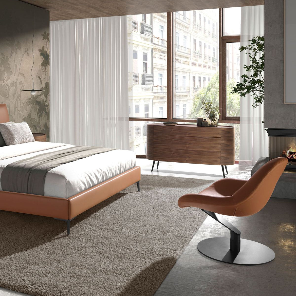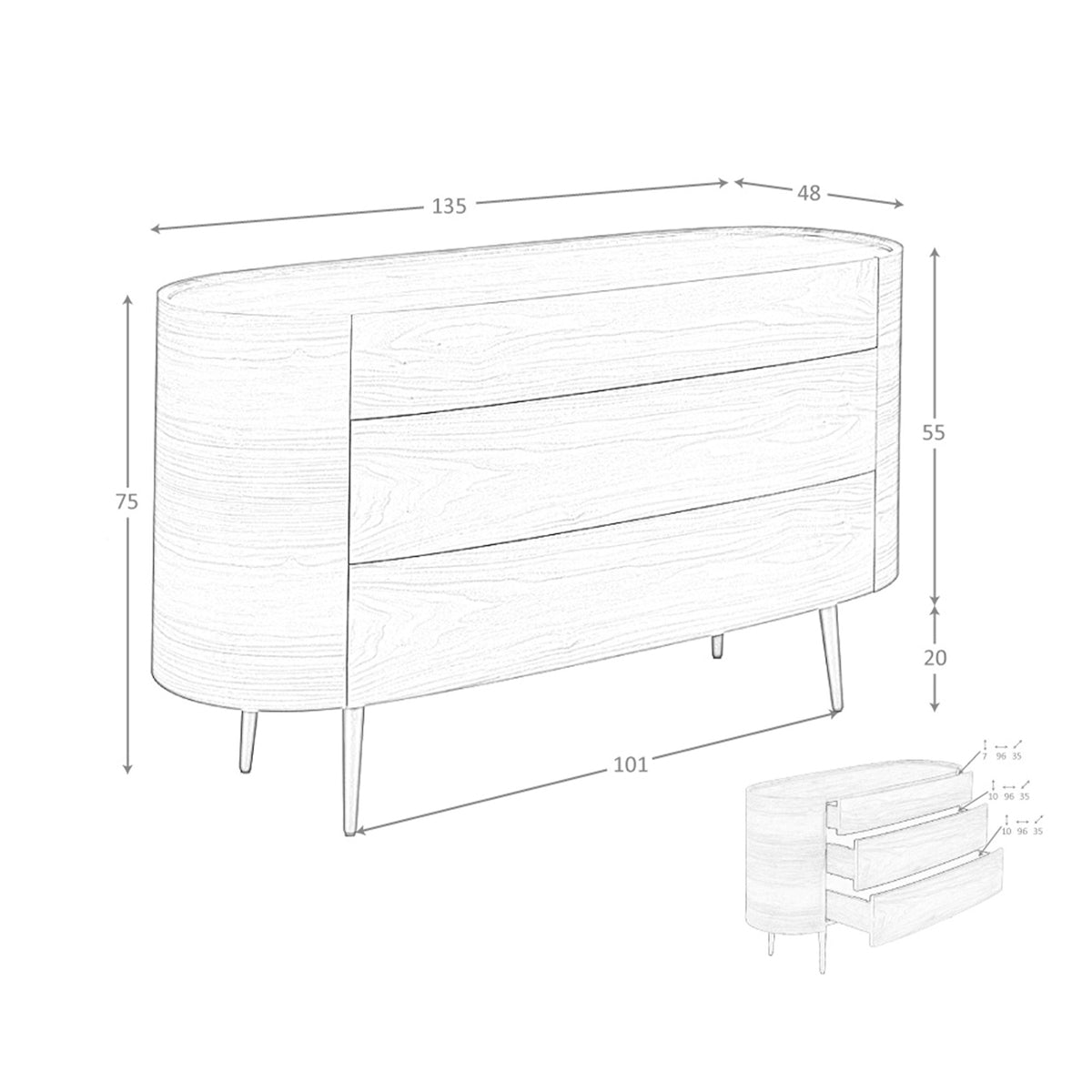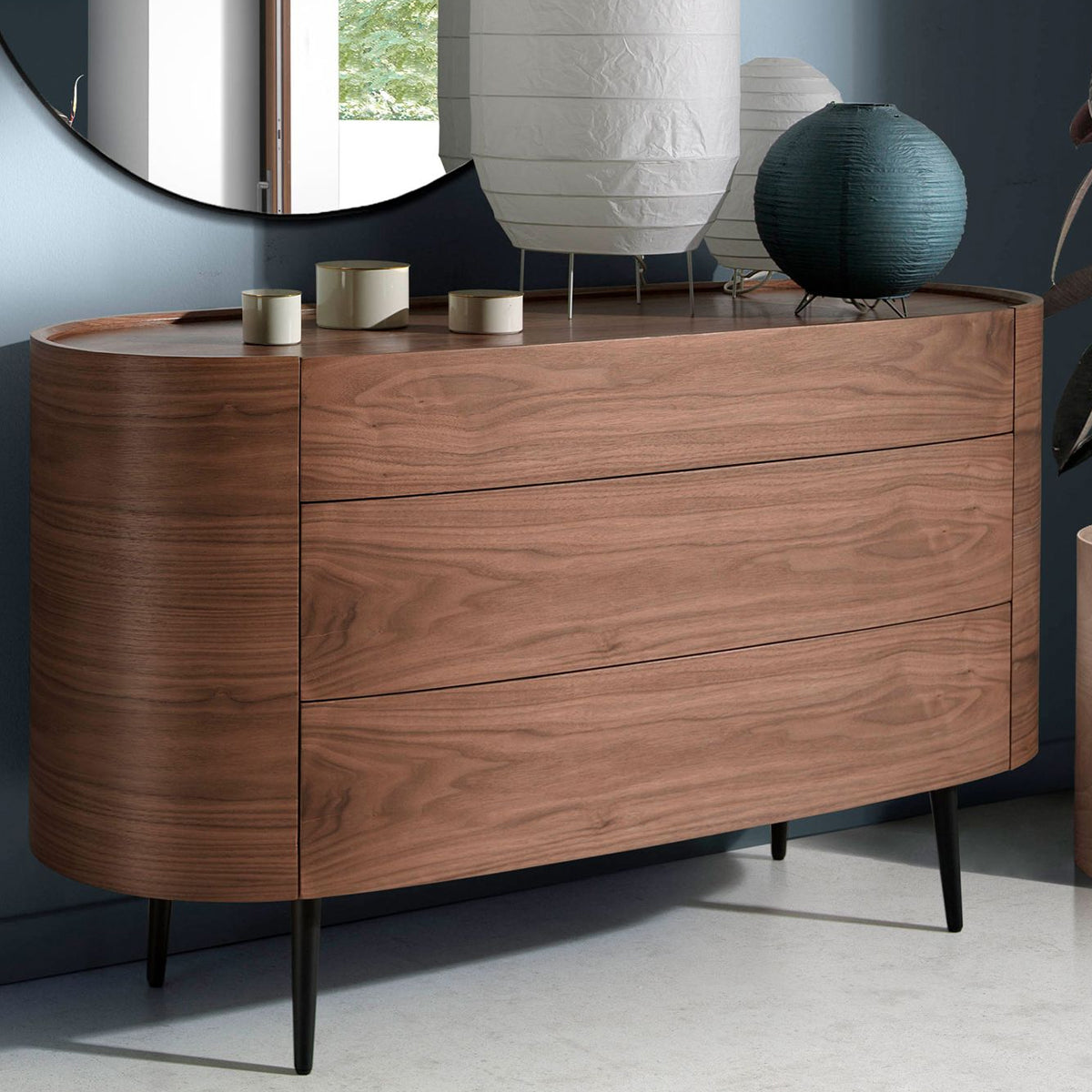 Comodă cu design modern, cu structură din lemn furniruită cu nuc natural și picioare din oțel inoxidabil negru.