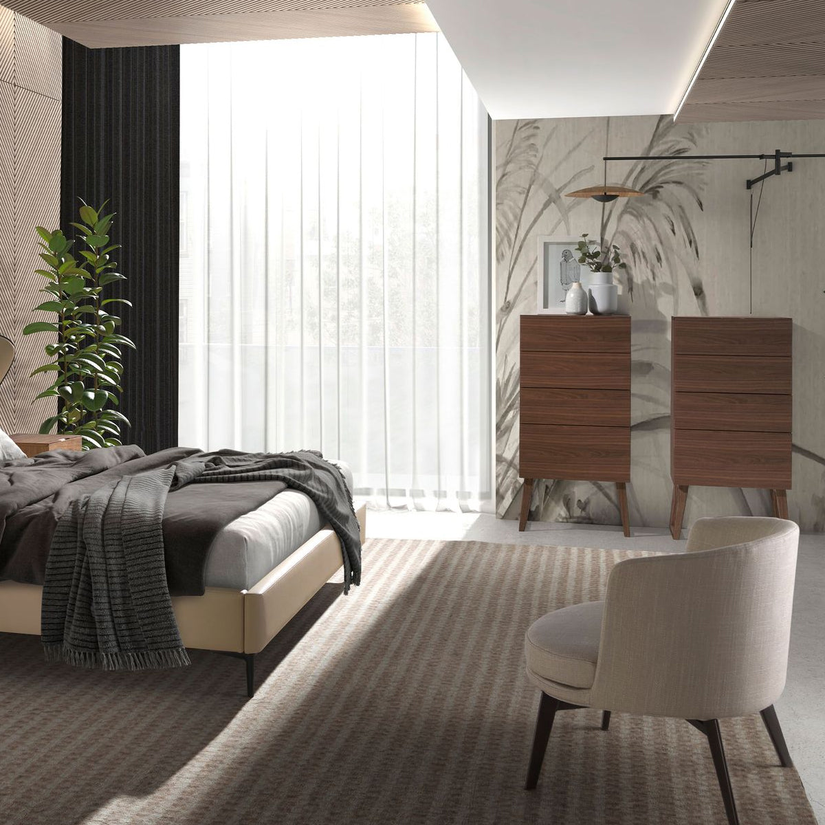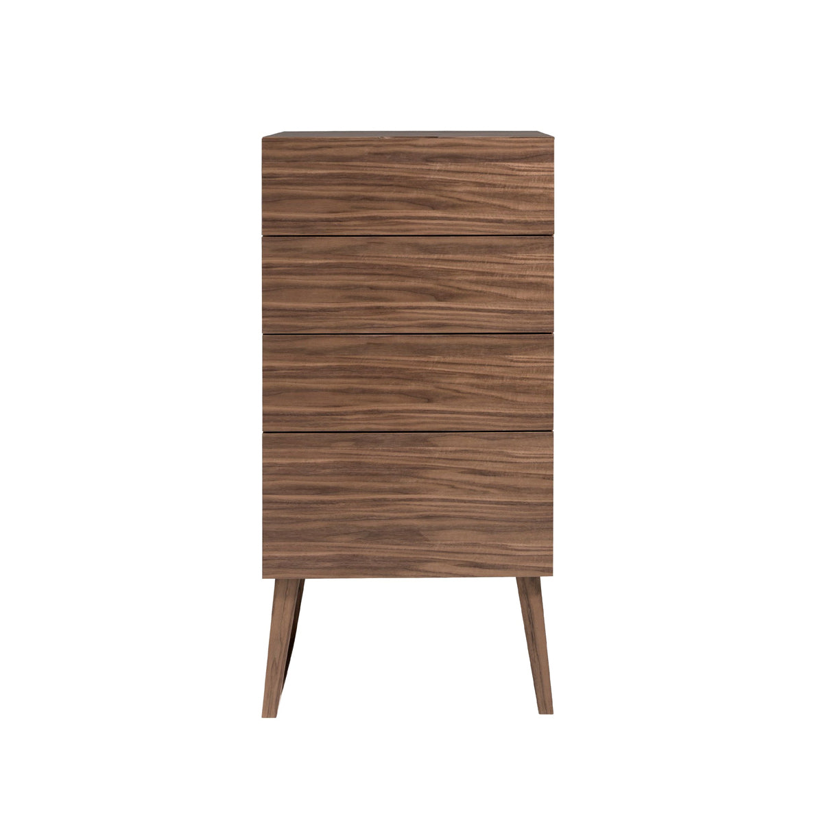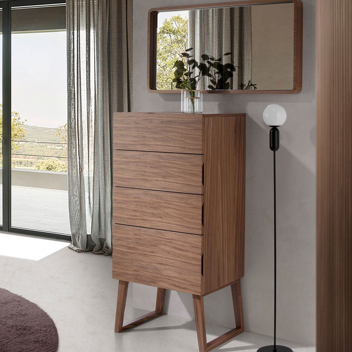 Comodă cu design modern, cu structură din lemn furniruit cu nuc natural și picioare din lemn furniruite cu nuc natural.