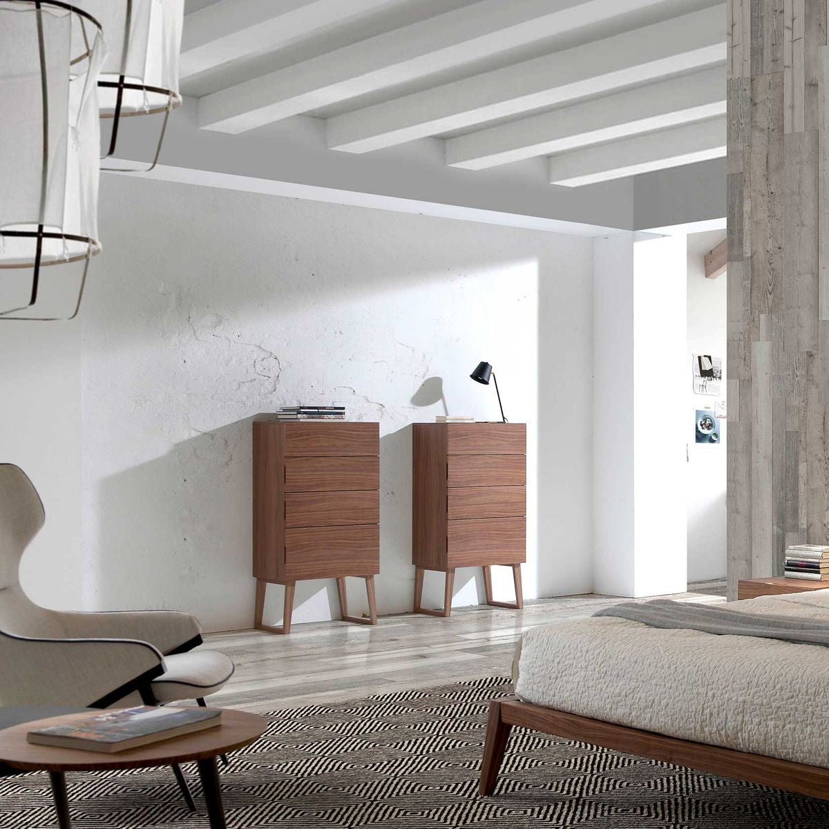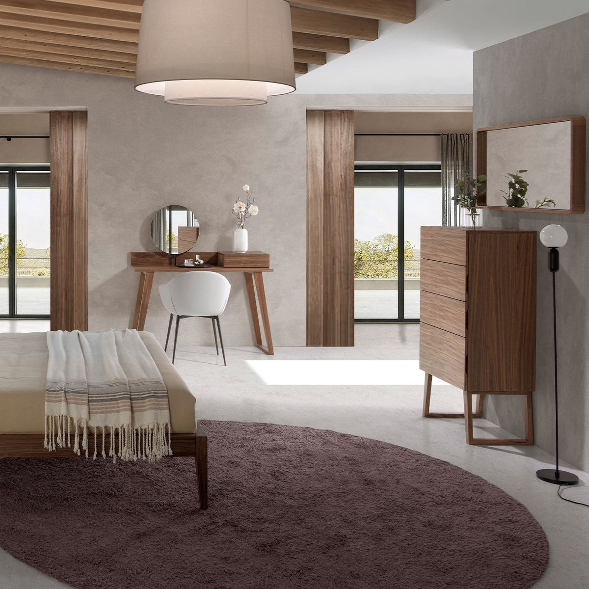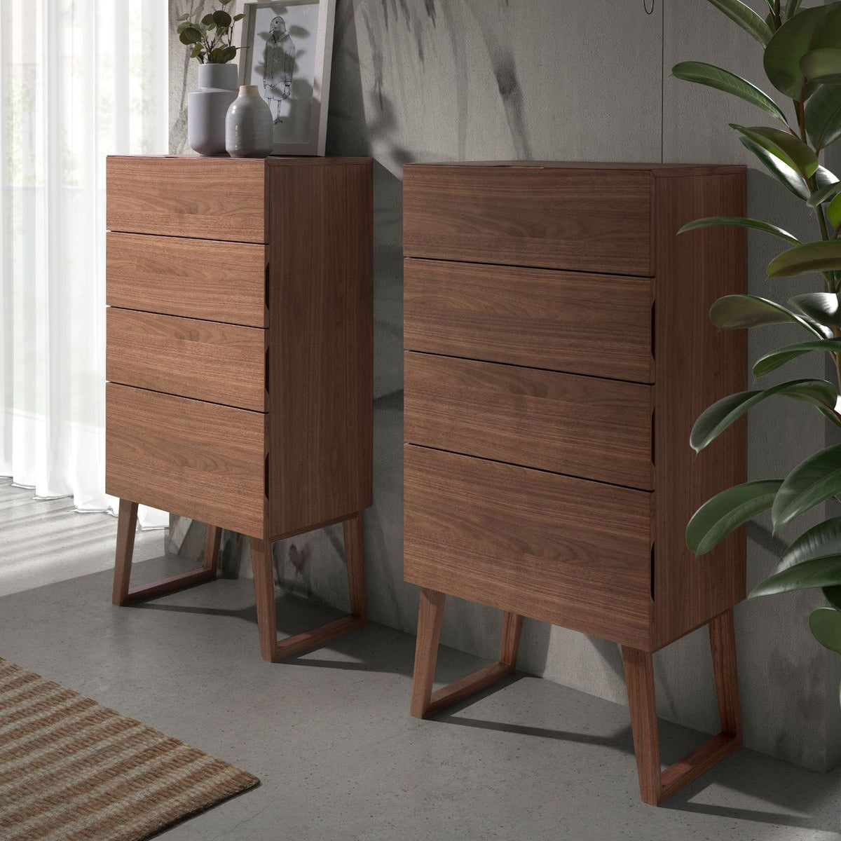 Comodă cu design modern, cu structură din lemn furniruit cu nuc natural și picioare din lemn furniruite cu nuc natural.