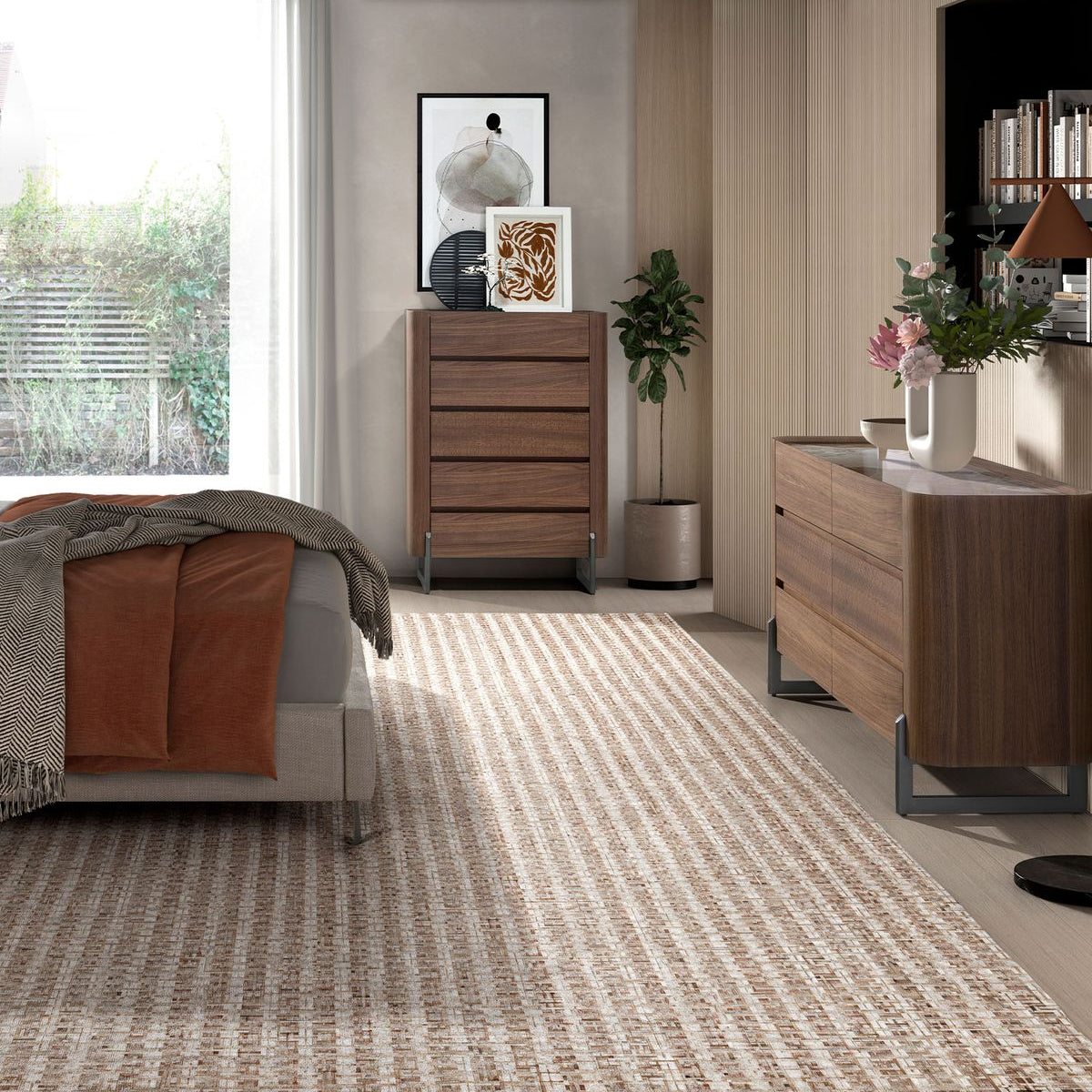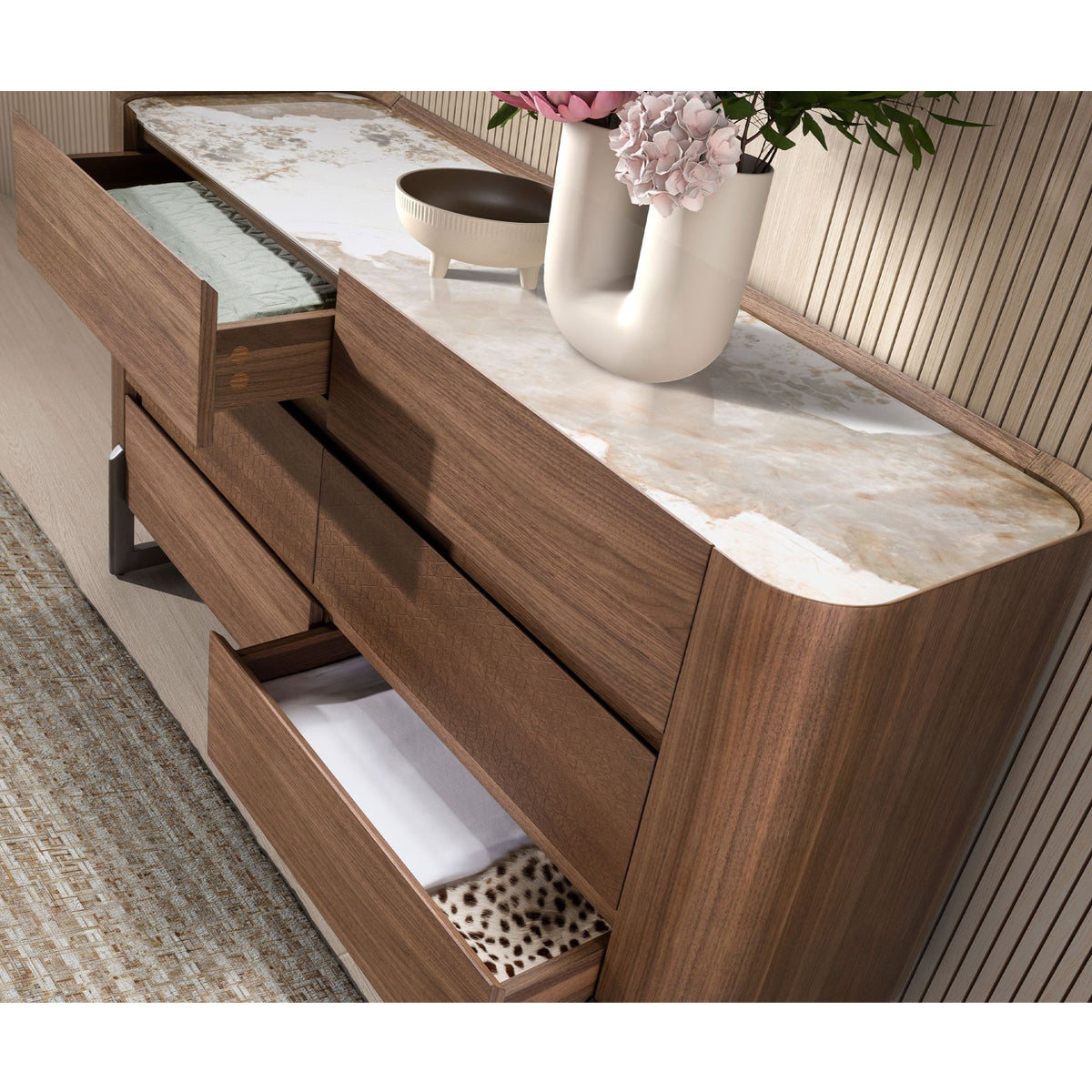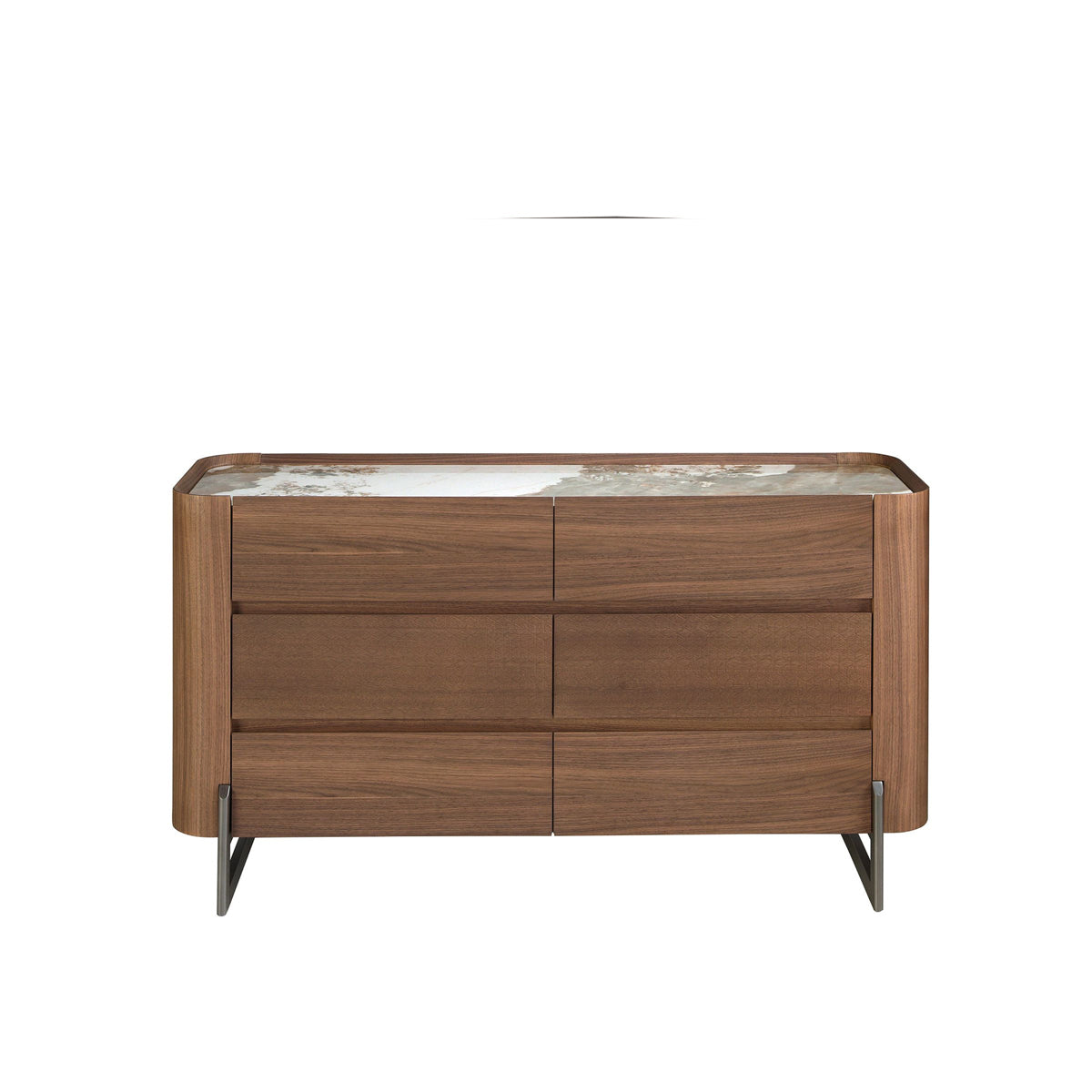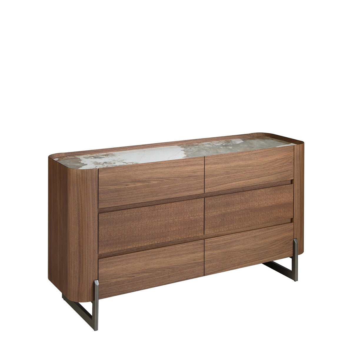 Comodă cu design modern, cu structură din lemn furniruită cu nuc natural, blat din marmură porțelanată albă cu nervuri gri și maro și picioare din oțel inoxidabil gri închis metalizat.