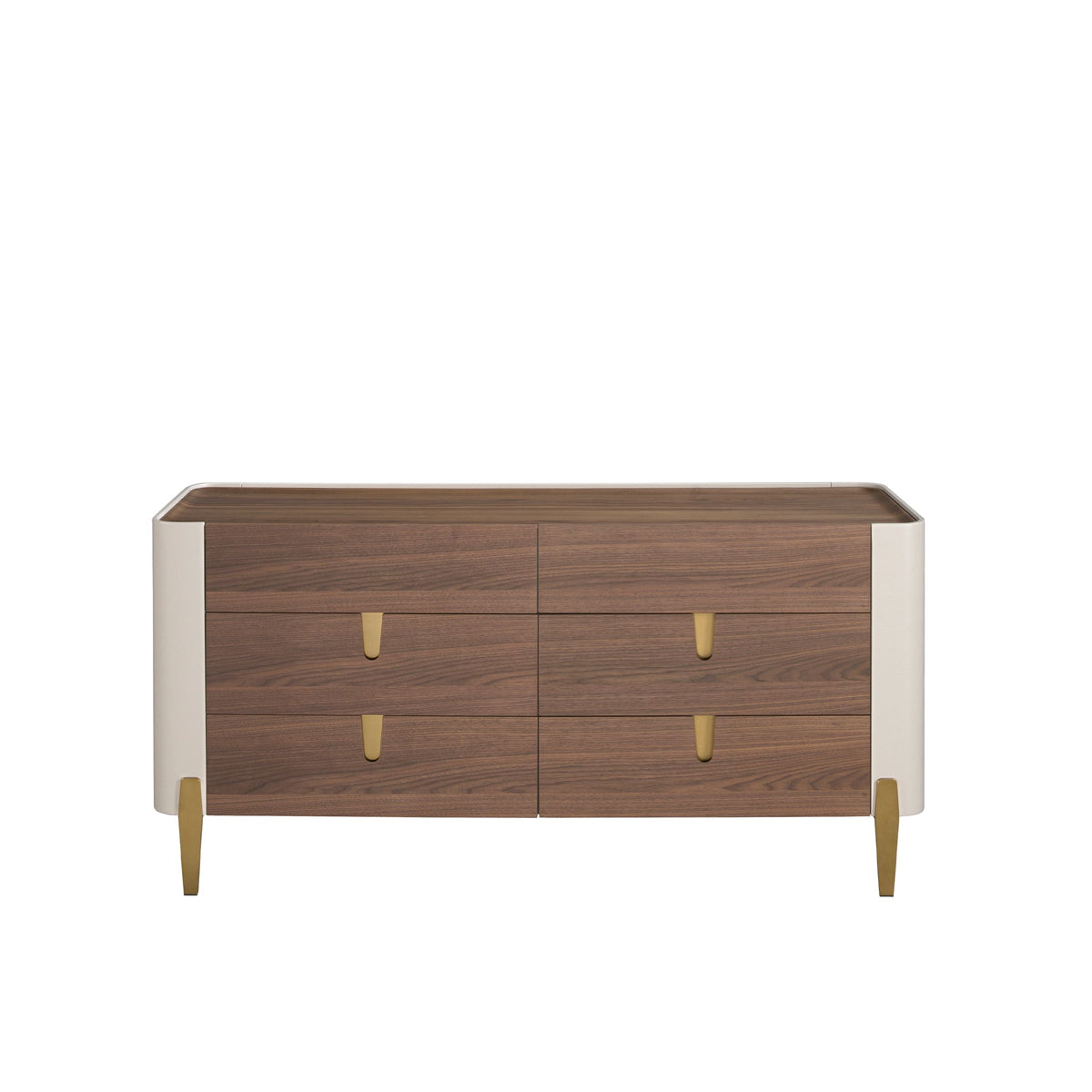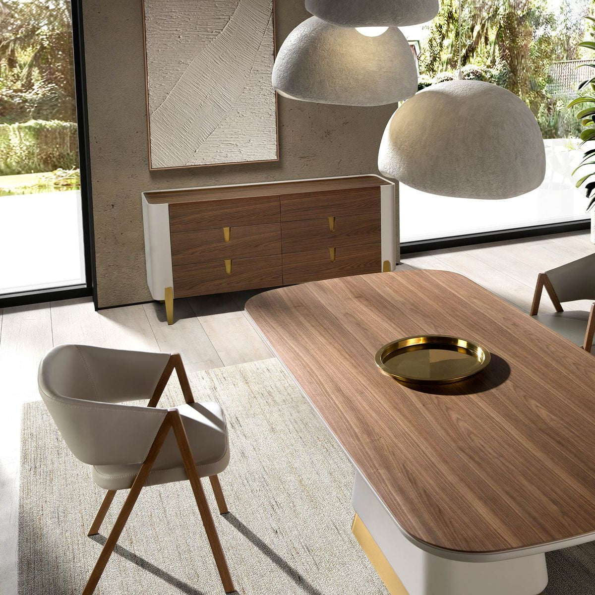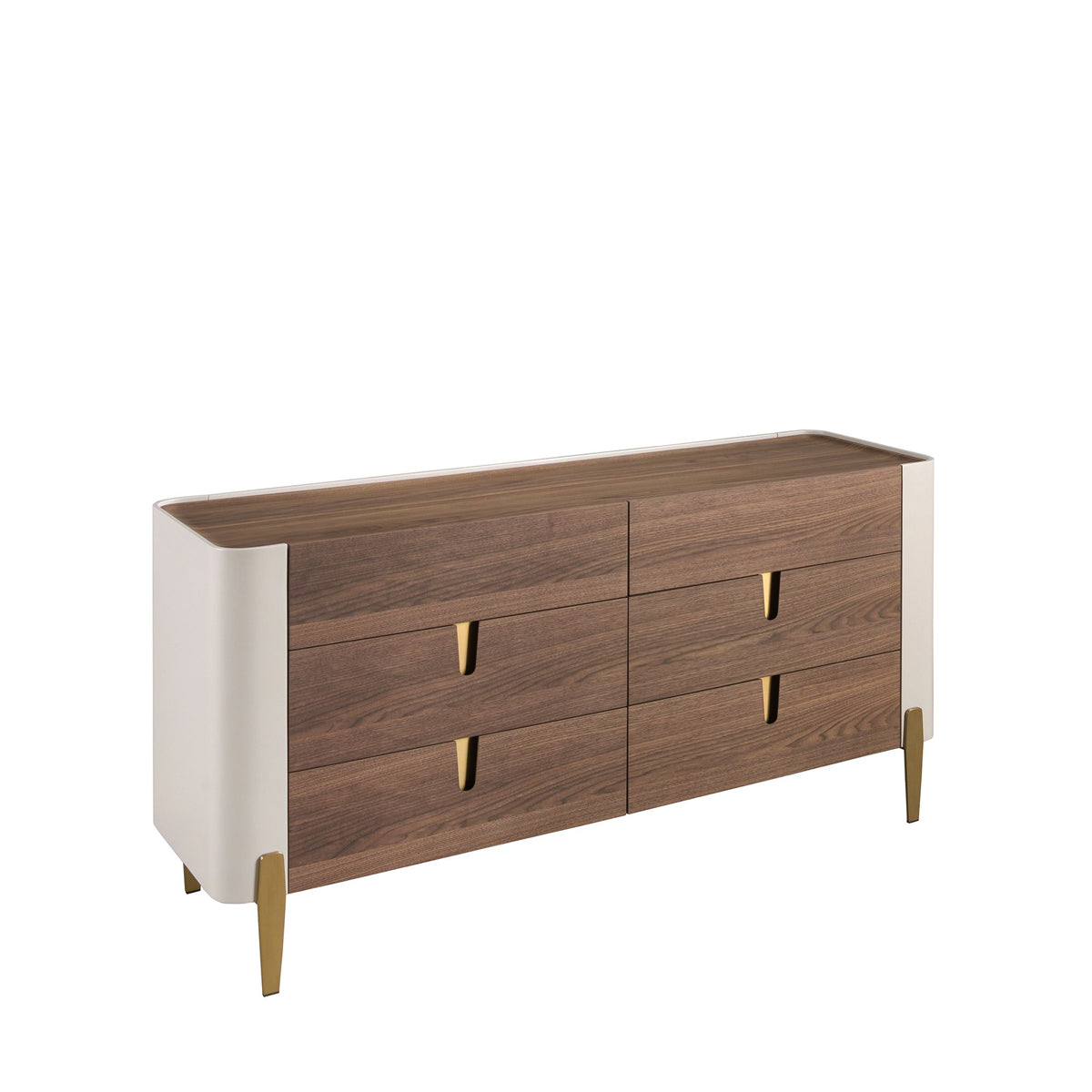 Comodă cu design modern, cu structură din lemn furniruit de nuc natural și lemn MDF lăcuit bej, și picioare originale din oțel inoxidabil lustruit, de culoare aurie.