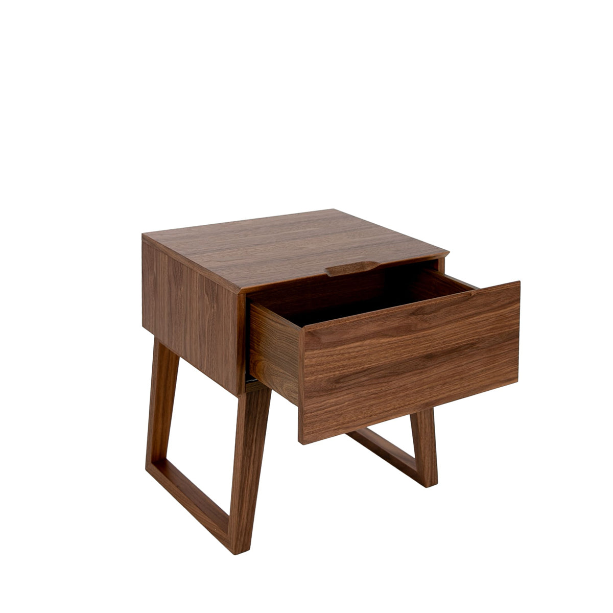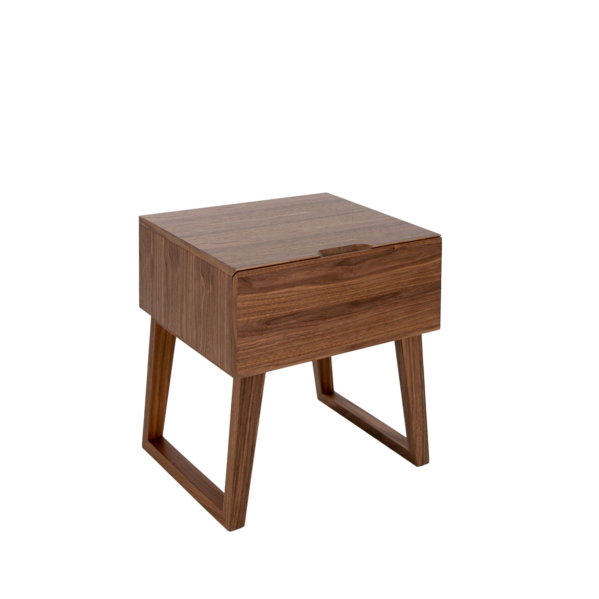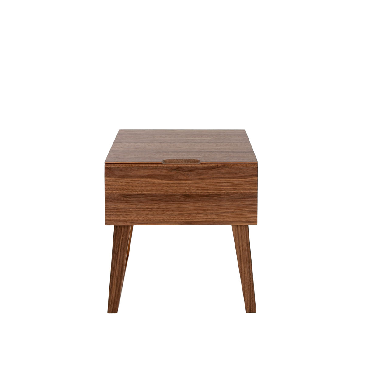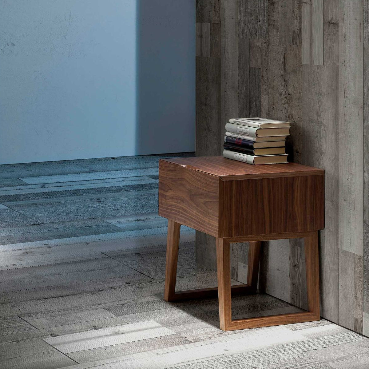 Noptieră cu design modern, cu structură din lemn furniruit cu nuc natural și picioare din lemn furniruite cu nuc natural.