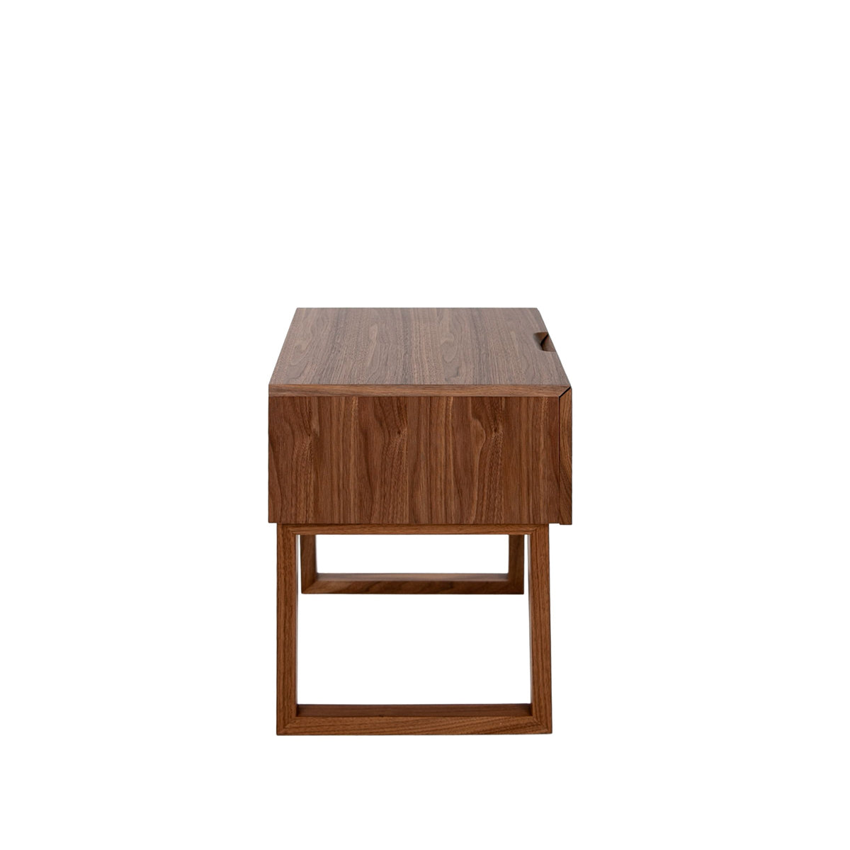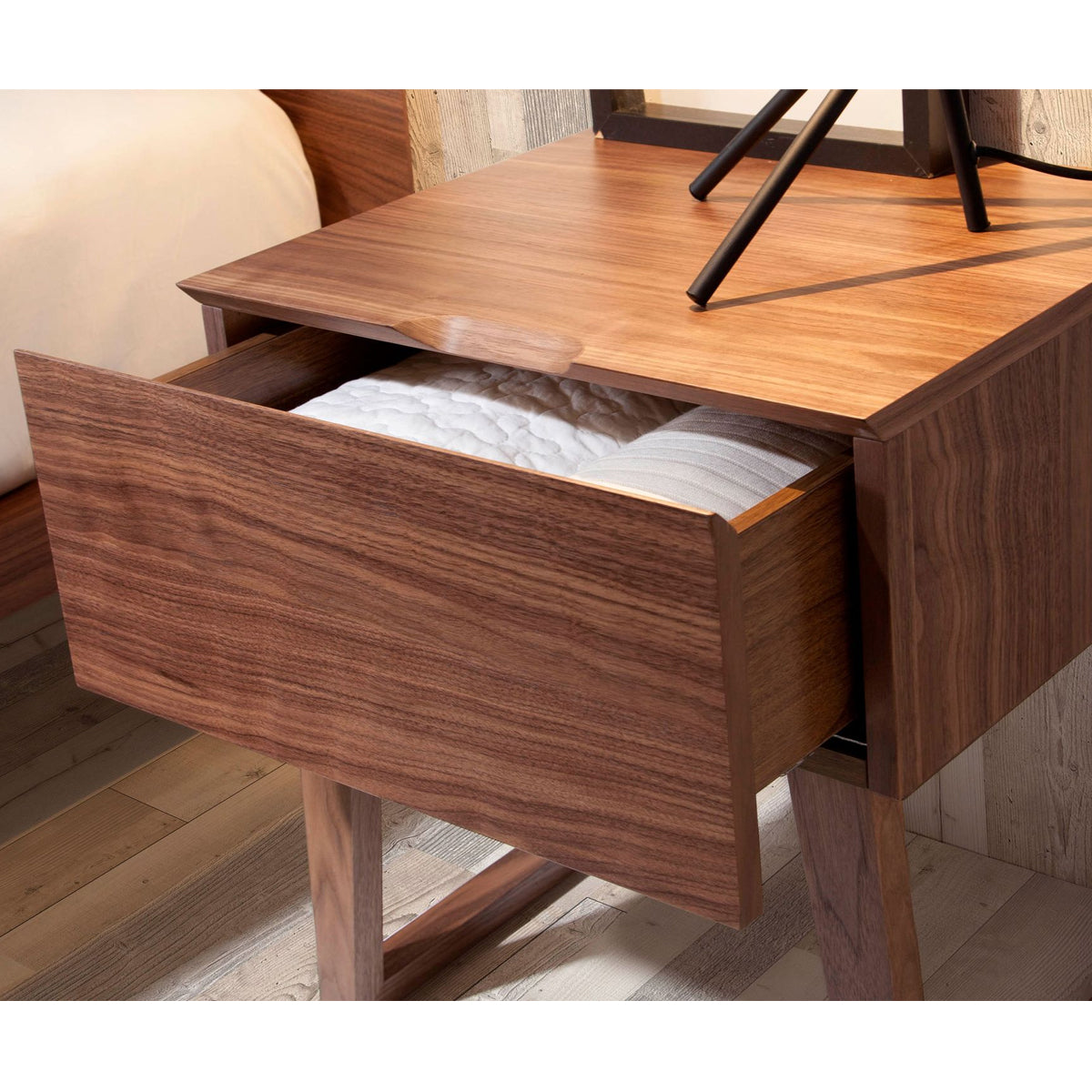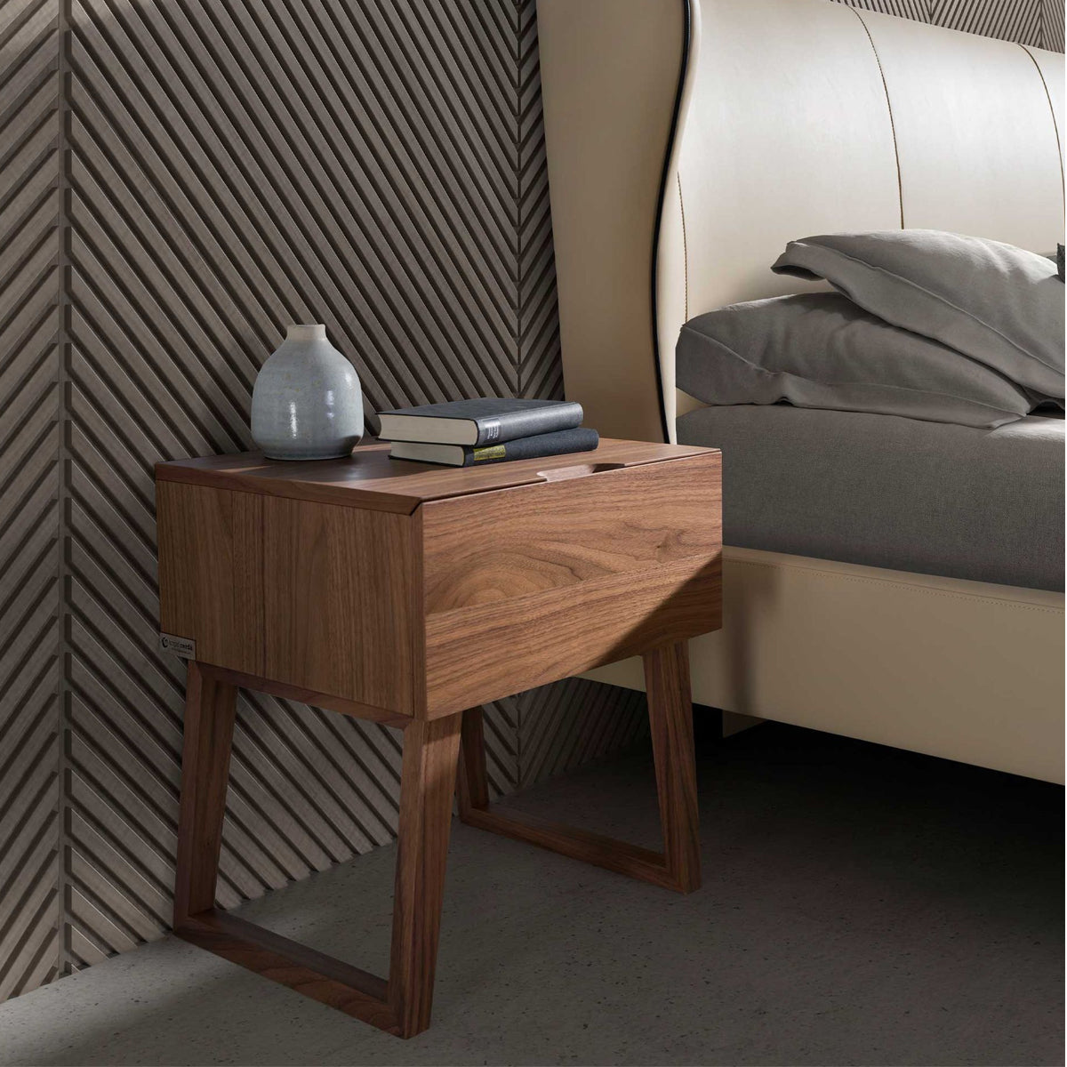 Noptieră cu design modern, cu structură din lemn furniruit cu nuc natural și picioare din lemn furniruite cu nuc natural.