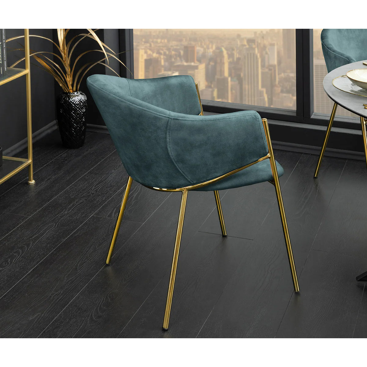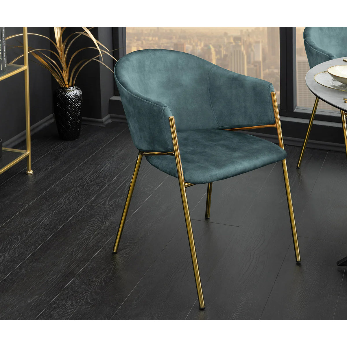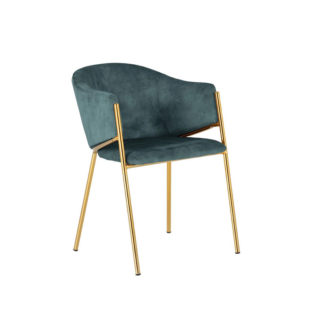 Scaunul MORRA Verde Petrol aduce profunzime și stil, prin combinația de catifea luxuriantă într-o nuanță intensă de verde-petrol și picioare aurii mate.