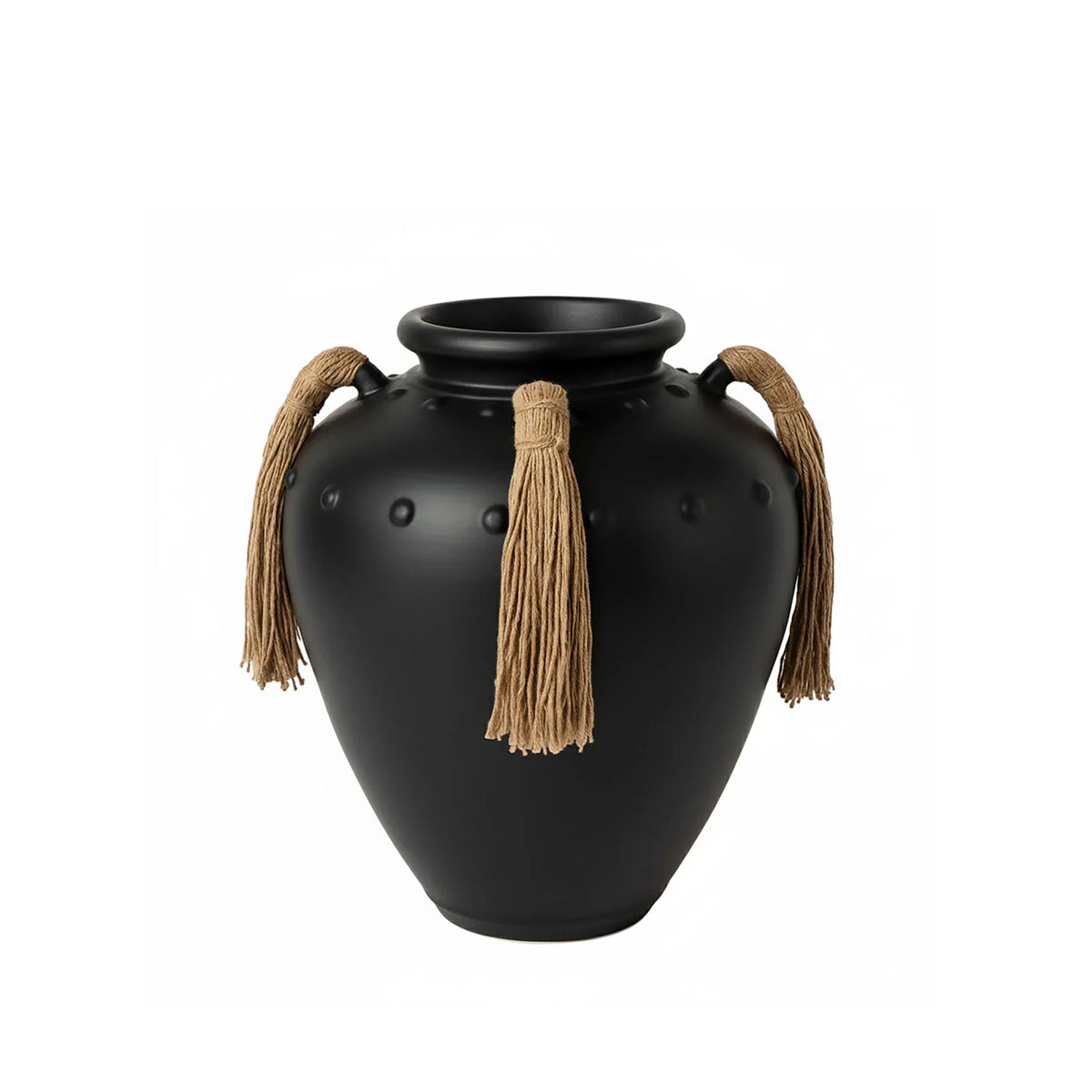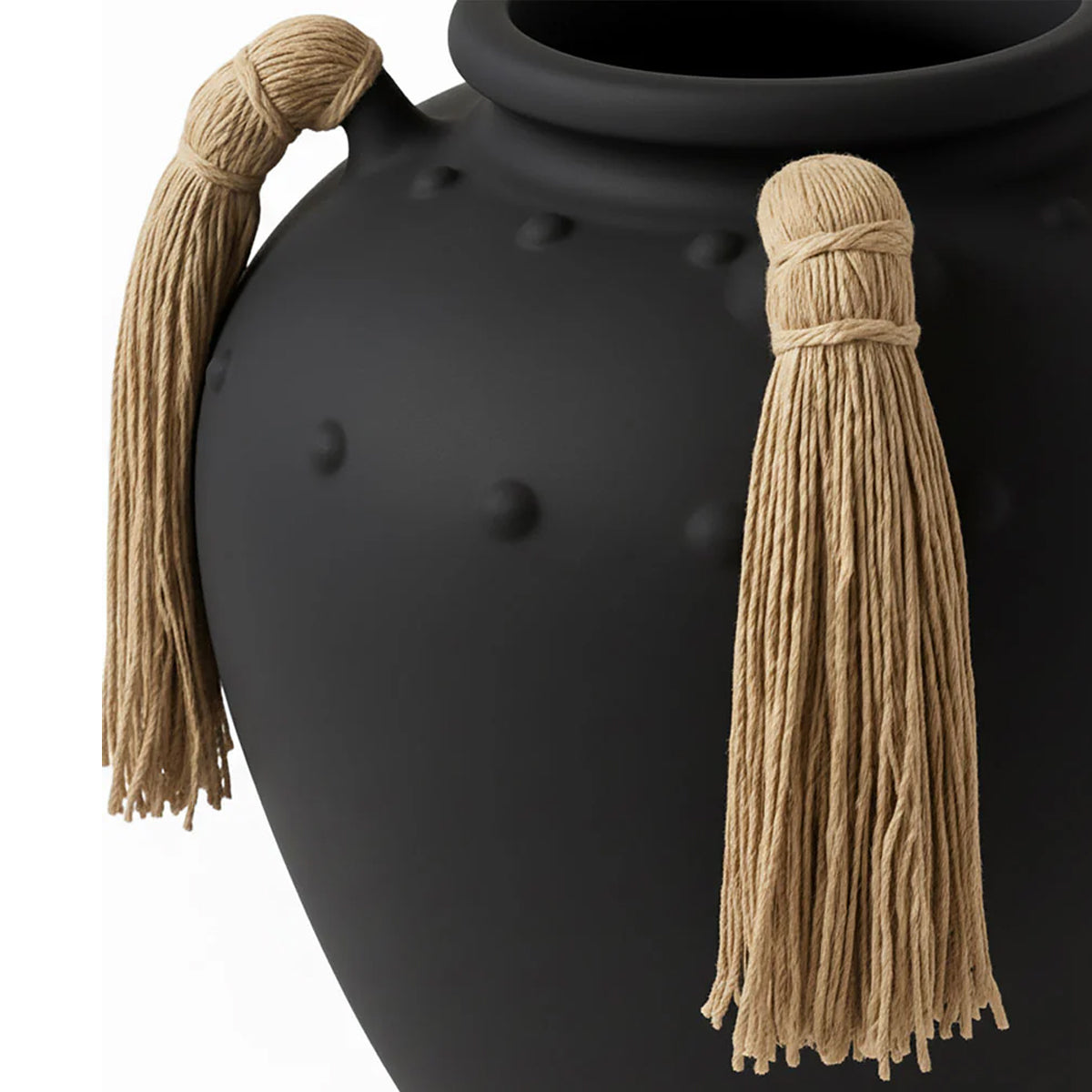 Realizat din beton, vasul este disponibil în două finisaje esențiale – alb și negru – ambele mate, cu o textură subtilă ce adaugă profunzime suprafeței. Toartele îmbrăcate în cânepă naturală introduc un contrast tactil și vizual cald, echilibrând perfect caracterul mineral al betonului cu un detaliu artizanal, aproape ancestral.