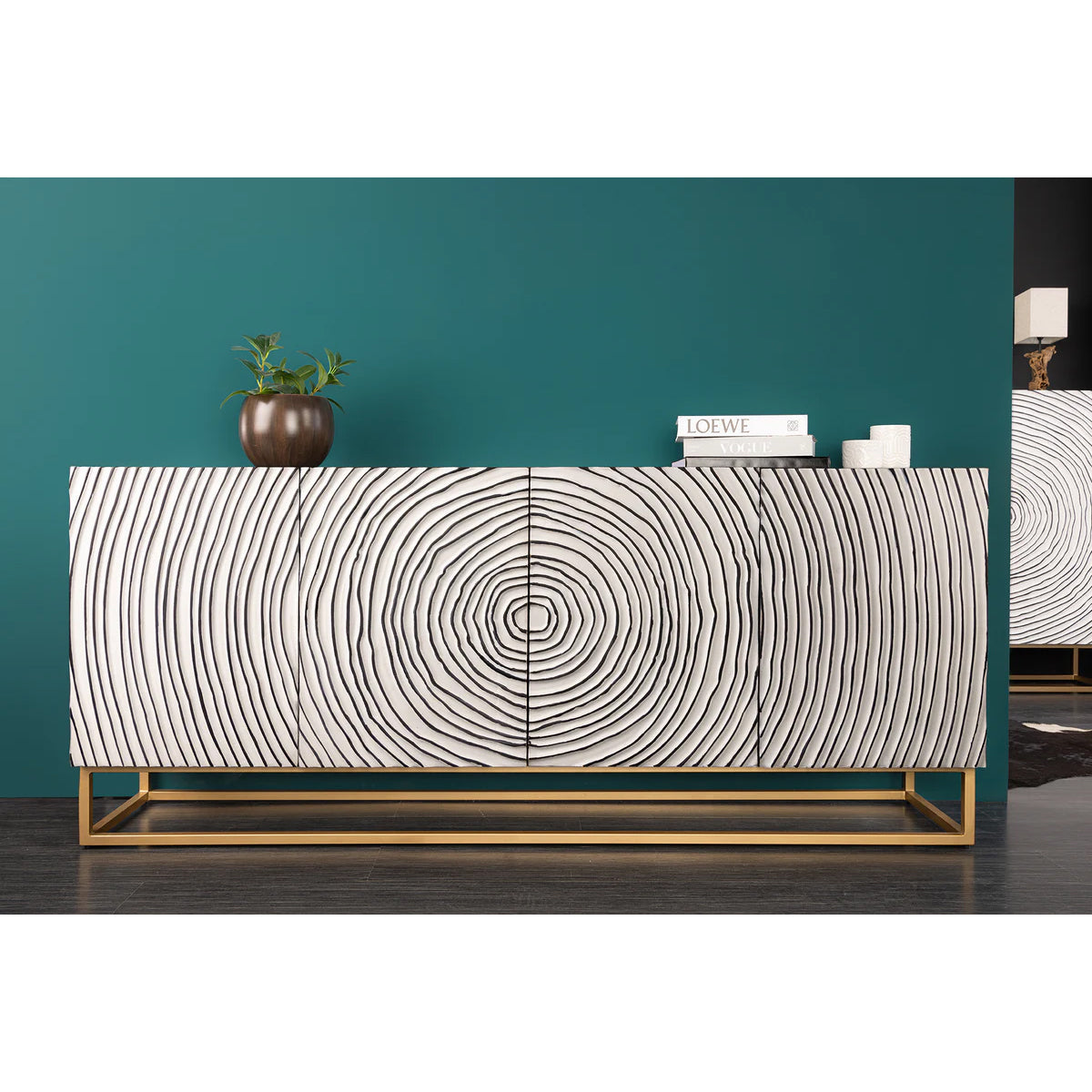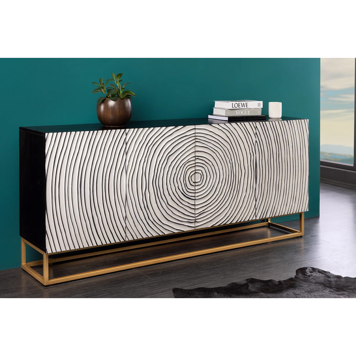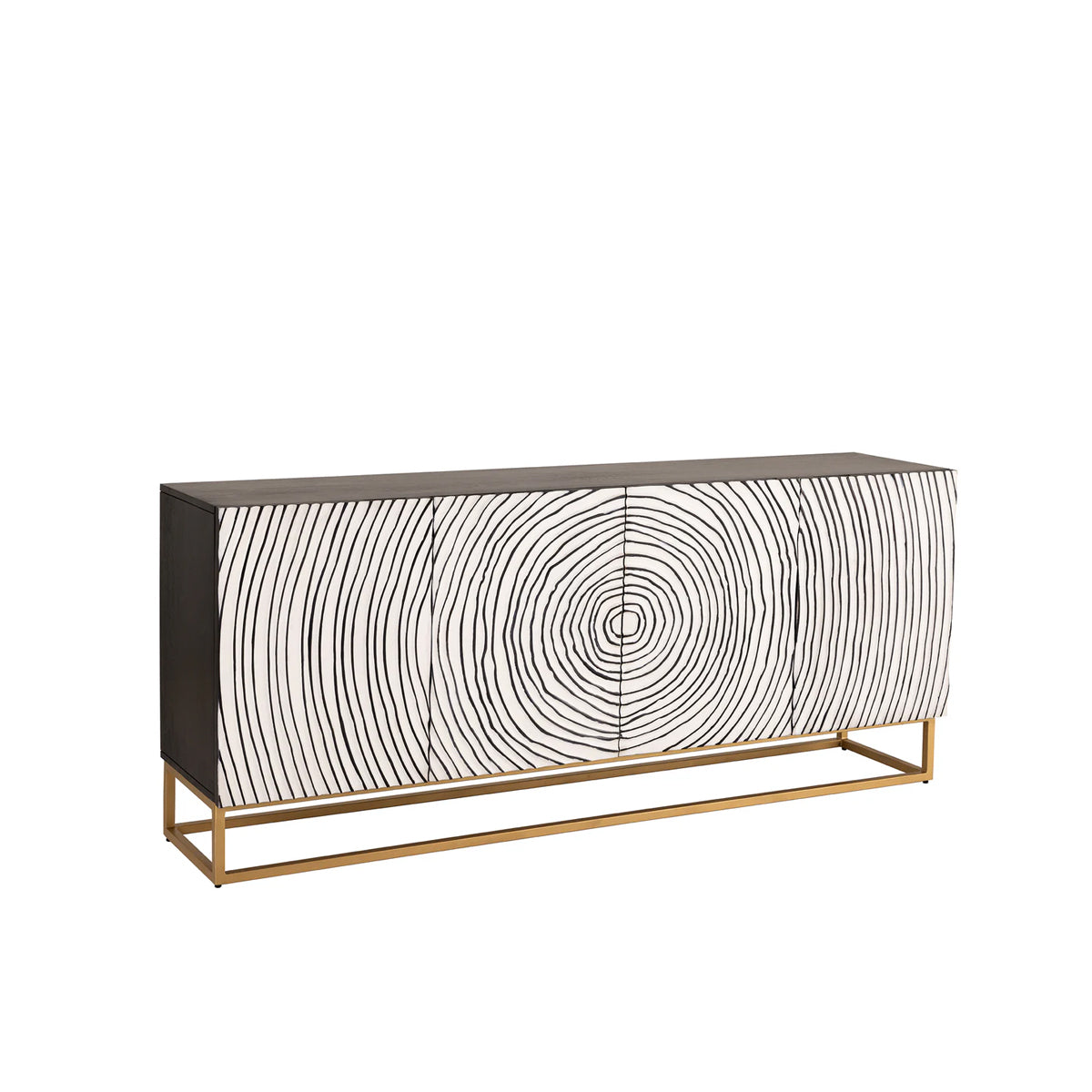 Bufetul ORBIT B&W. Un joc grafic între alb și negru, completat de strălucirea discretă a aurului satinat. Formele circulare, inspirate din natură, aduc o notă subtil exotică, amintind de ritmurile și texturile lemnului tropical.