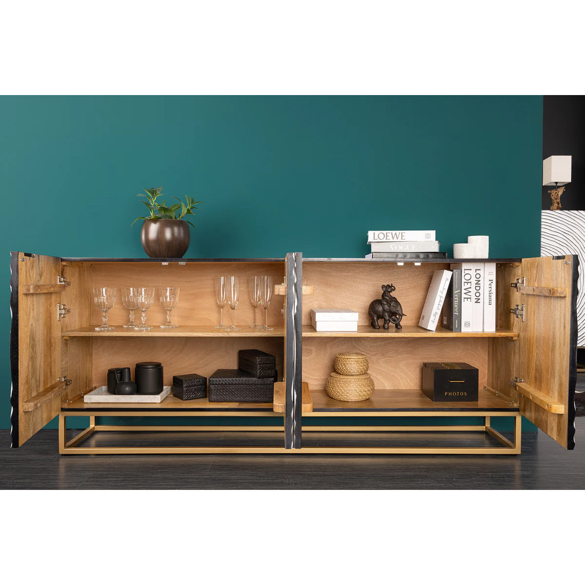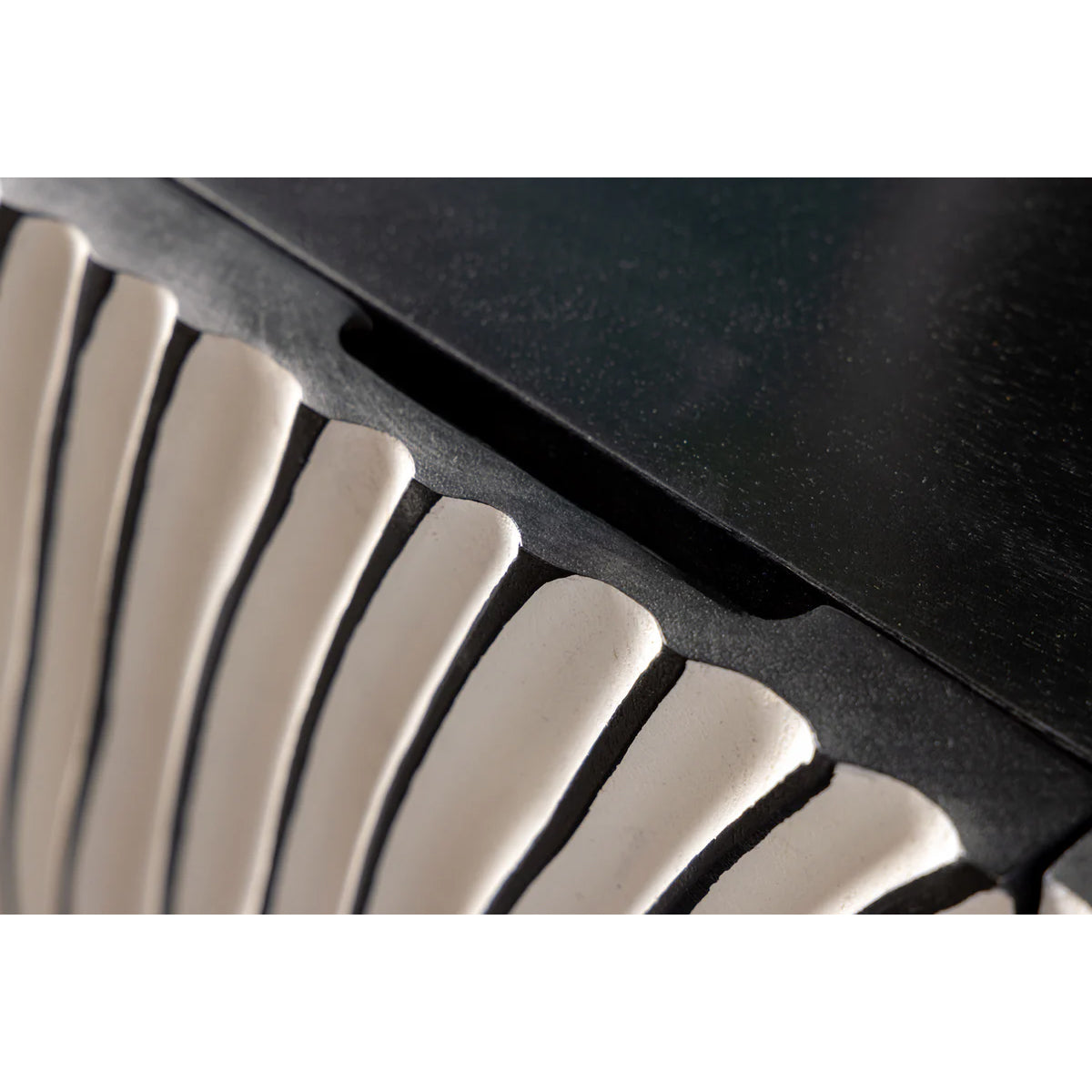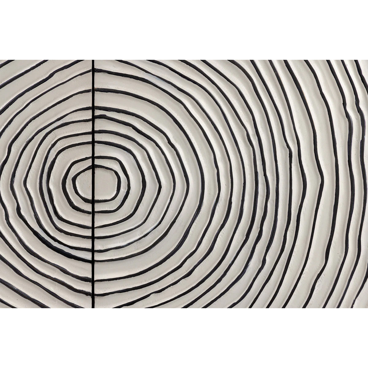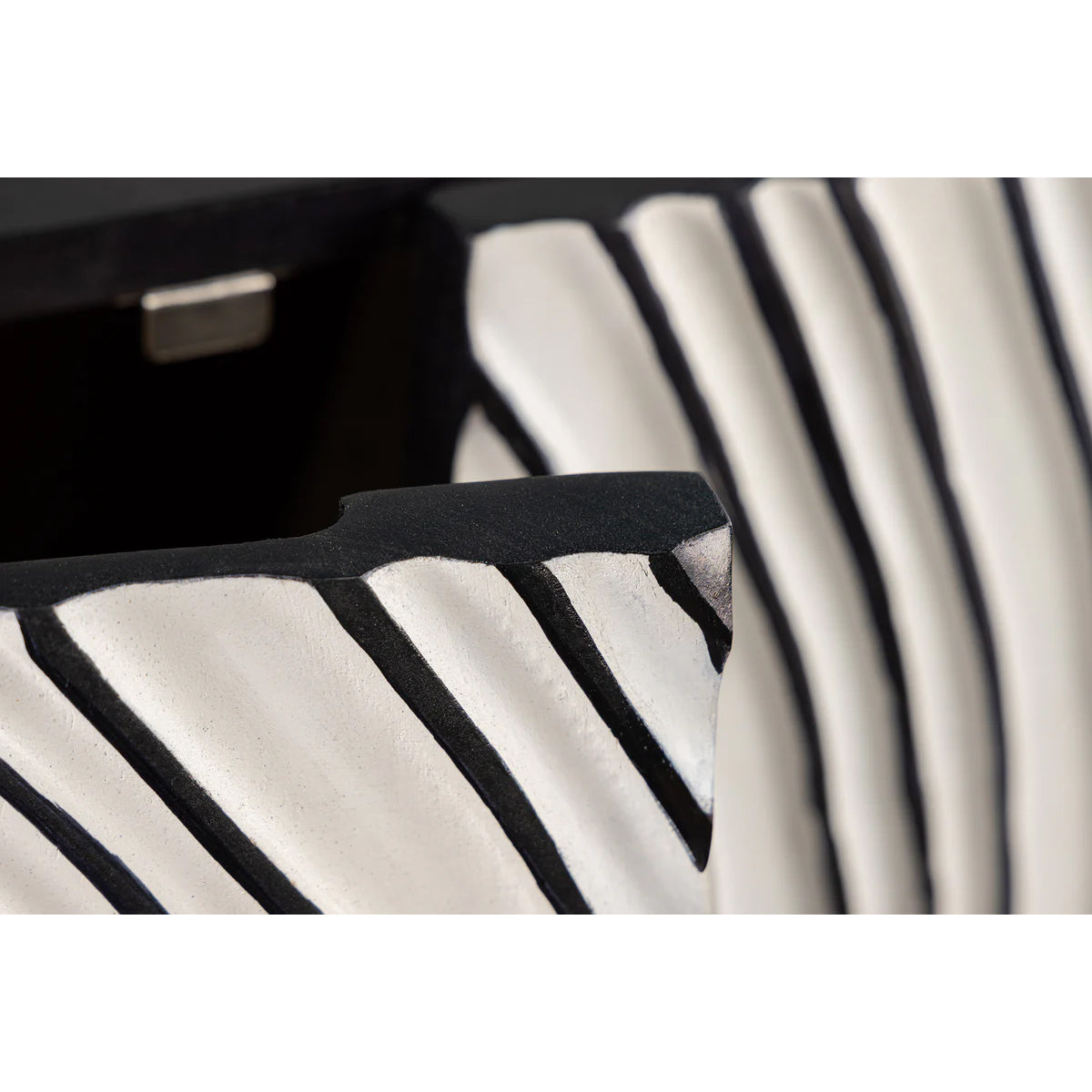 Bufetul ORBIT B&W. Un joc grafic între alb și negru, completat de strălucirea discretă a aurului satinat. Formele circulare, inspirate din natură, aduc o notă subtil exotică, amintind de ritmurile și texturile lemnului tropical.