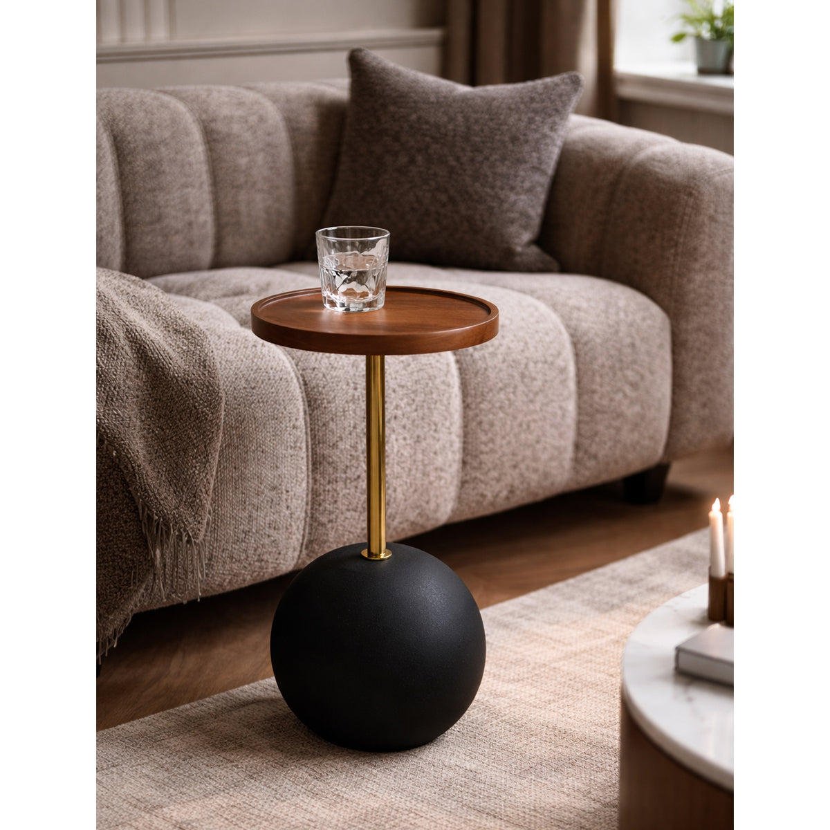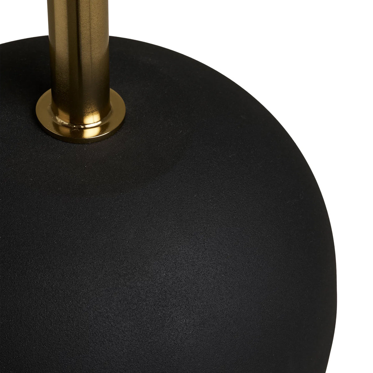 Baza sferică, realizată din metal vopsit negru mat, cu textură poroasă, oferă stabilitate și un accent sculptural, aproape obiectual.