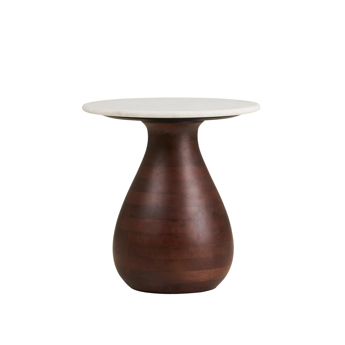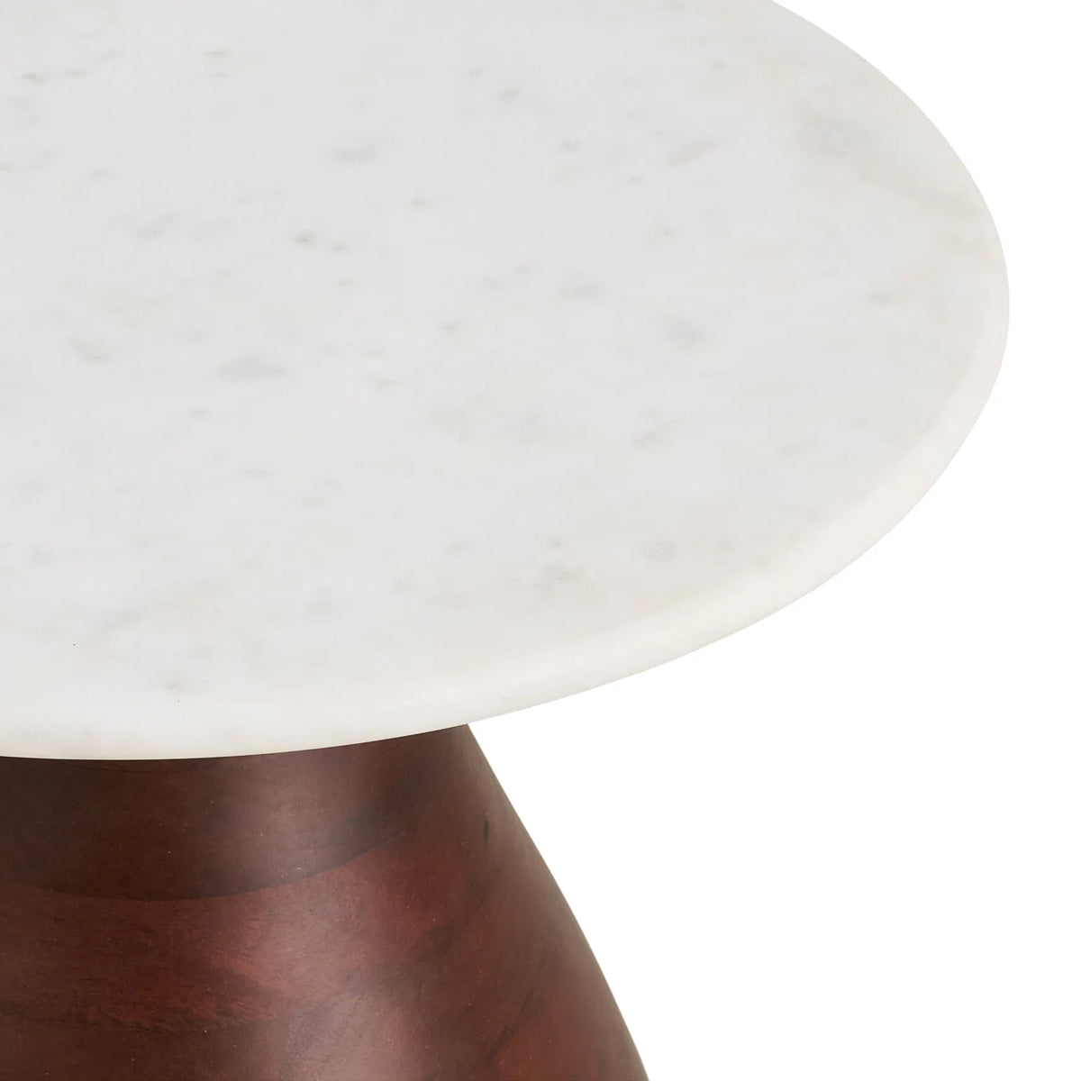 Blatul din marmură păstrează aceeași eleganță naturală, iar baza din lemn de mango, cu formă curbată și proporții bine definite, oferă stabilitate și caracter.
