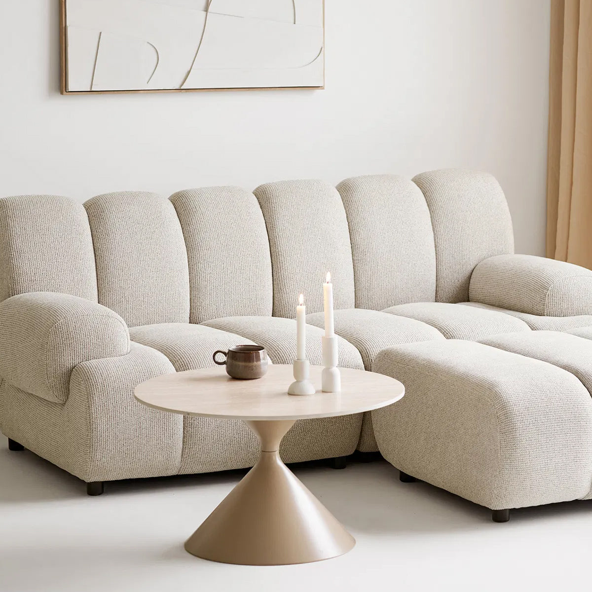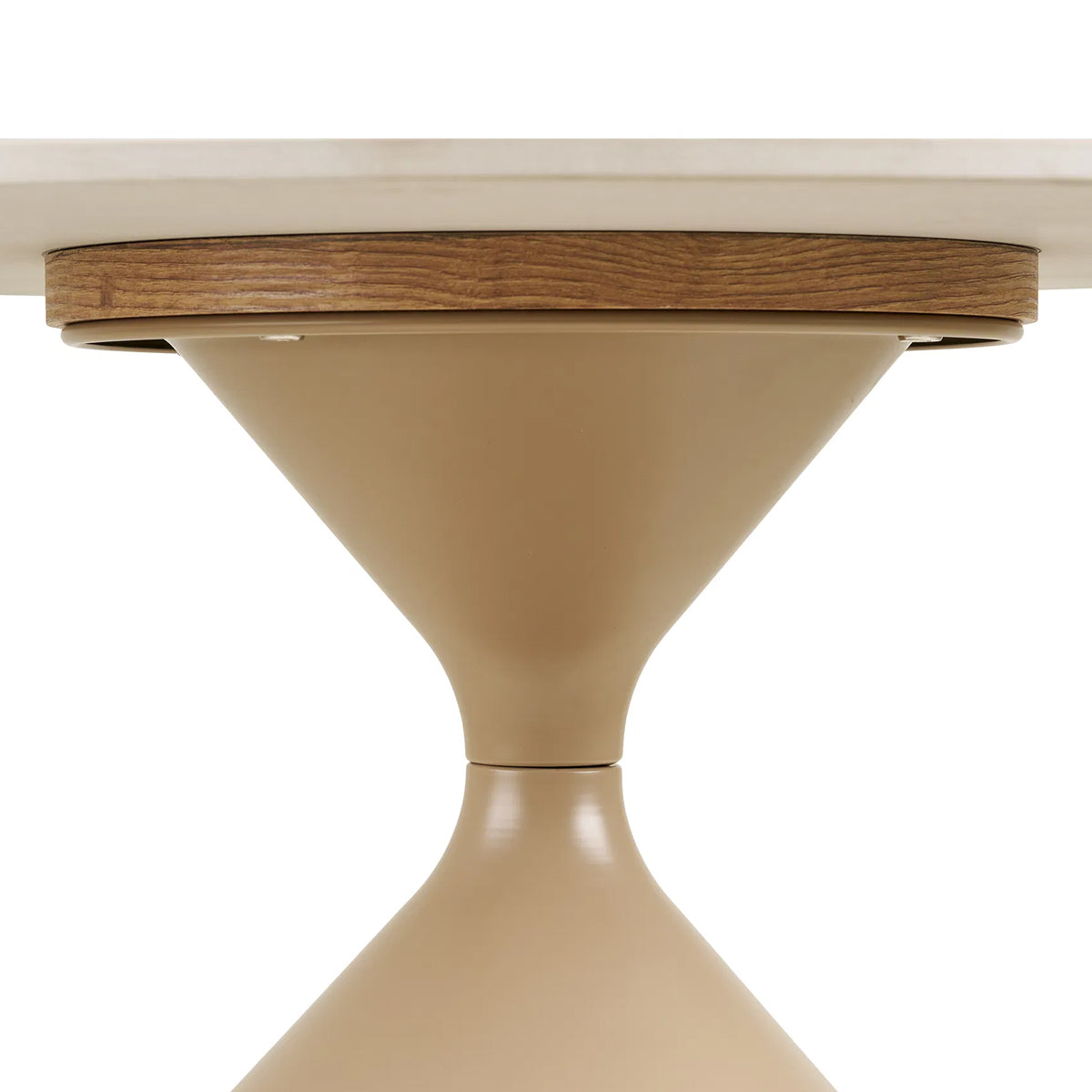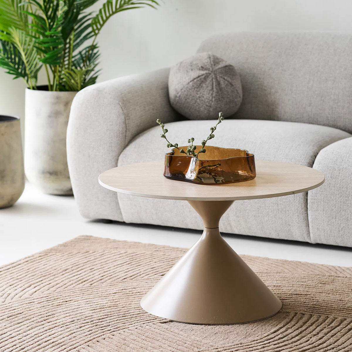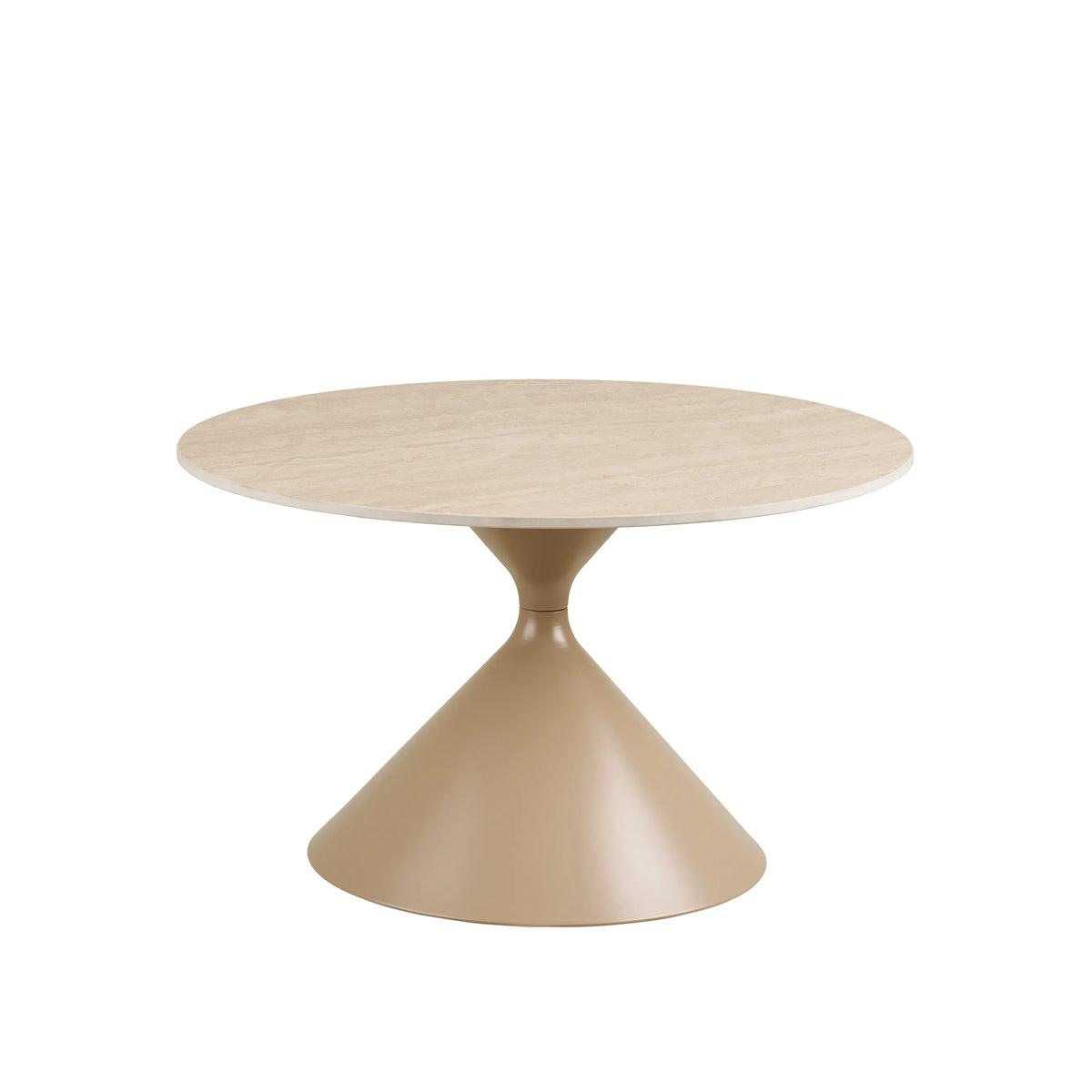 Masă cafea rotundă cu blat din ceramică (travertin) si bază metalică bej nisip.