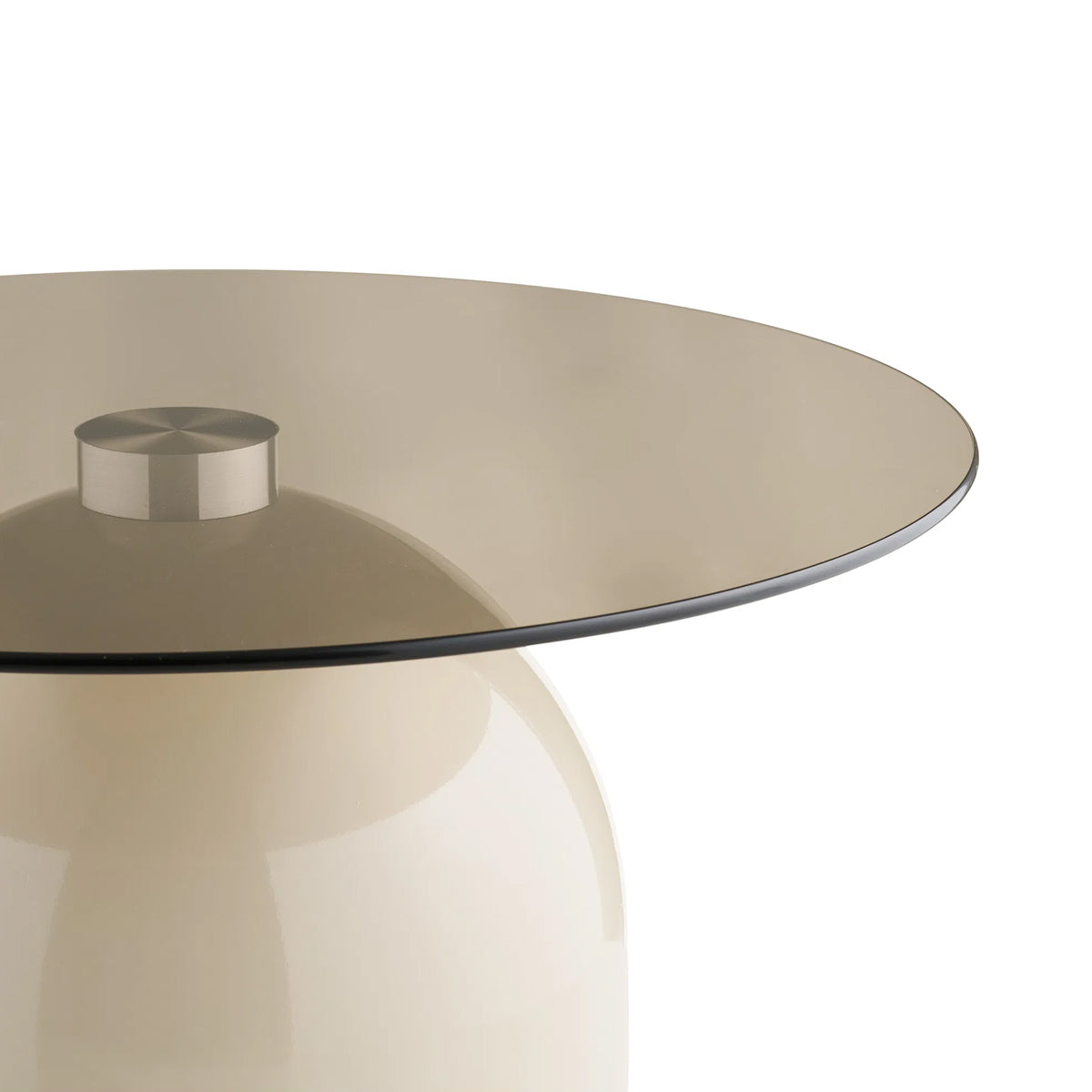 Masă cafea rotundă cu blat din sticlă fumurie şi bază din metal.