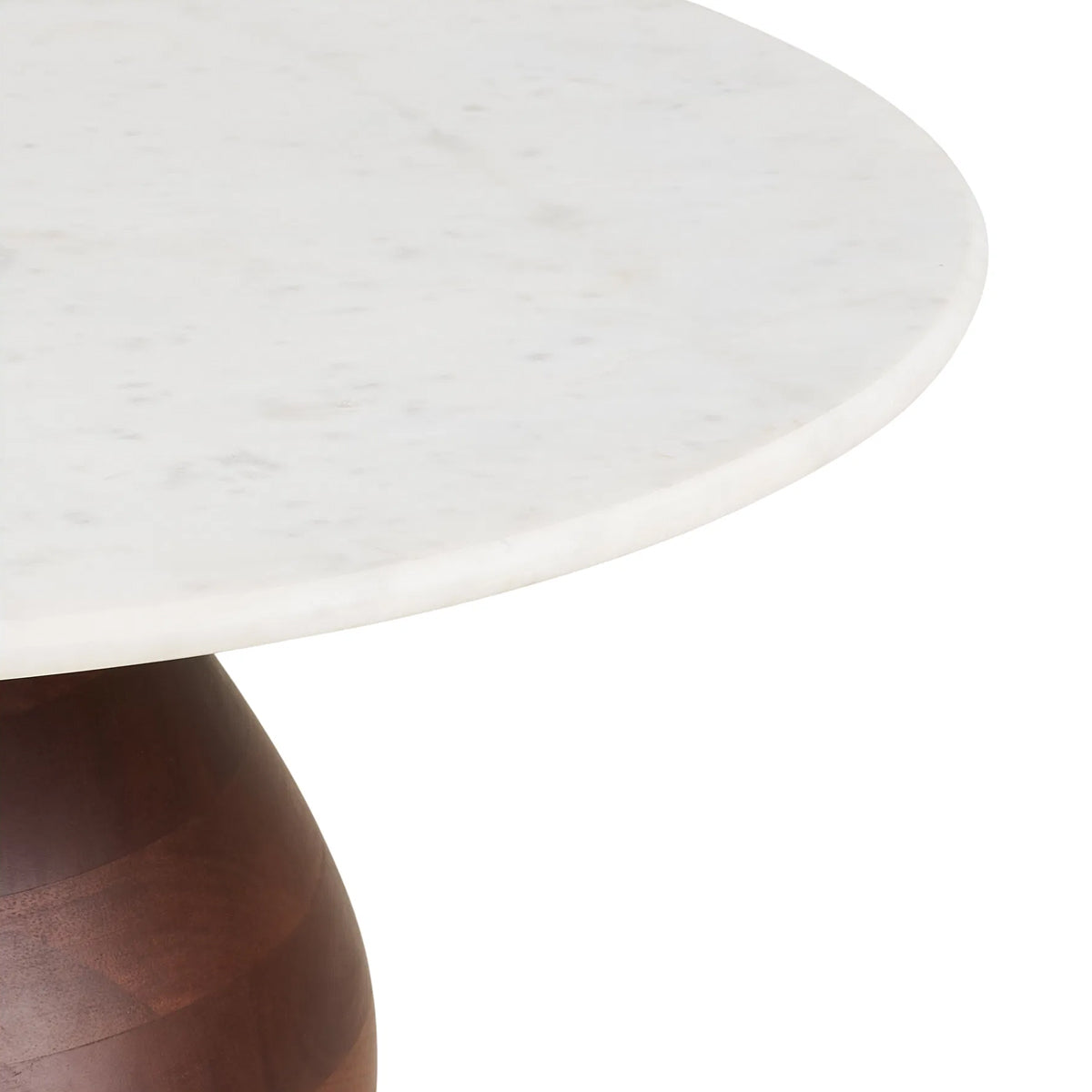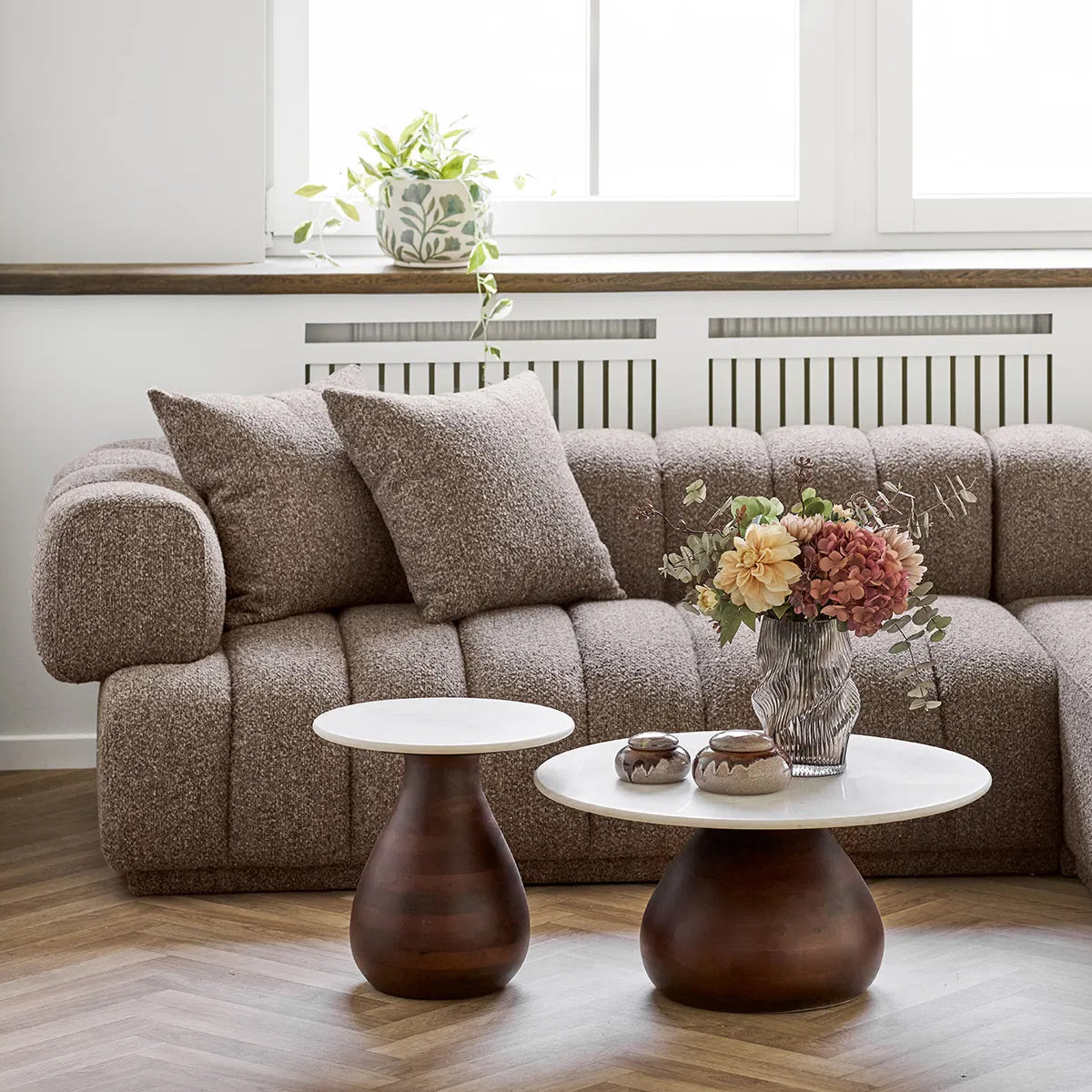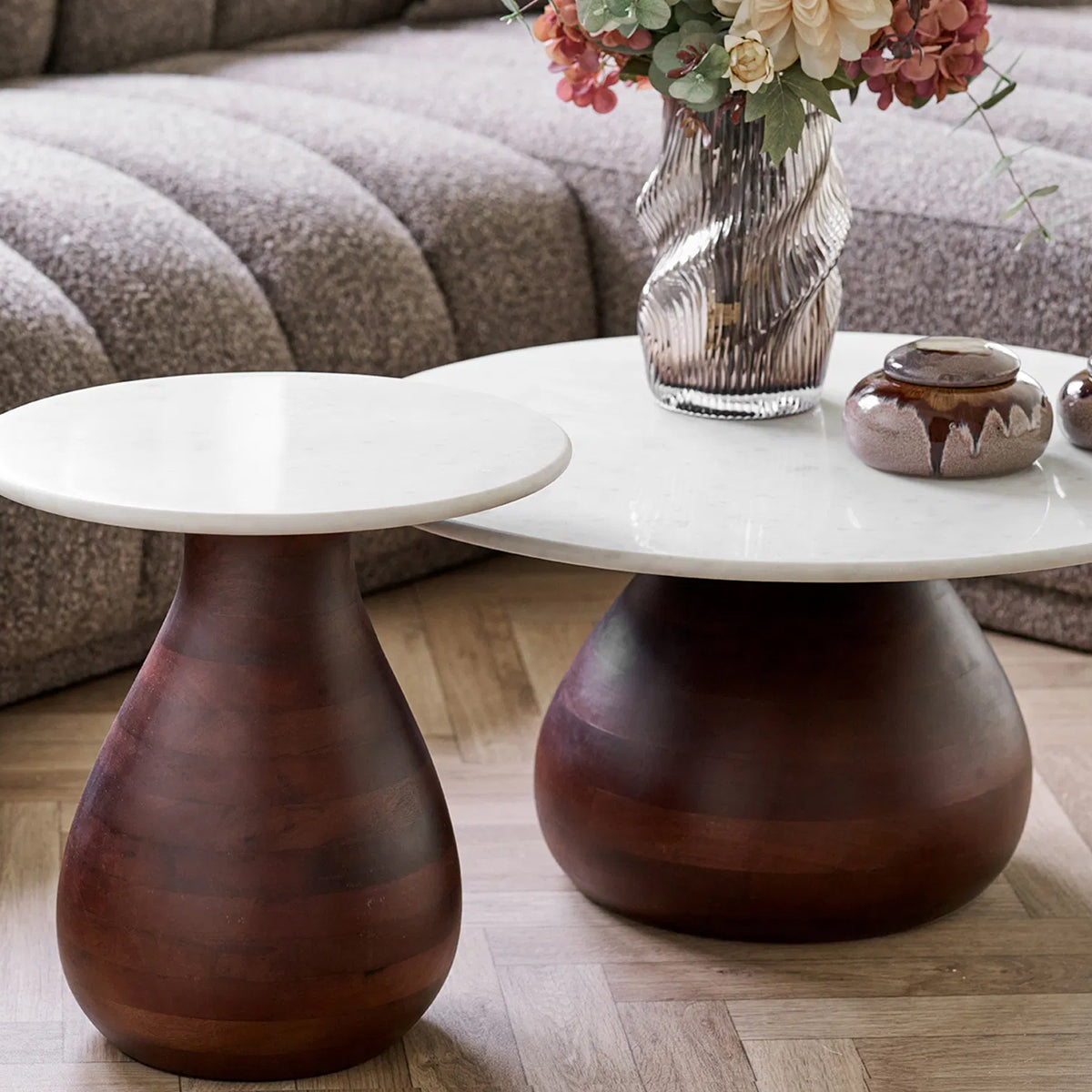 Blaturile din marmură adaugă lumină și rafinament, în timp ce bazele din lemn de mango, cu forme sculpturale, creează o legătură naturală cu spațiul.