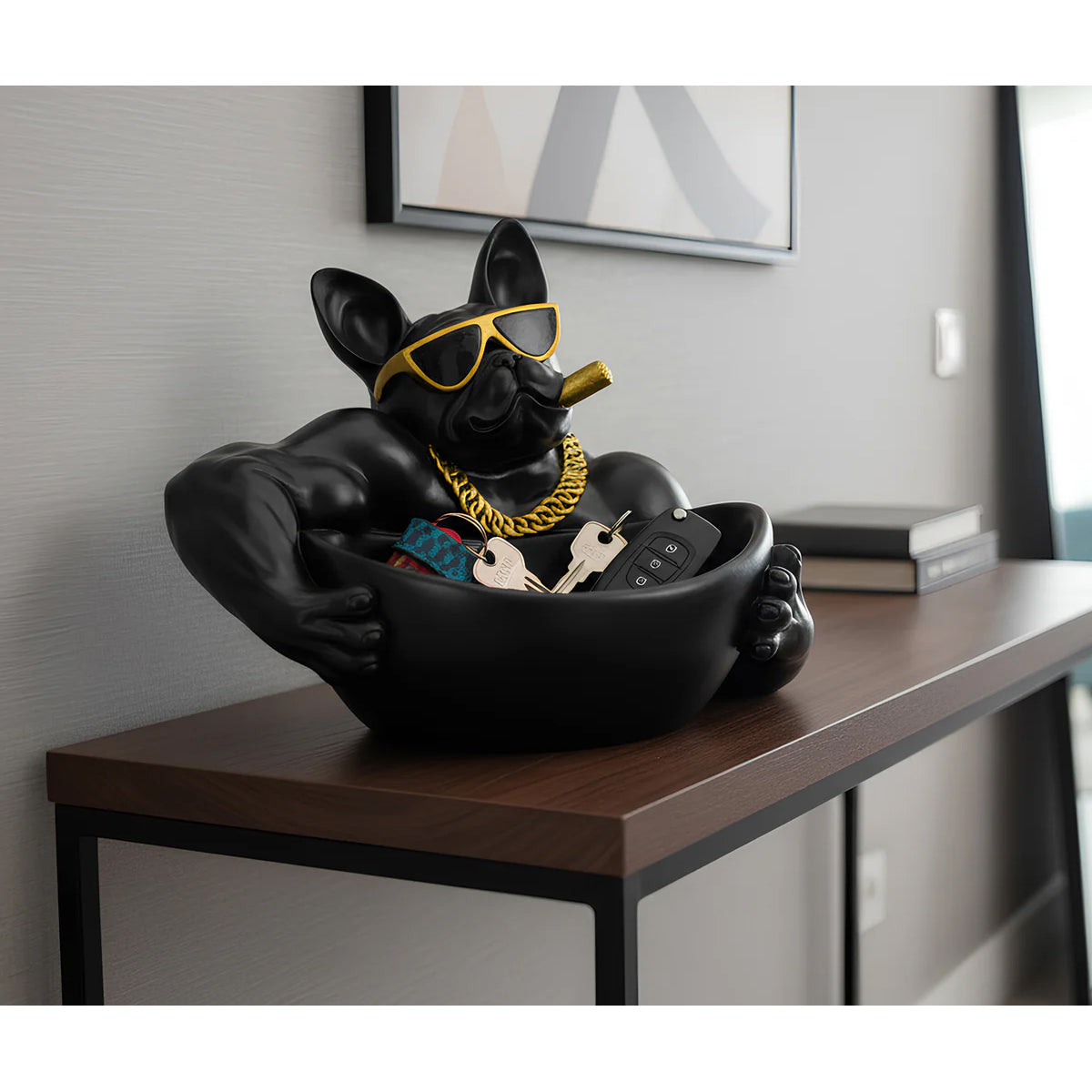 Piesa combină funcția practică cu un element decorativ expresiv: bolul susținut de personaj poate fi utilizat pentru chei, telecomenzi sau obiecte mici, fiind potrivit pentru hol, living sau birou.