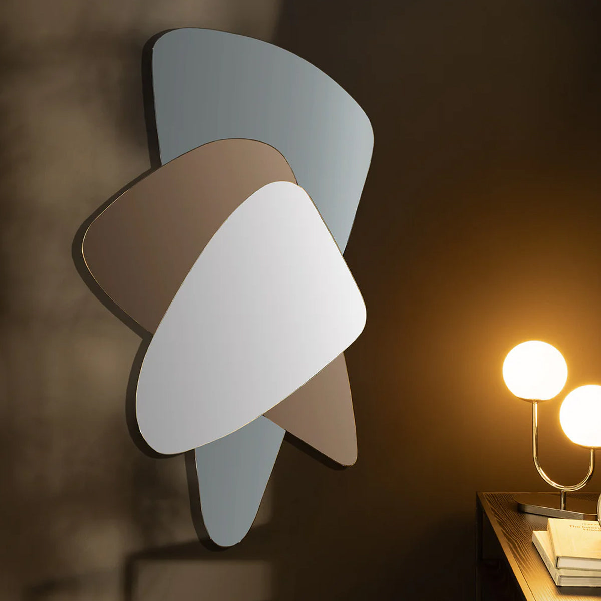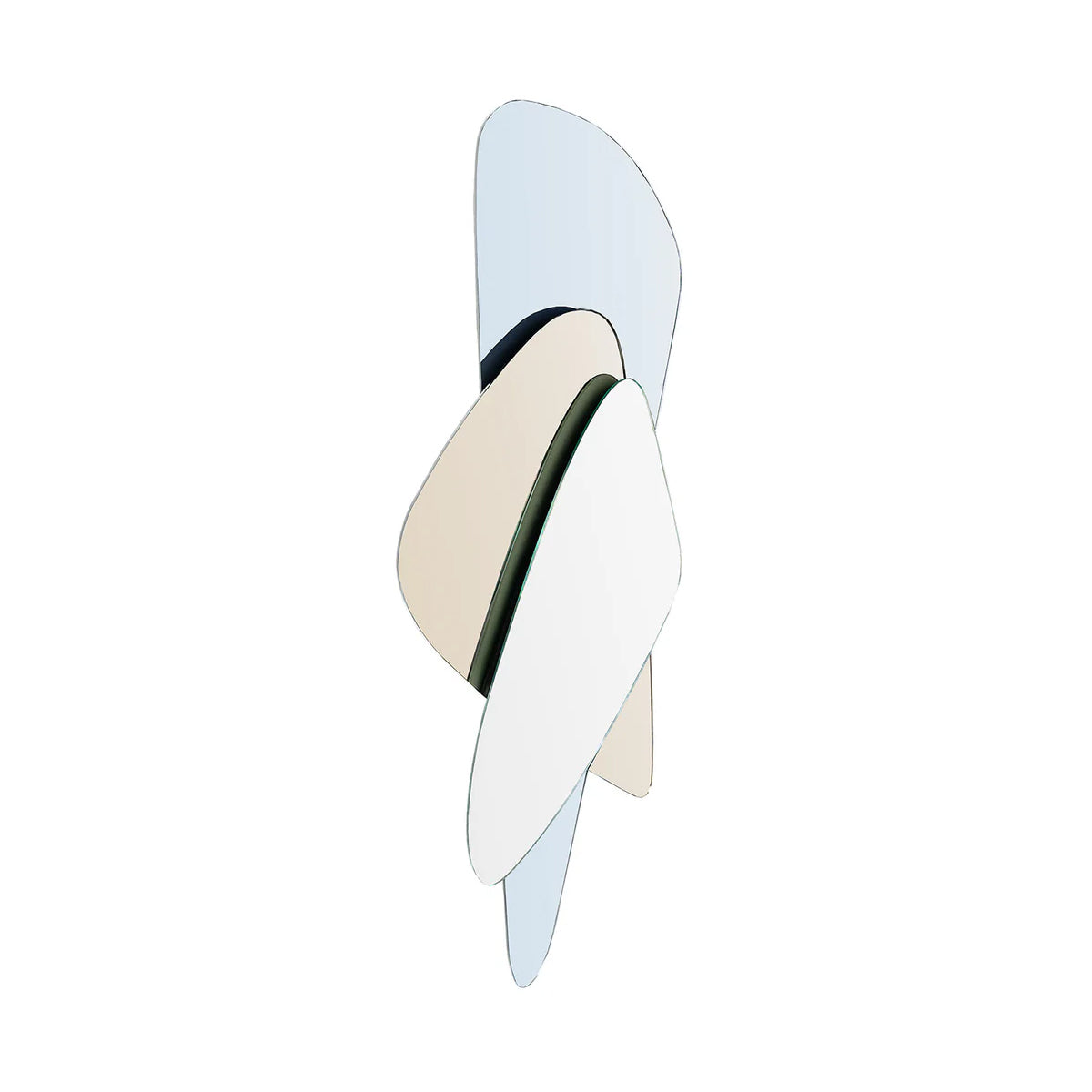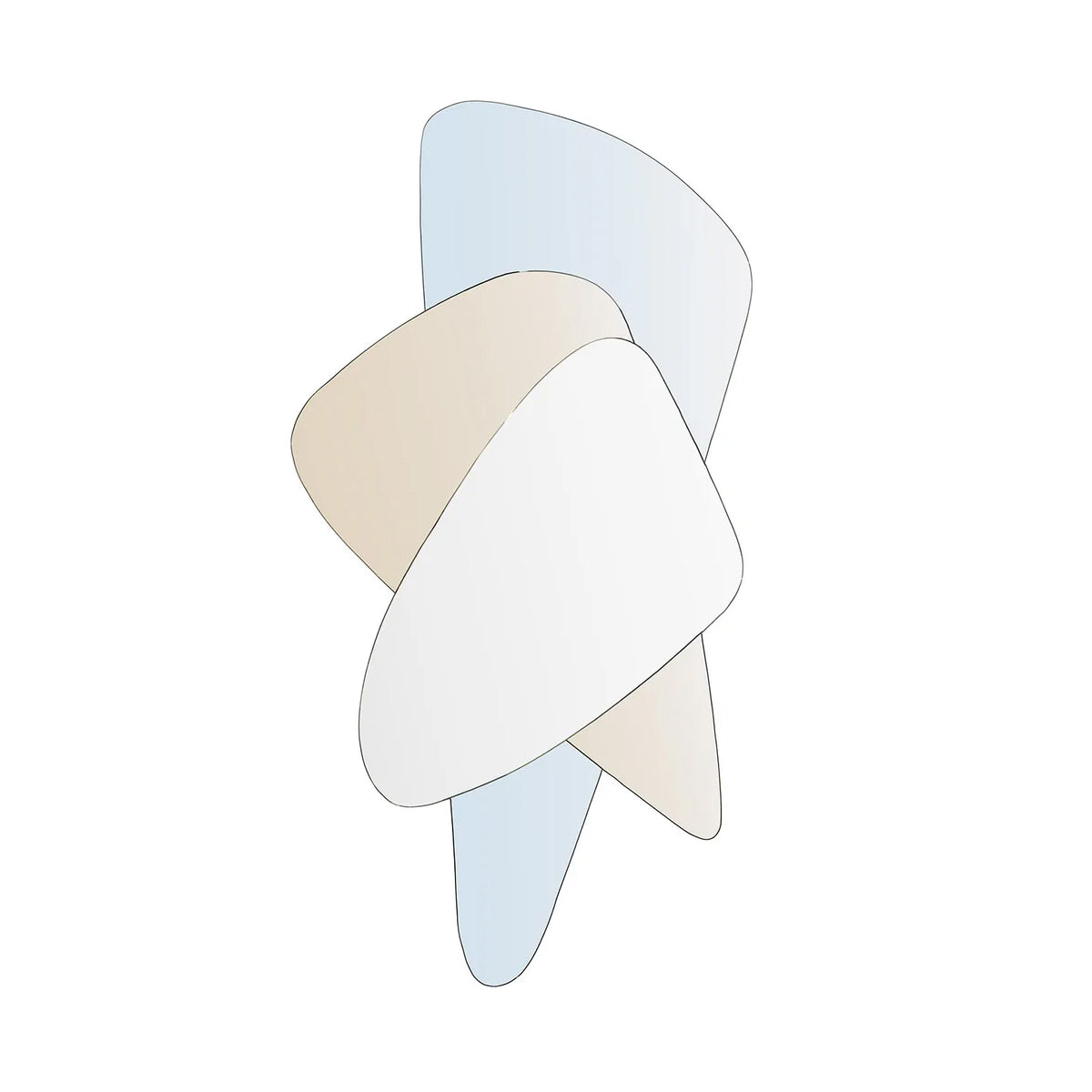 Set decorativ de oglinzi realizat ca o singură compoziție fixă, formată din trei foi de oglindă cu forme organice, rotunjite, suprapuse într-un joc elegant de volume și reflexii.
