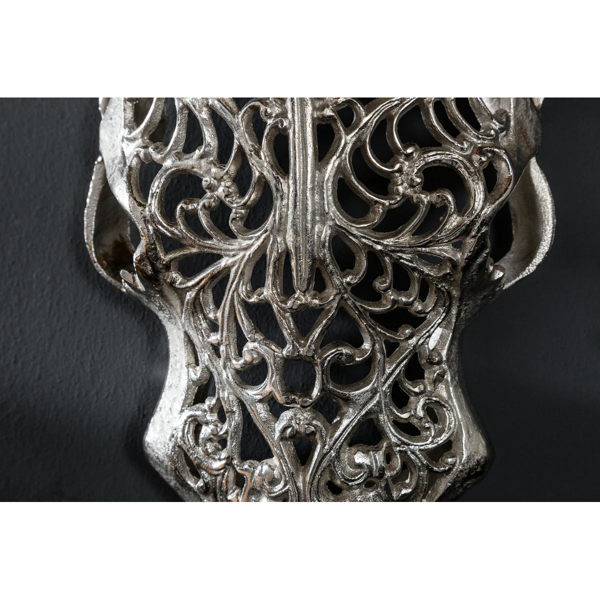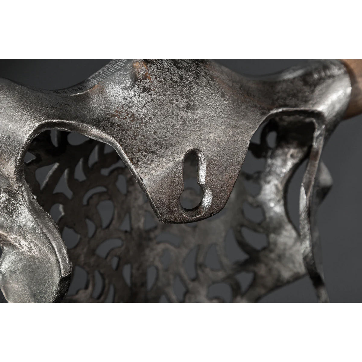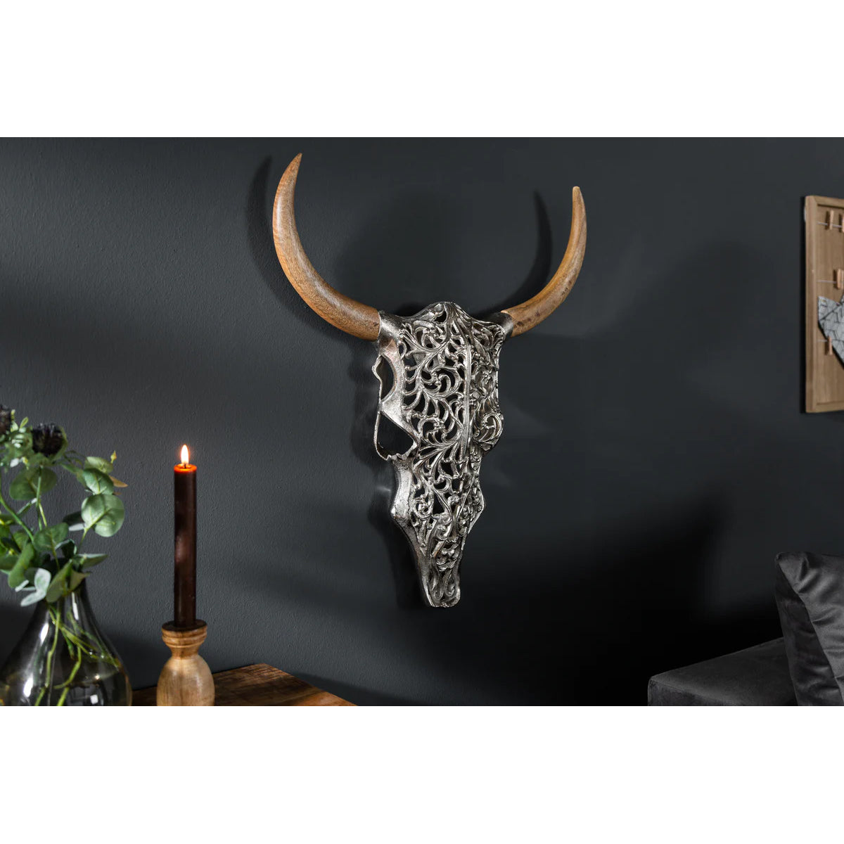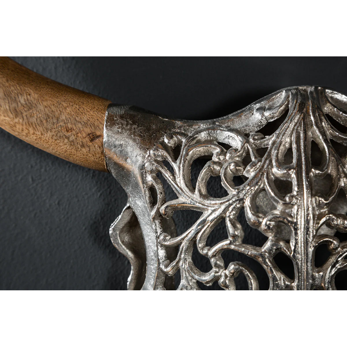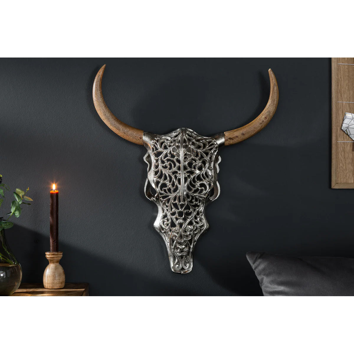 Decoraţiune de perete in formă de craniu de taur din aluminiu turnat şi lemn de mango.
