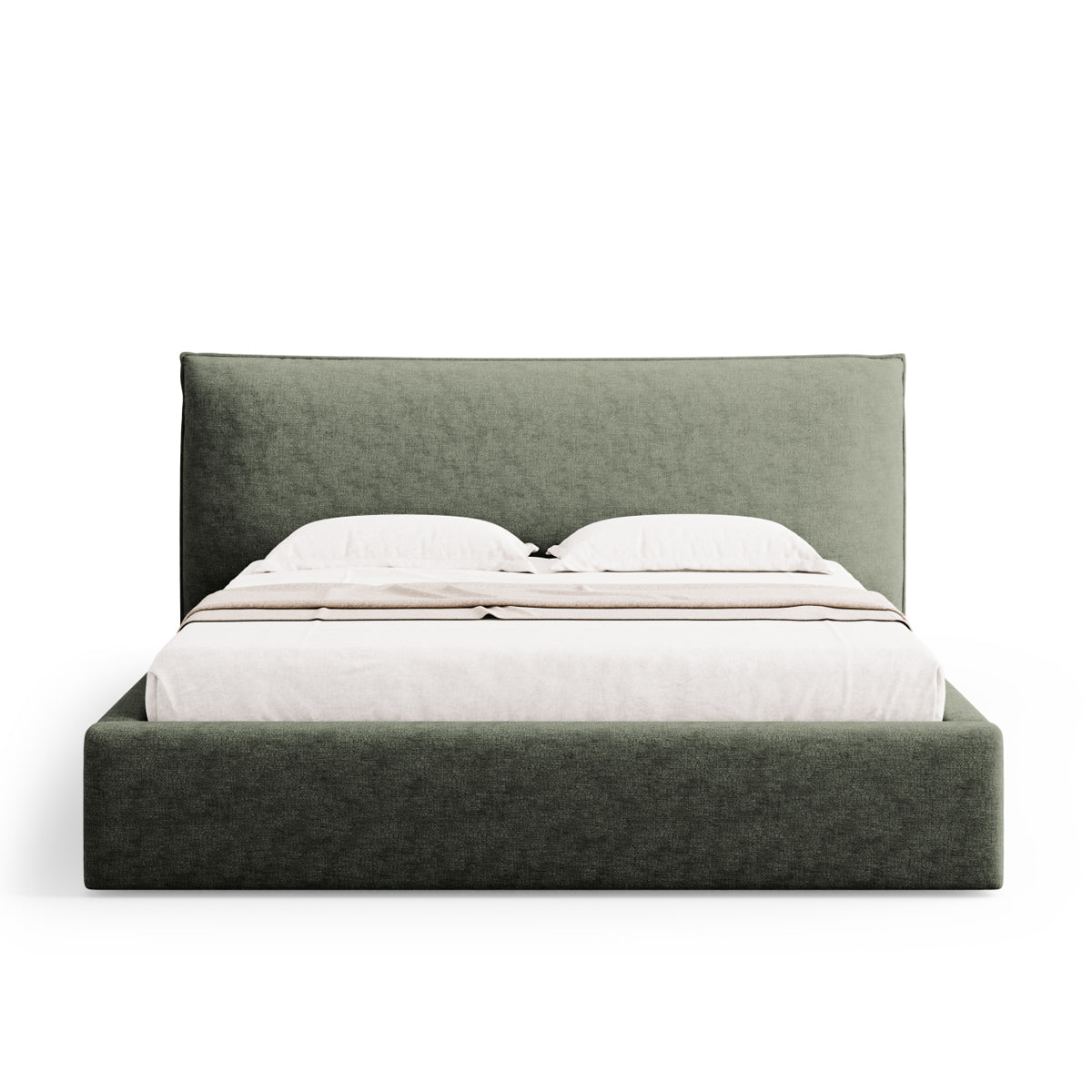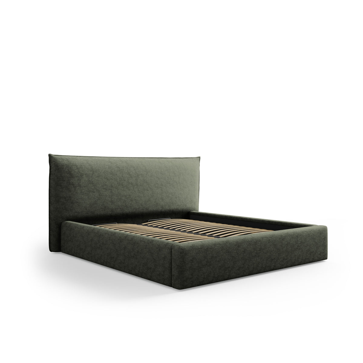 Pat tapițat în ţesatură de chenilă verde, cu tăblie și ladă de depozitare.
