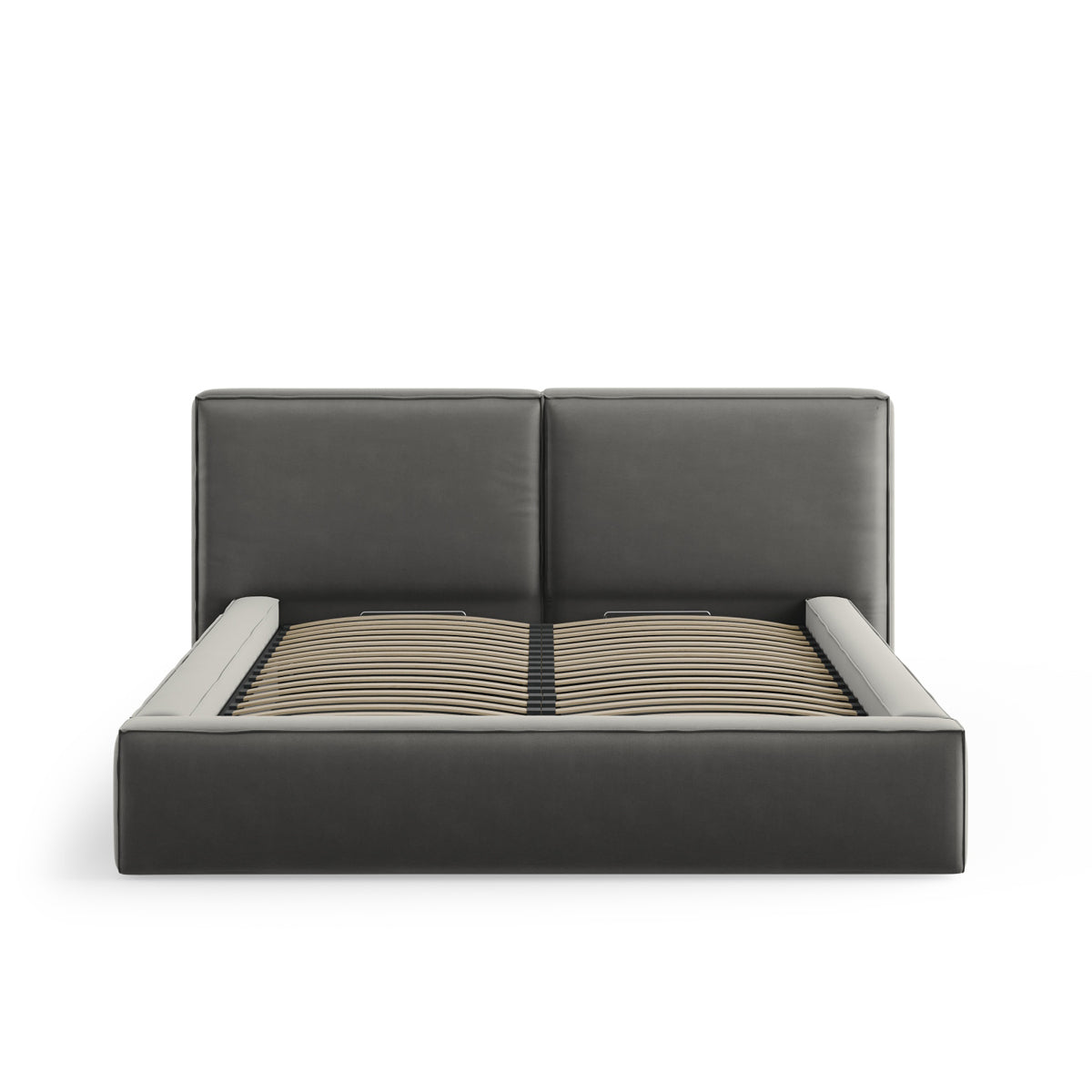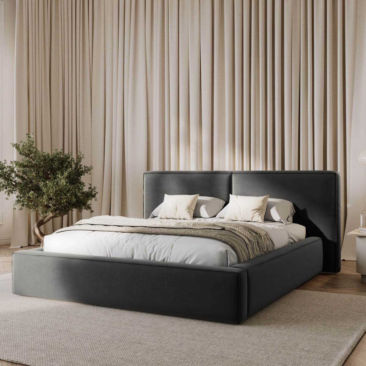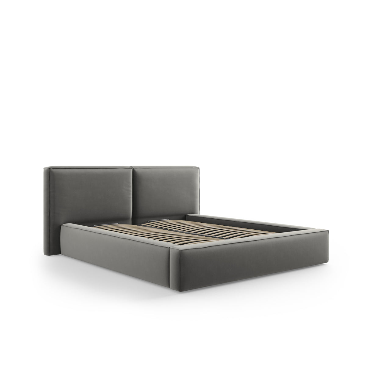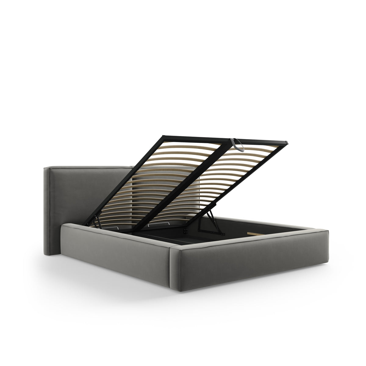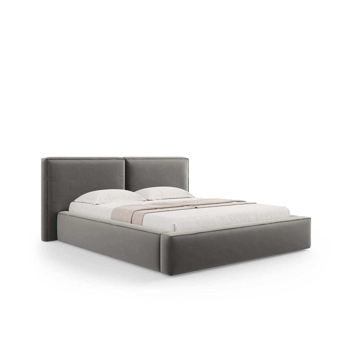 Pat tapițat în catifea gri, cu tăblie și ladă de depozitare.