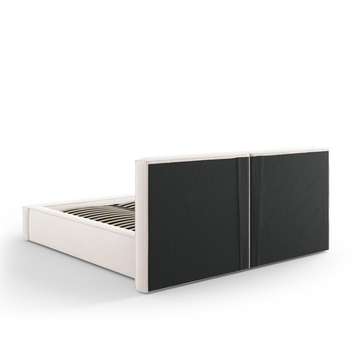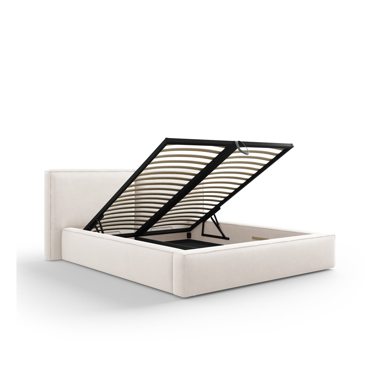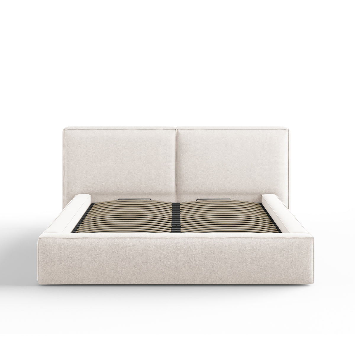 Pat tapițat în ţesatură structurată bej deschis, cu tăblie și ladă de depozitare.