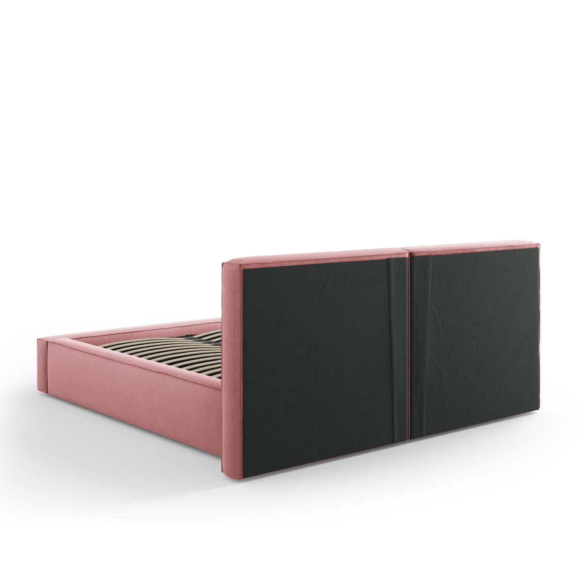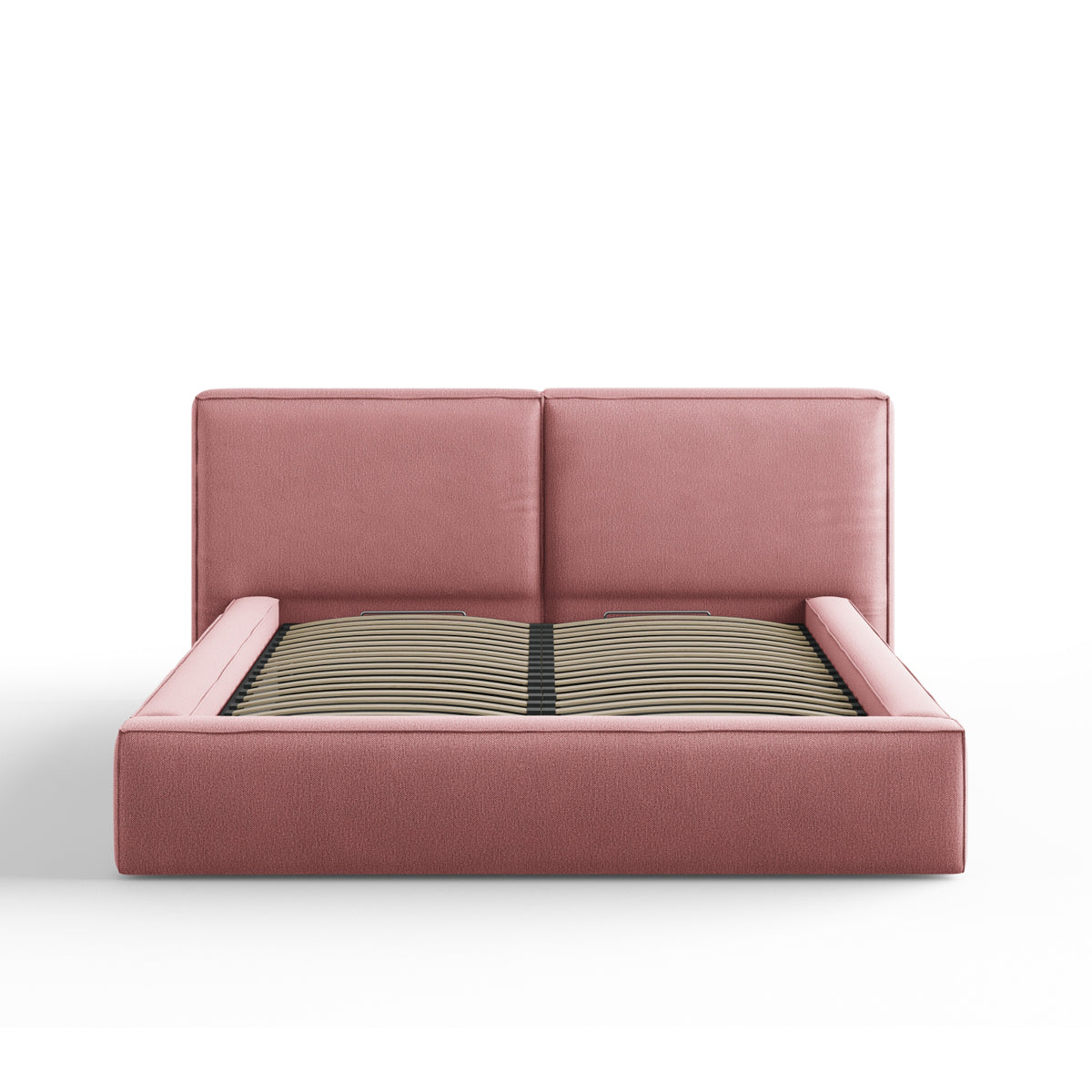 Pat tapițat în ţesatură structurată roz, cu tăblie și ladă de depozitare.