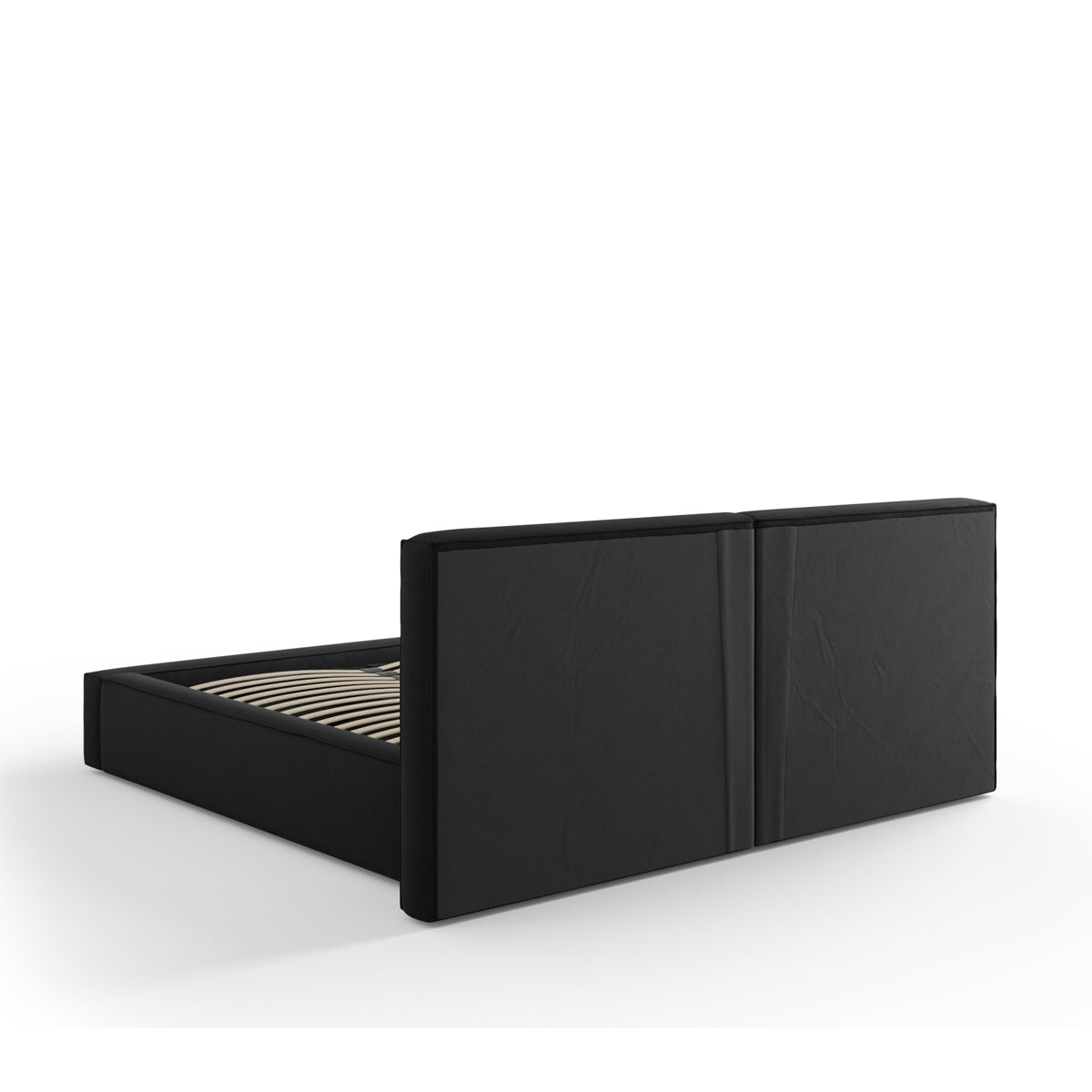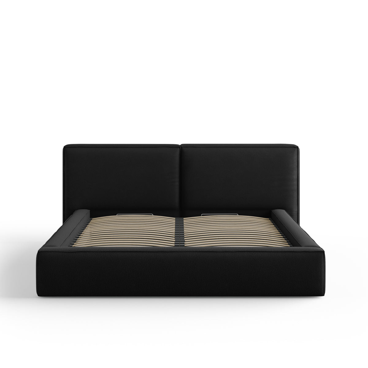 Pat tapițat în ţesatură structurată neagră, cu tăblie și ladă de depozitare.