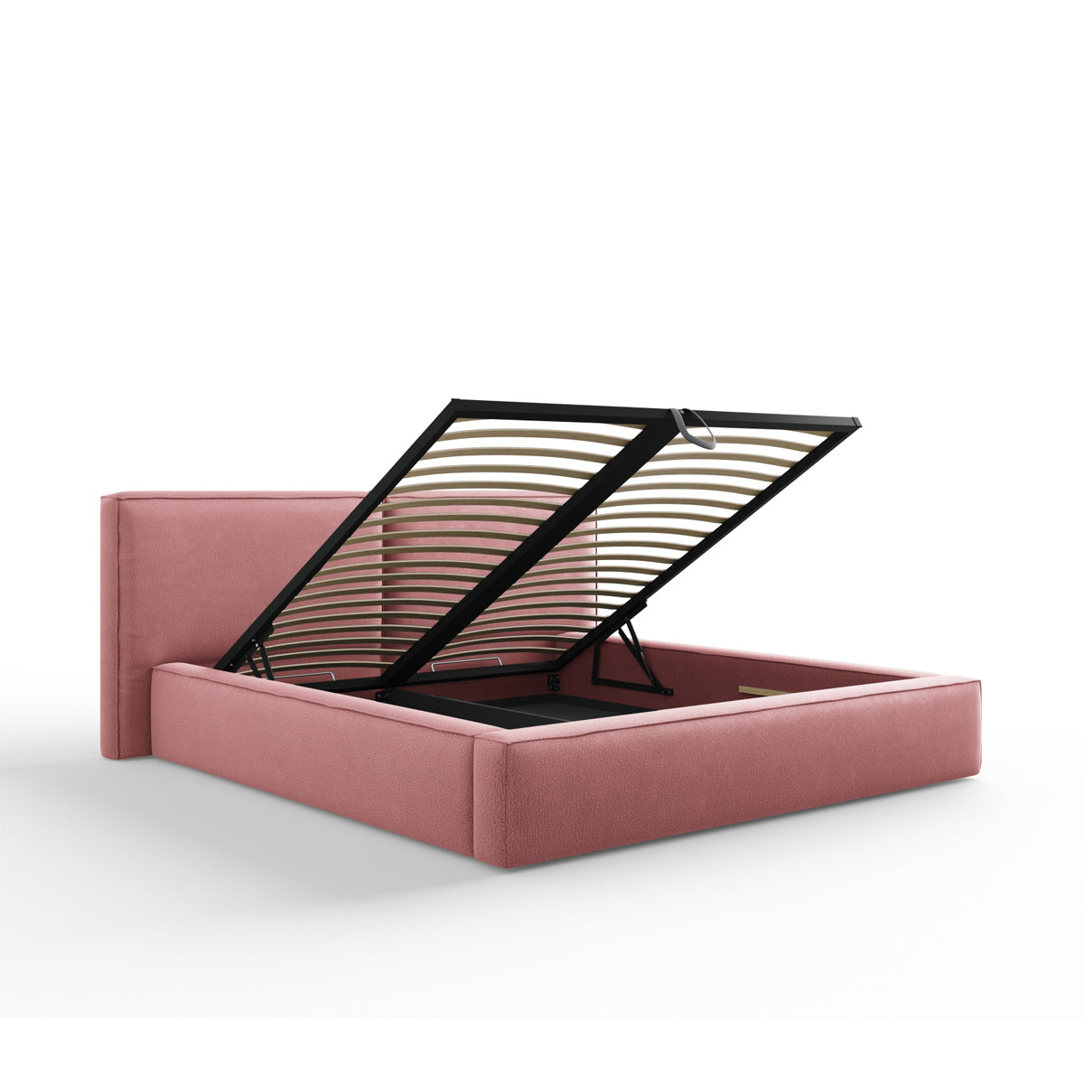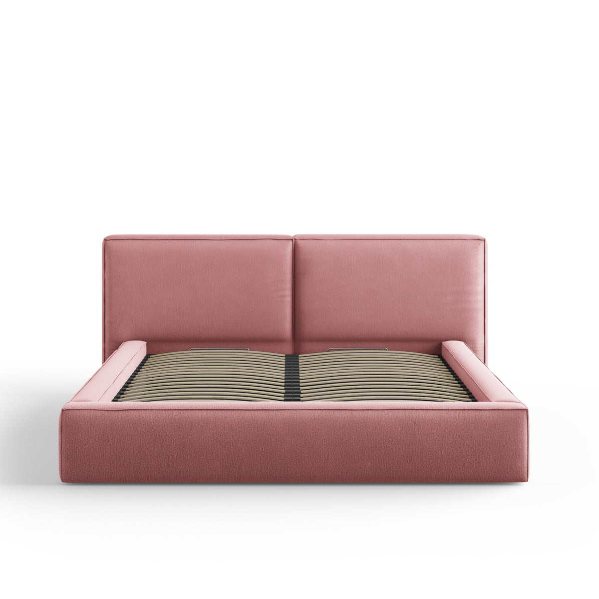 Pat tapițat în ţesatură structurată roz, cu tăblie și ladă de depozitare.