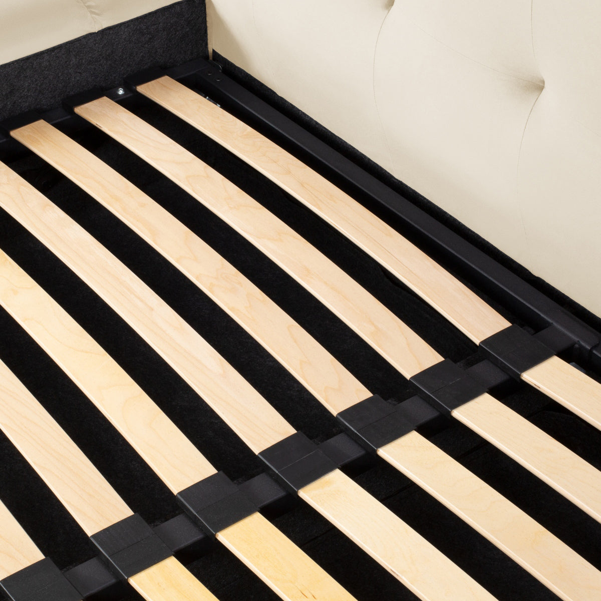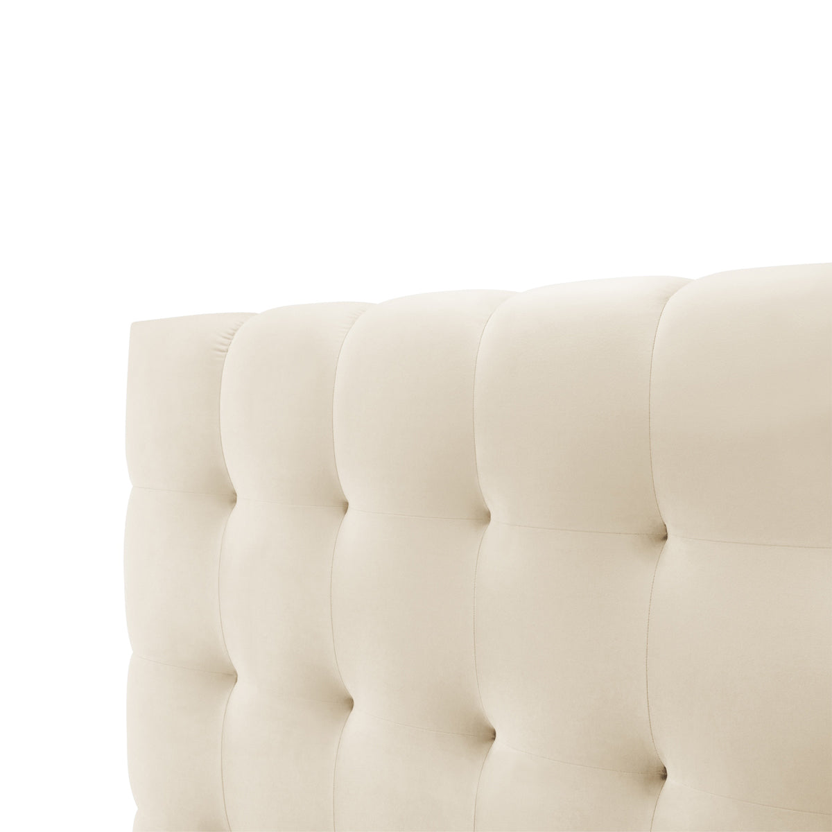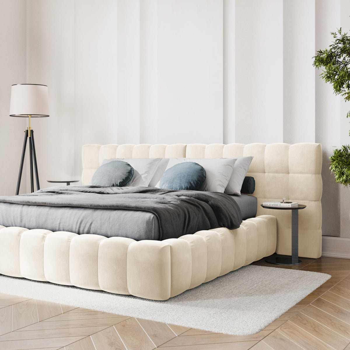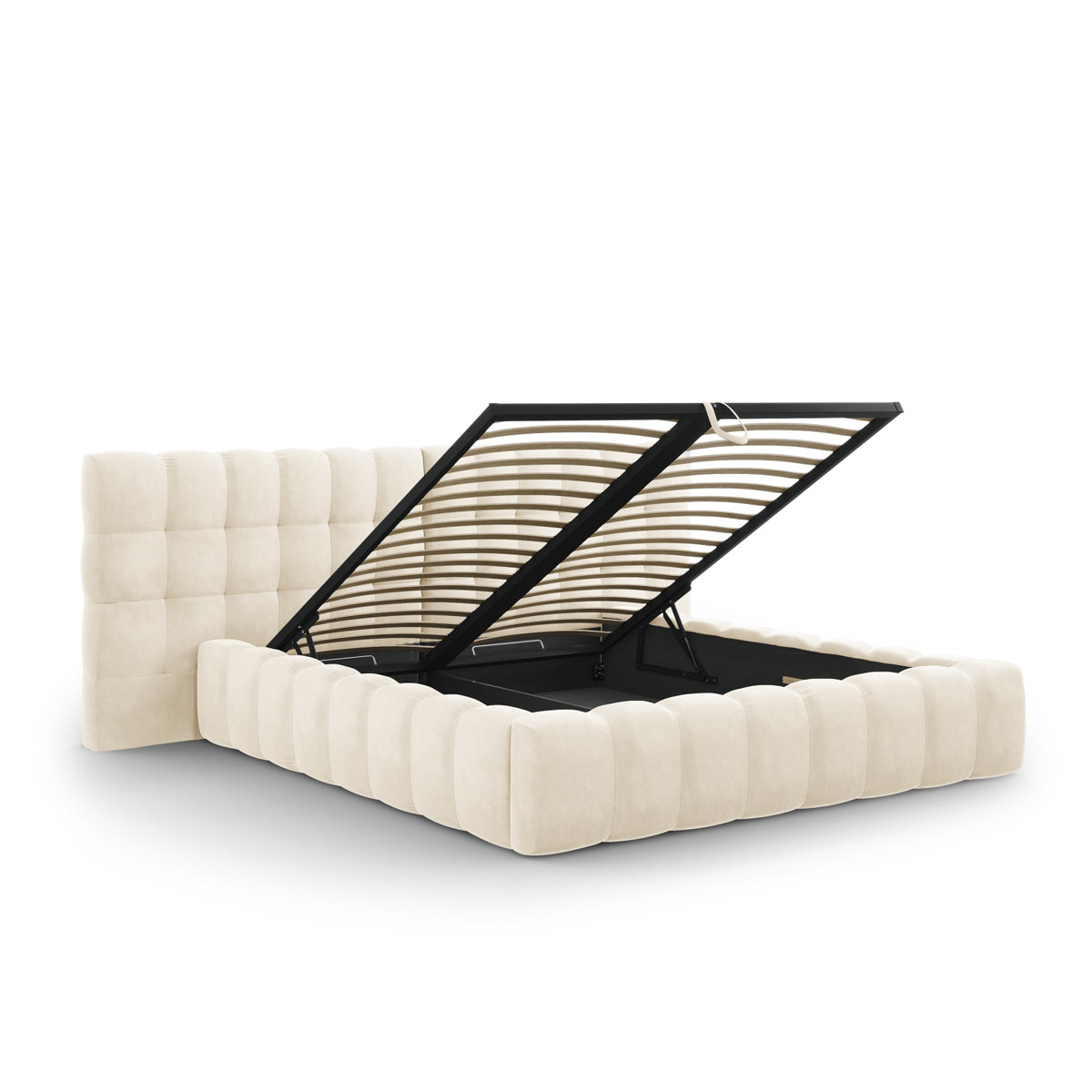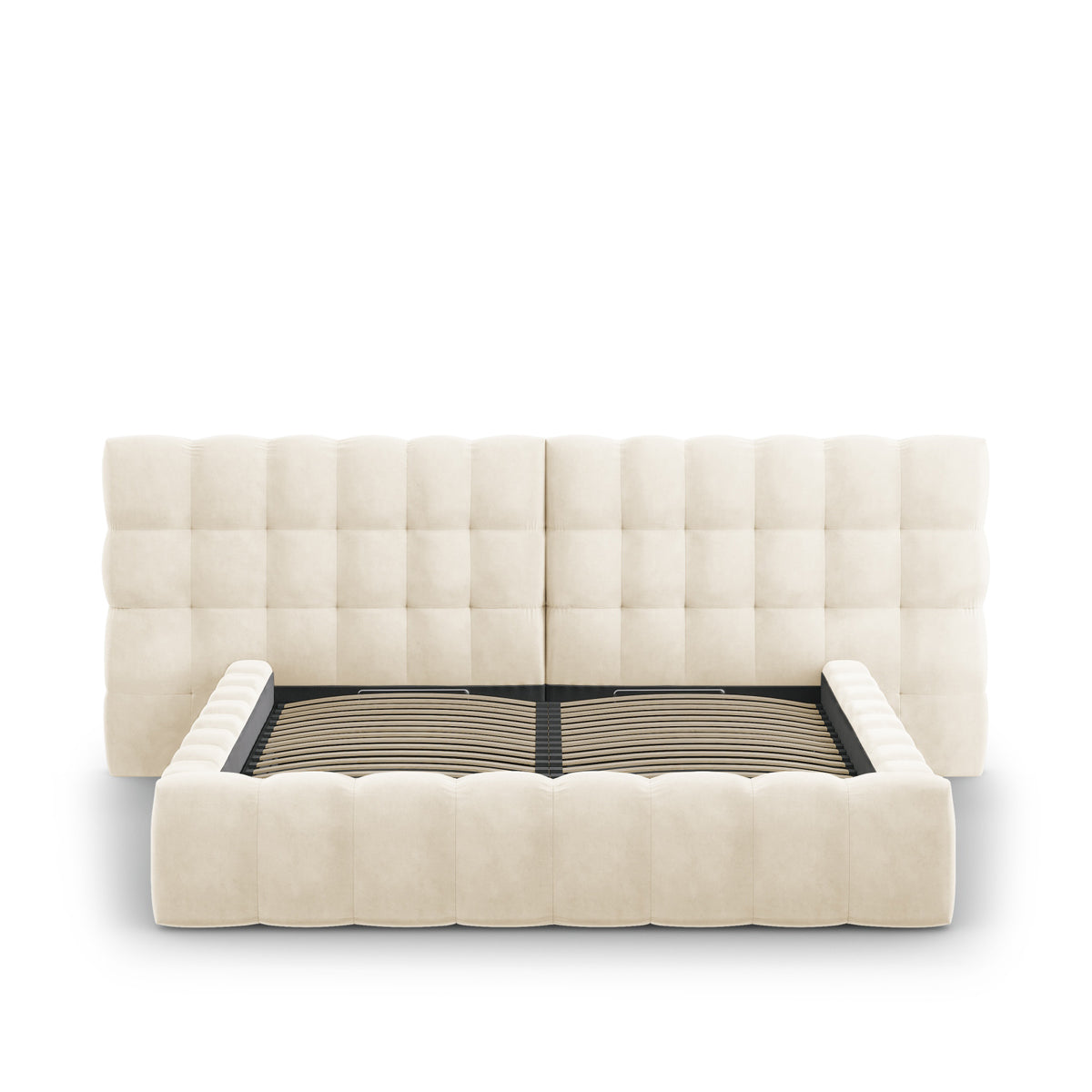 Pat tapițat în catifea bej deschis, cu tăblie și ladă de depozitare.
