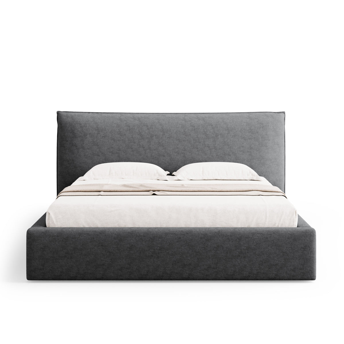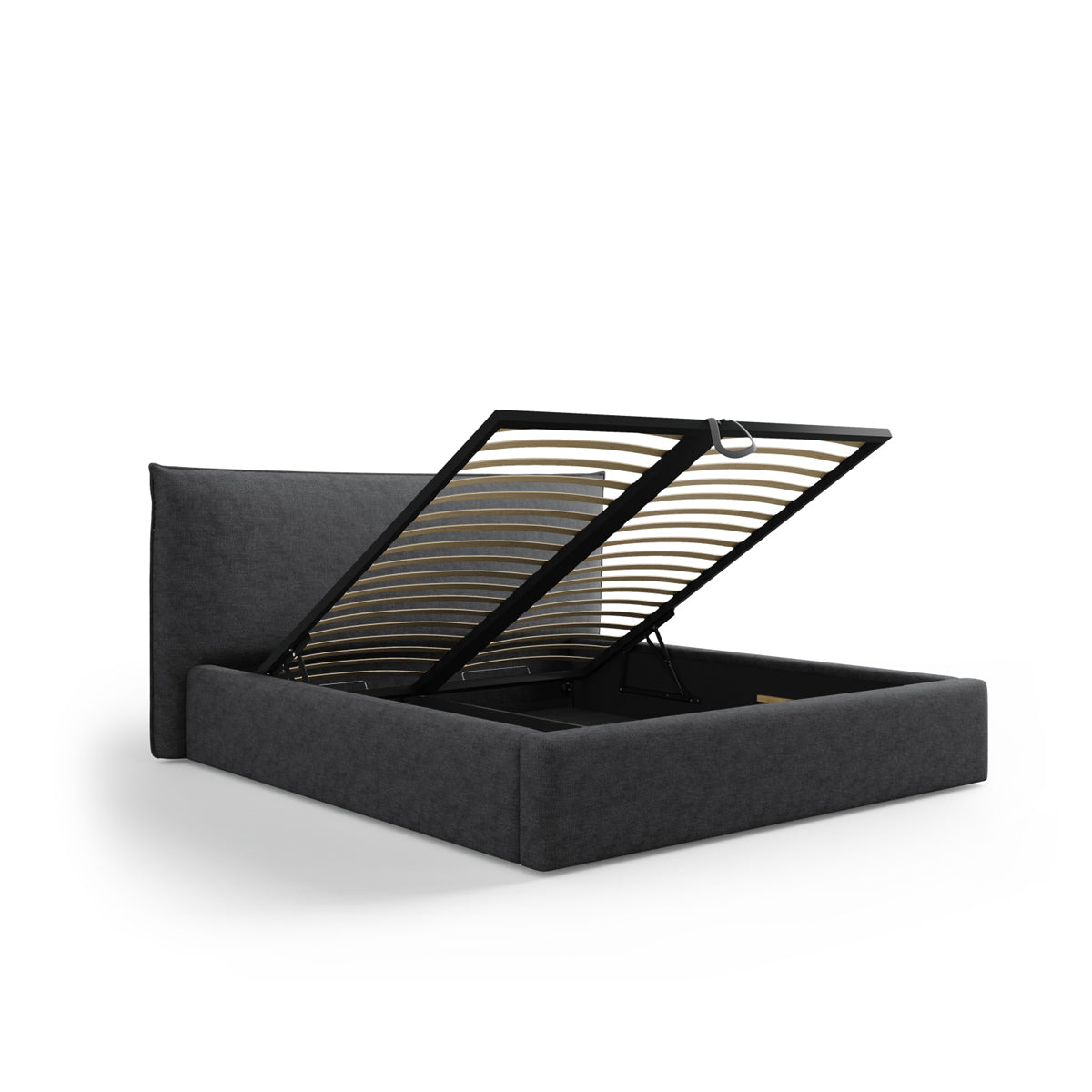 Pat tapițat în ţesatură de chenilă gri închis, cu tăblie și ladă de depozitare.