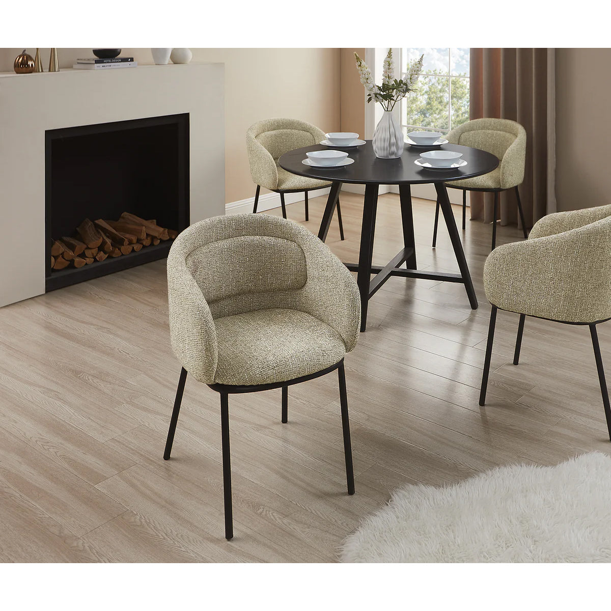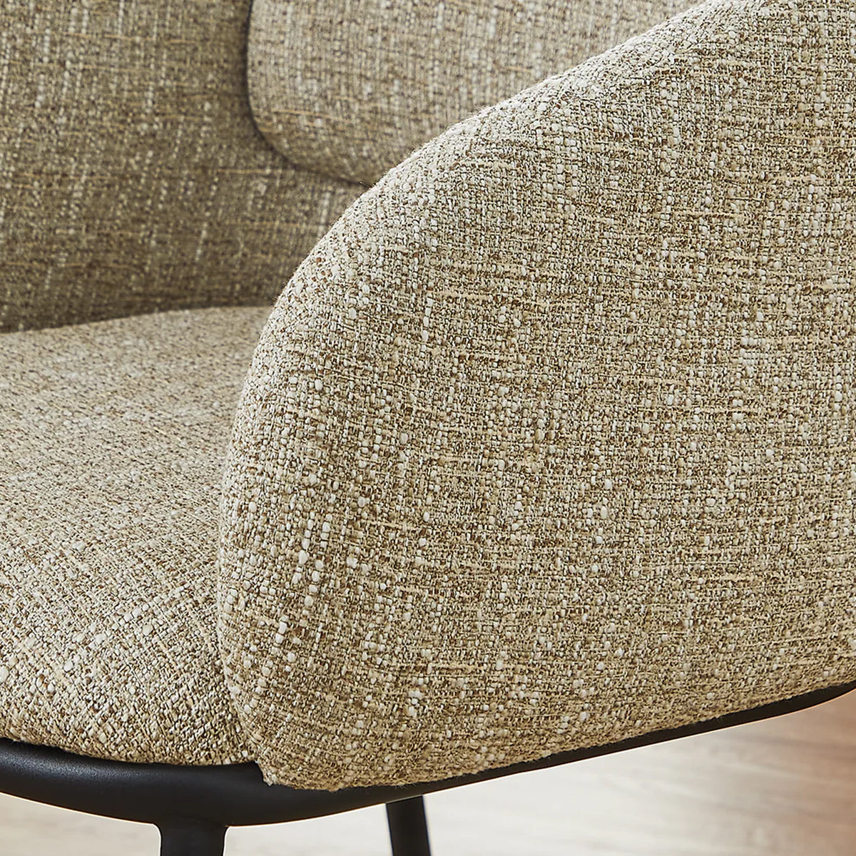 Tapițeria structurată, plăcută la atingere, pune în valoare forma rotunjită, iar picioarele negre creează un contrast fin, ideal pentru interioare contemporane cu accente calde sau nordice.