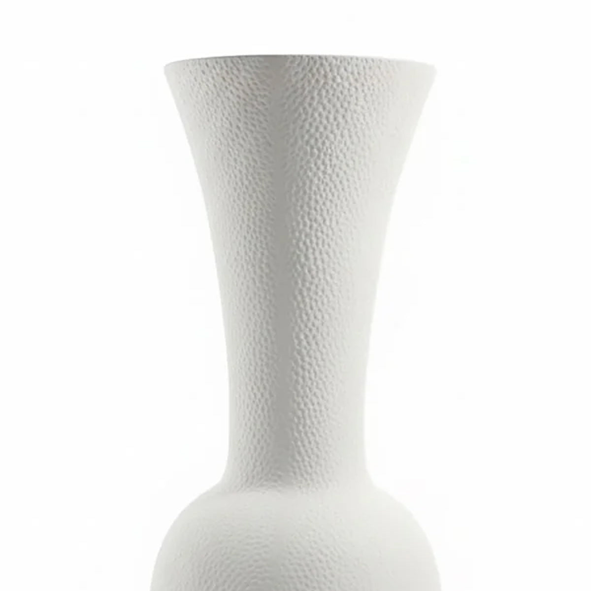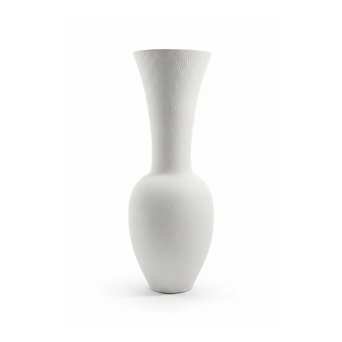 Acest vas decorativ impresionează printr-o siluetă sculpturală, elegant alungită, care transformă orice spațiu într-un decor cu aer de galerie. Realizat din beton și finisat într-un alb mat, vasul este pus în valoare de o textură tactilă discretă, cu aspect mineral, ce amintește de piatra erodată de timp și soare – genul de detaliu care nu țipă, dar se face remarcat.