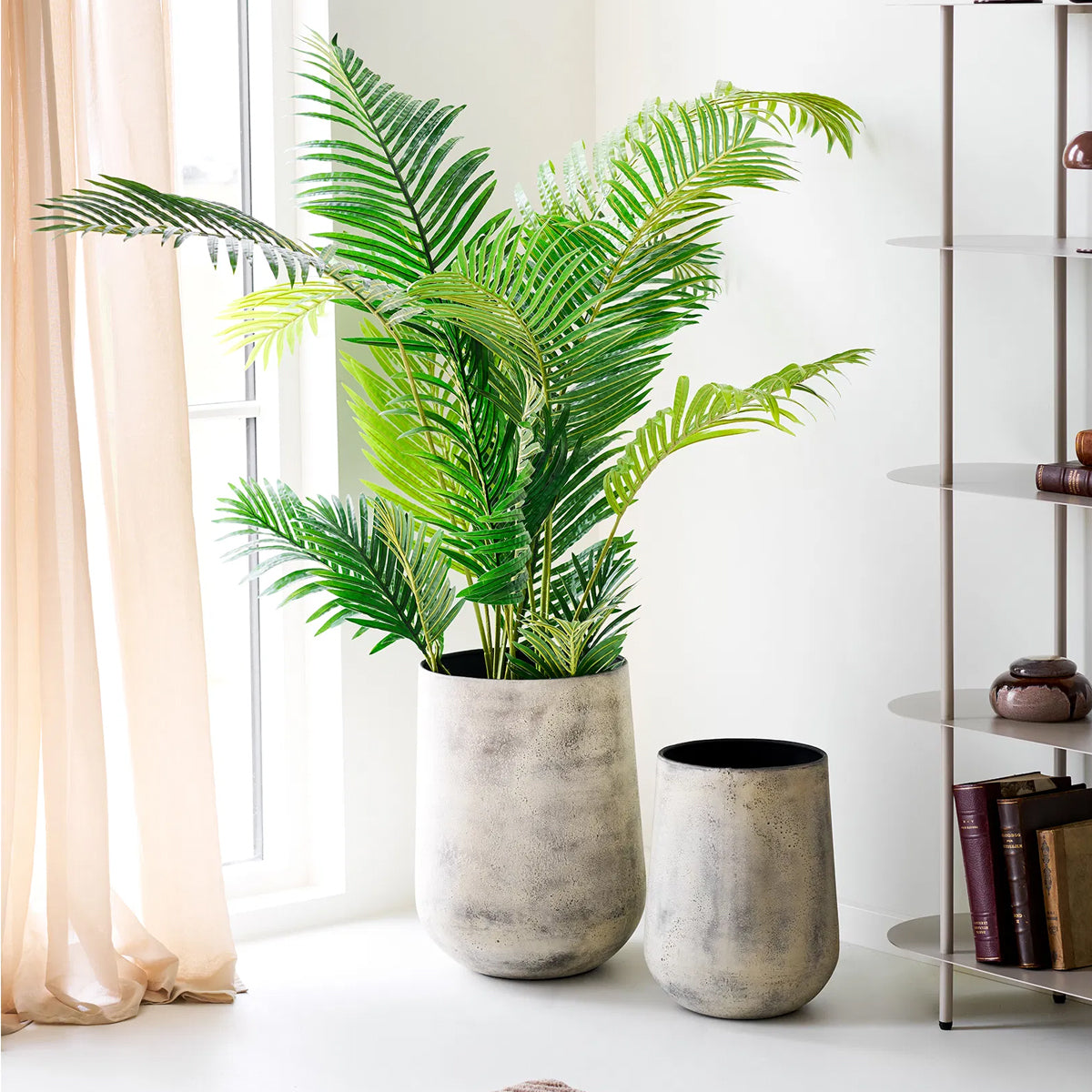 Set decorativ compus din două vase din metal, cu forme rotunjite și proporții complementare. Finisajul antique beige are variații subtile de ton și textură, care oferă un aspect uniform, dar ușor patinat. Pot fi utilizate împreună pentru un efect coerent sau separat, ca piese independente, potrivite pentru aranjamente vegetale sau ca obiecte decorative în living, hol sau spații comerciale cu design contemporan.