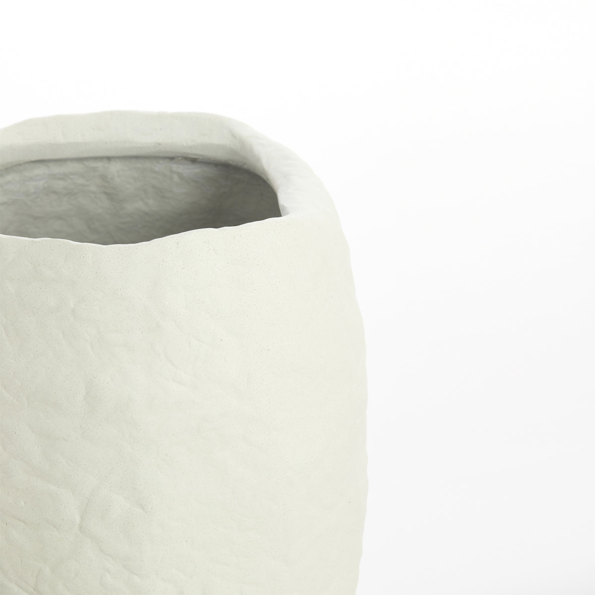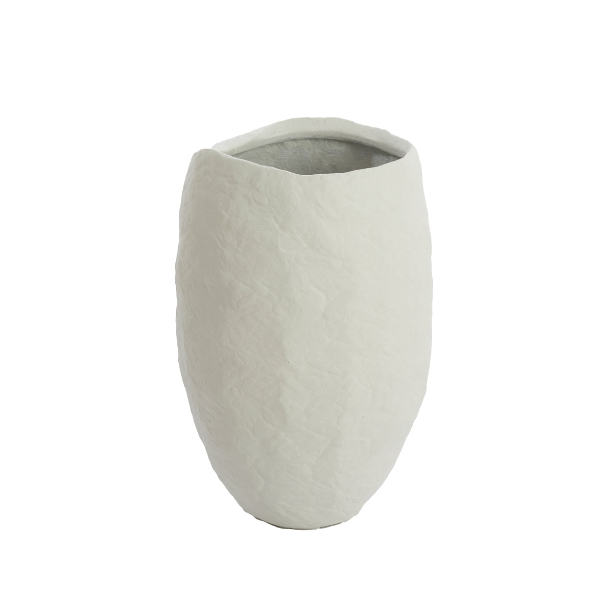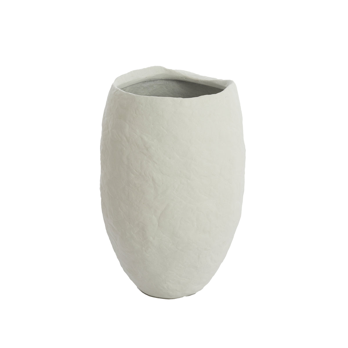 Vas decorativ realizat din compozit cement/stone, disponibil în două dimensiuni. Finisajul alb mat evidențiază textura naturală a suprafeței și pune în valoare forma organică, integrându-se ușor în interioare luminoase, amenajate în spirit Slow Living. Poate fi amplasat direct pe pardoseală, individual sau în pereche (dimensiune mică și mare), fiind potrivit pentru ramuri decorative sau ca element sculptural discret.