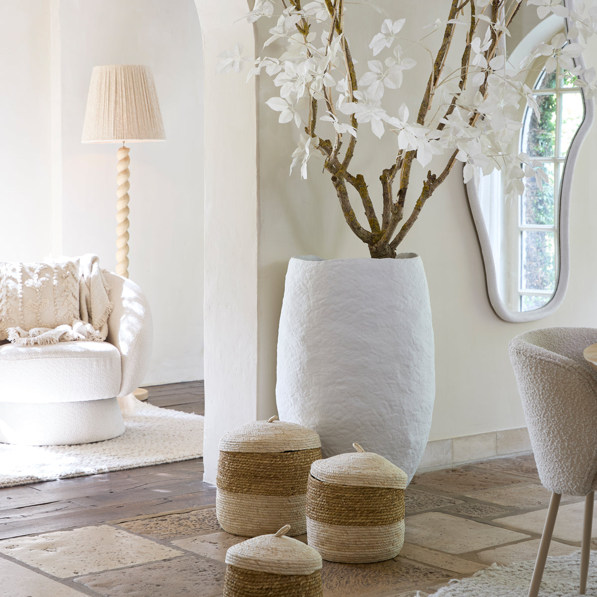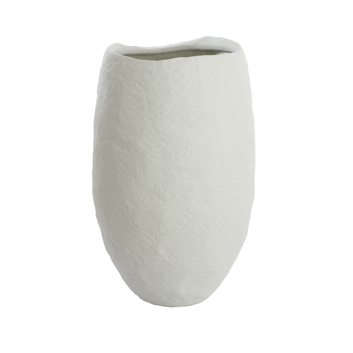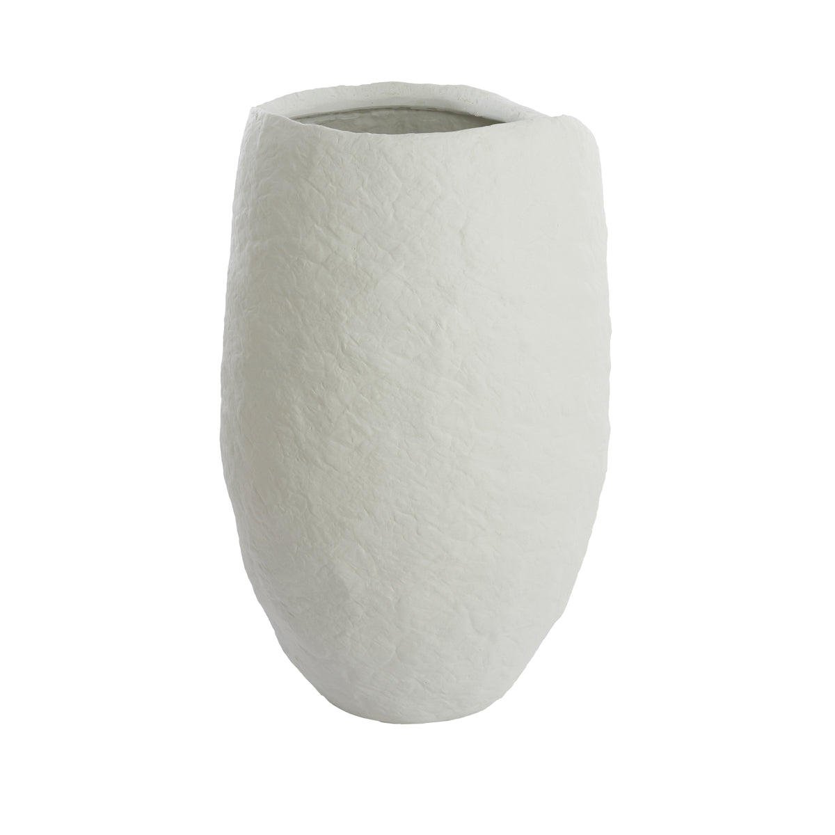 Vas decorativ realizat din compozit cement/stone, disponibil în două dimensiuni. Finisajul alb mat evidențiază textura naturală a suprafeței și pune în valoare forma organică, integrându-se ușor în interioare luminoase, amenajate în spirit Slow Living. Poate fi amplasat direct pe pardoseală, individual sau în pereche (dimensiune mică și mare), fiind potrivit pentru ramuri decorative sau ca element sculptural discret.
