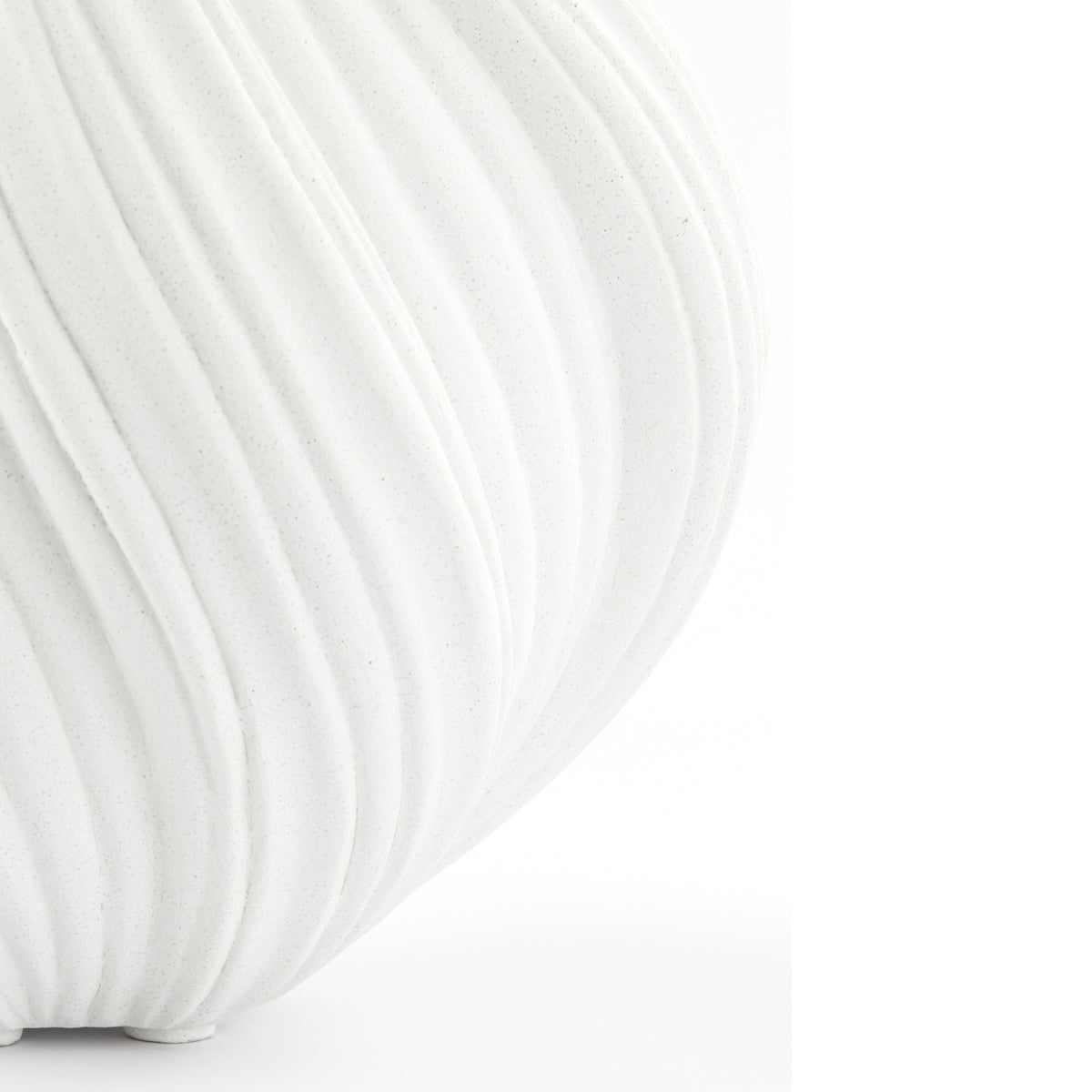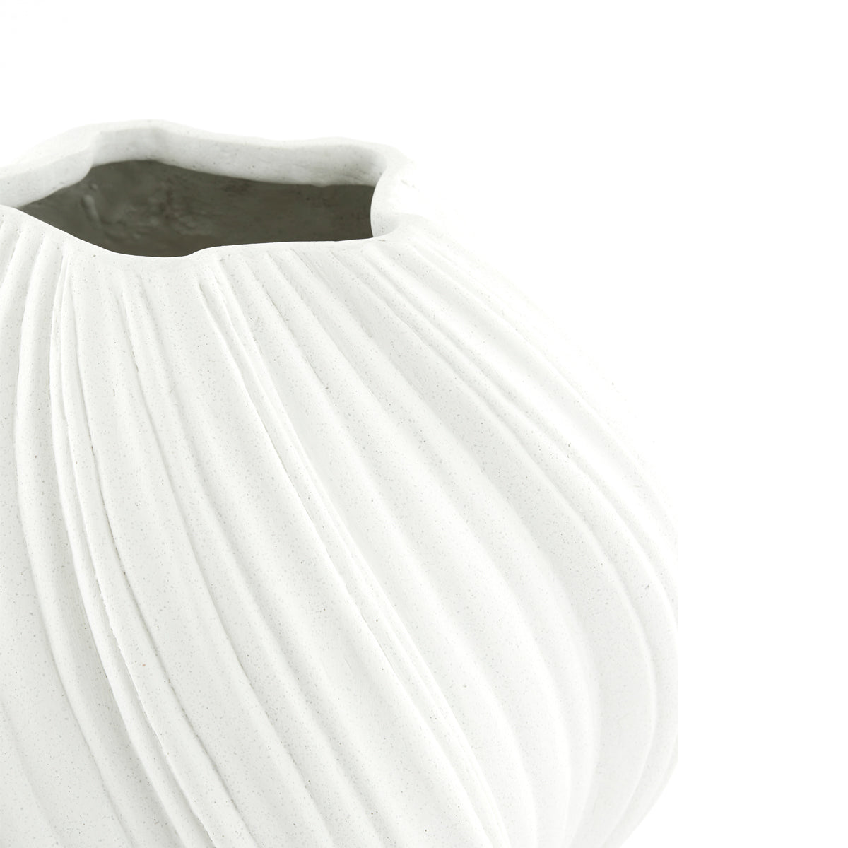 Vas decorativ din compozit cement/stone, cu formă rotunjită și volum compact. Textura fluidă, reliefată pe întreaga suprafață, creează un joc discret de umbre pe finisajul alb mat. Dimensiunea îl recomandă pentru mese, console sau rafturi, unde poate funcționa ca piesă decorativă independentă sau suport pentru aranjamente joase.