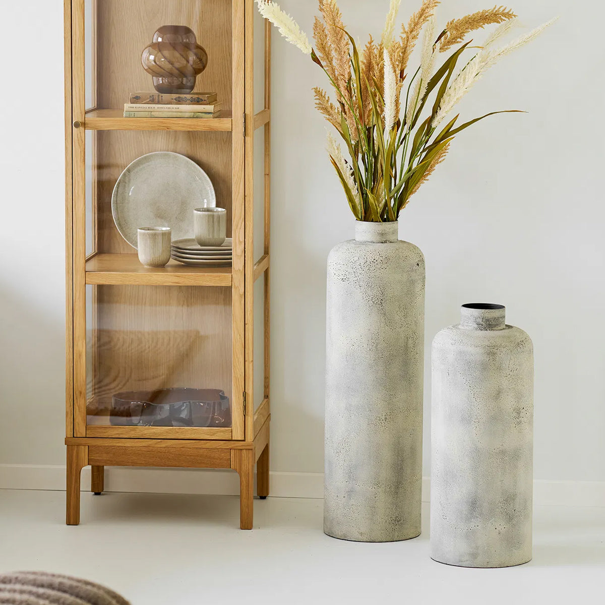 Vas decorativ din metal, cu siluetă înaltă și formă cilindrică alungită. Finisajul antique beige evidențiază variații discrete de ton și textură, conferind piesei un aspect ușor patinat. Proporțiile verticale îl recomandă pentru amplasare direct pe pardoseală, fiind potrivit pentru ramuri decorative sau aranjamente vegetale înalte, dar și ca element decorativ independent în spații rezidențiale sau comerciale.
