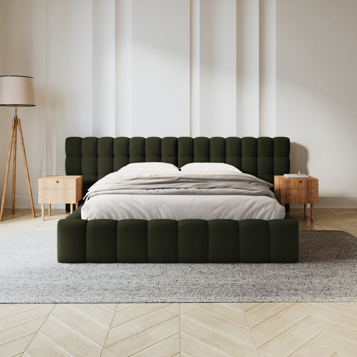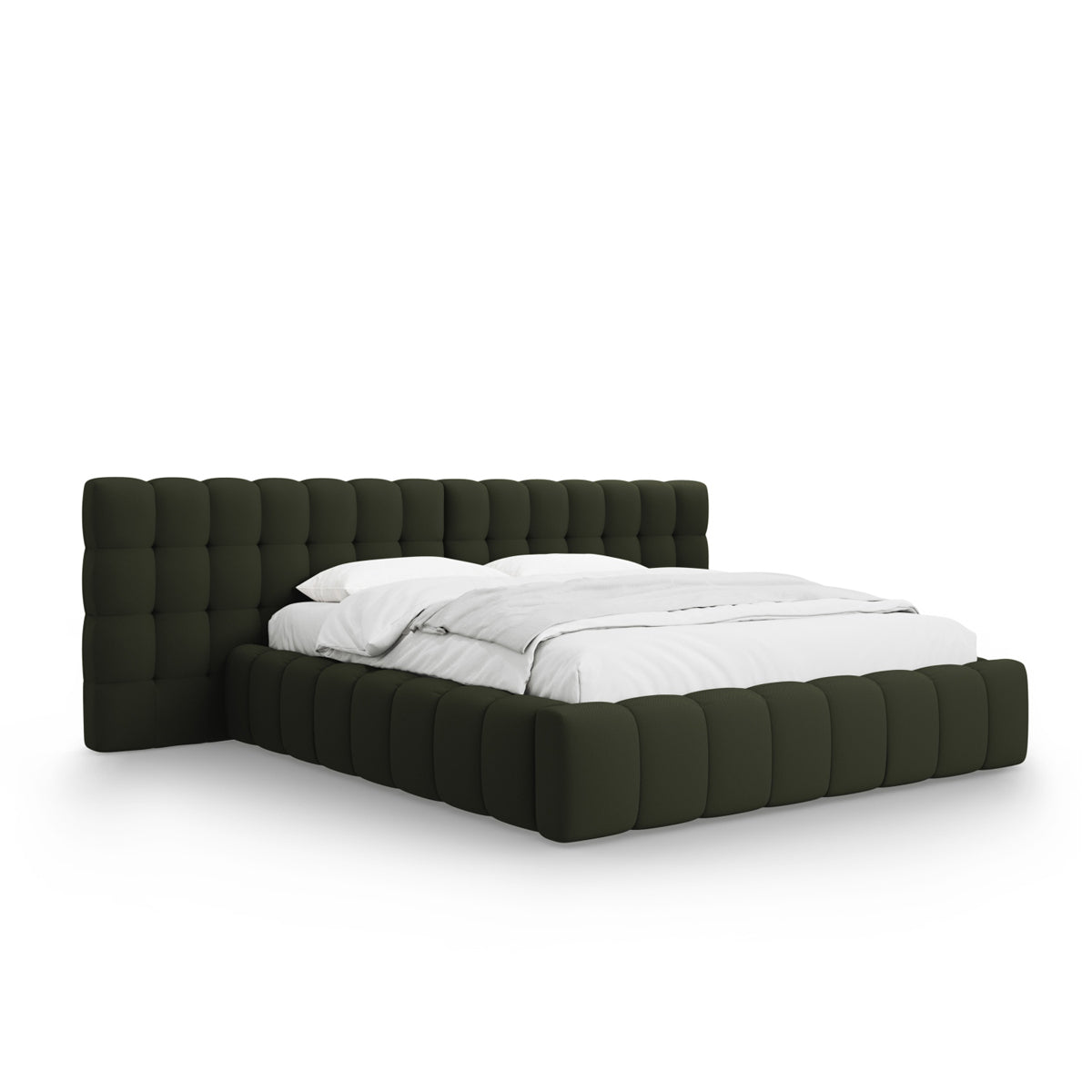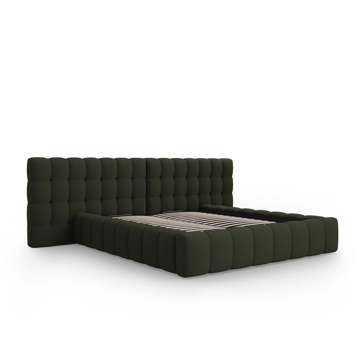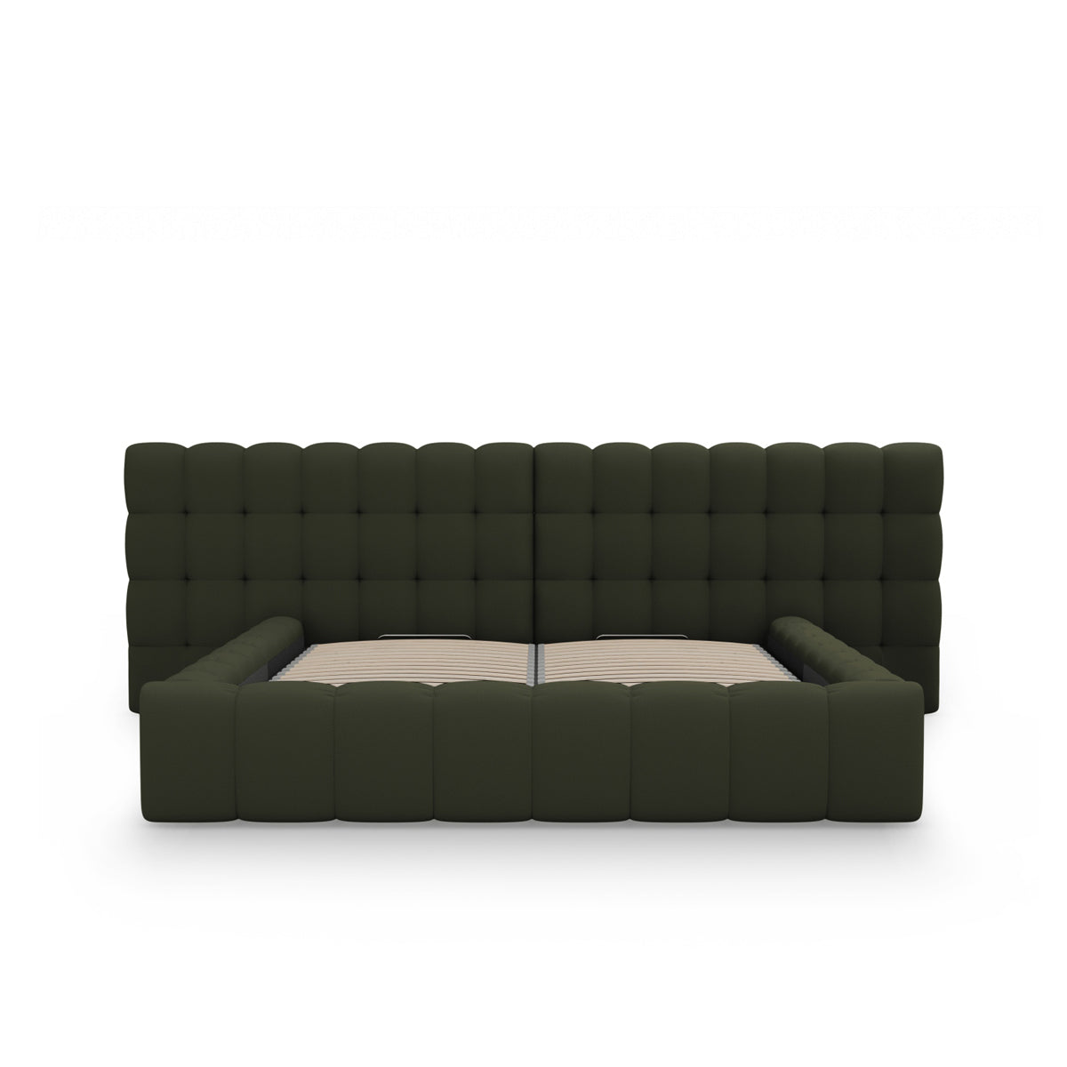 Pat tapițat în ţesatură structurată verde, cu tăblie și ladă de depozitare.