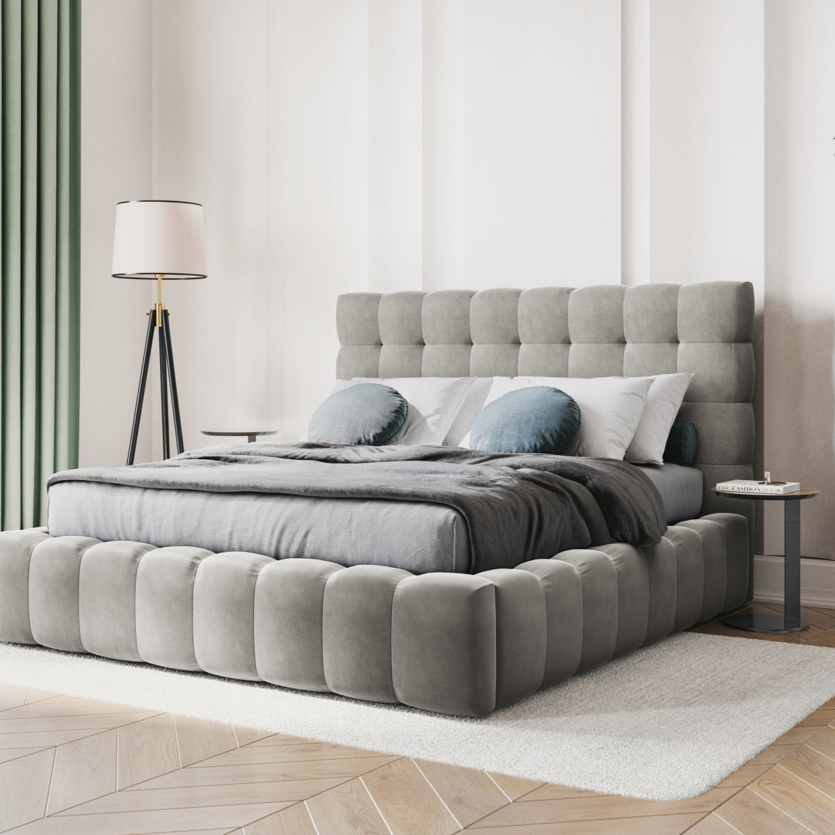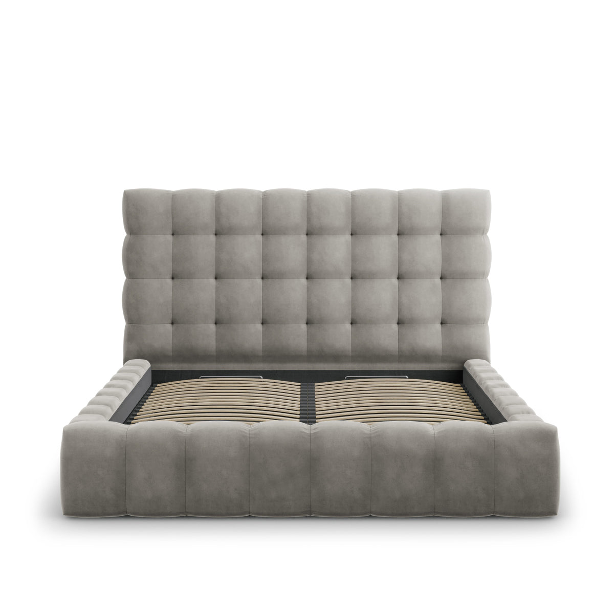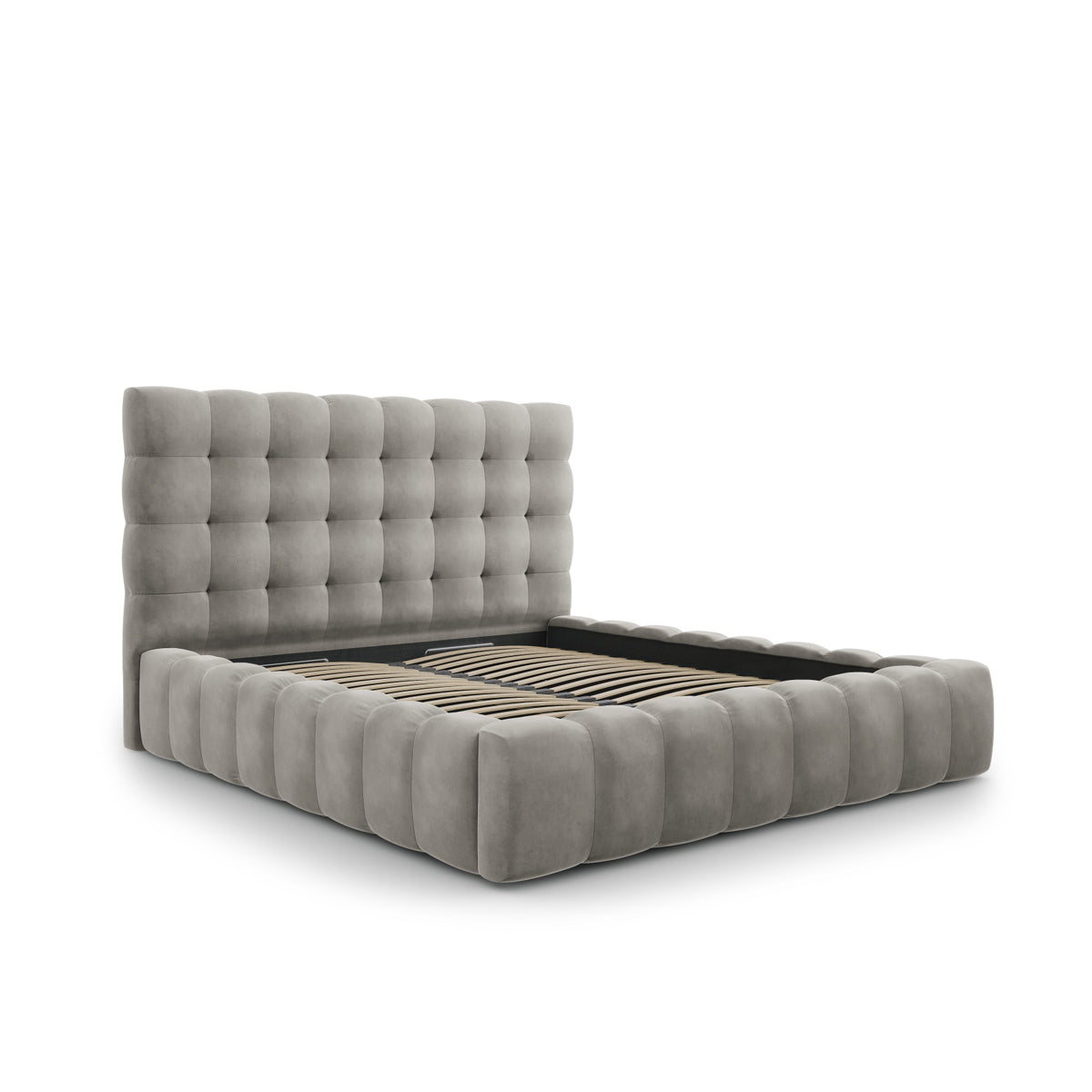 Pat tapițat în catifea gri deschis, cu tăblie și ladă de depozitare.