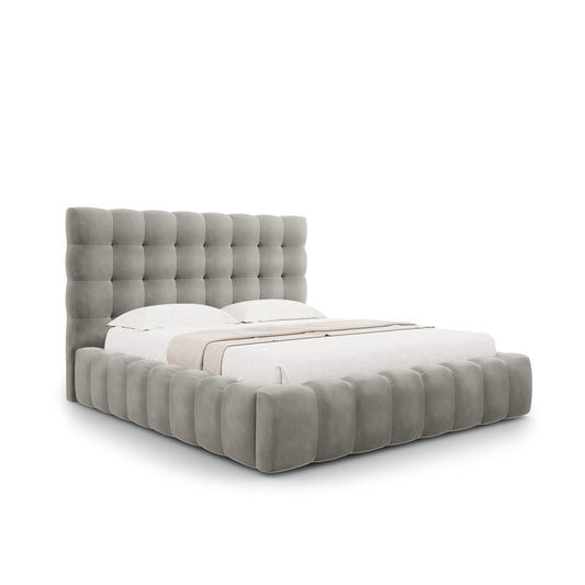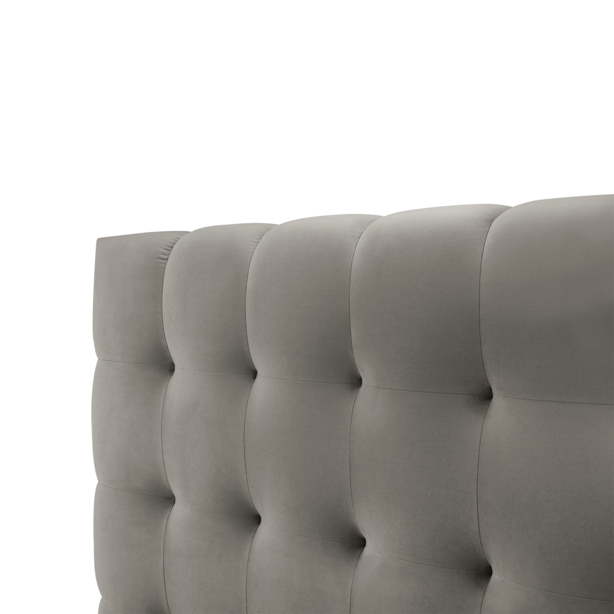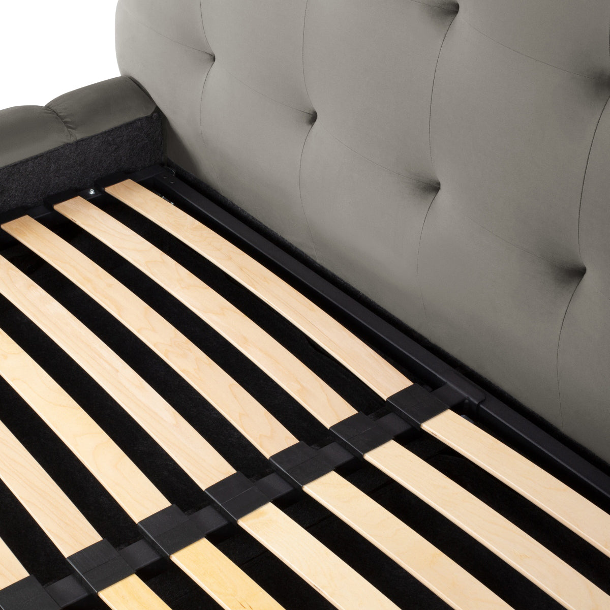 Pat tapițat în catifea gri deschis, cu tăblie și ladă de depozitare.