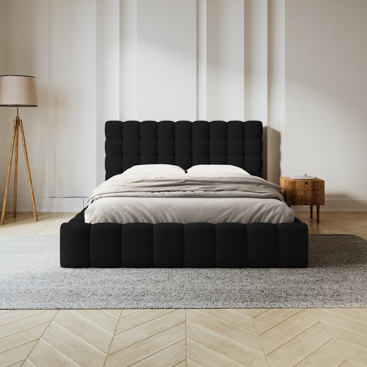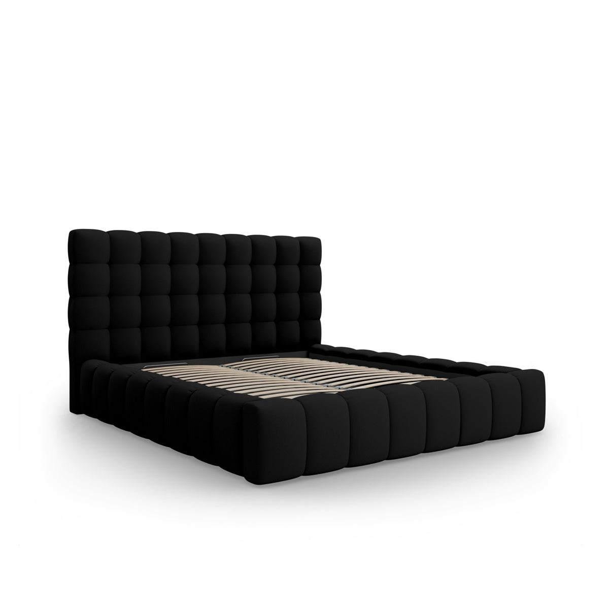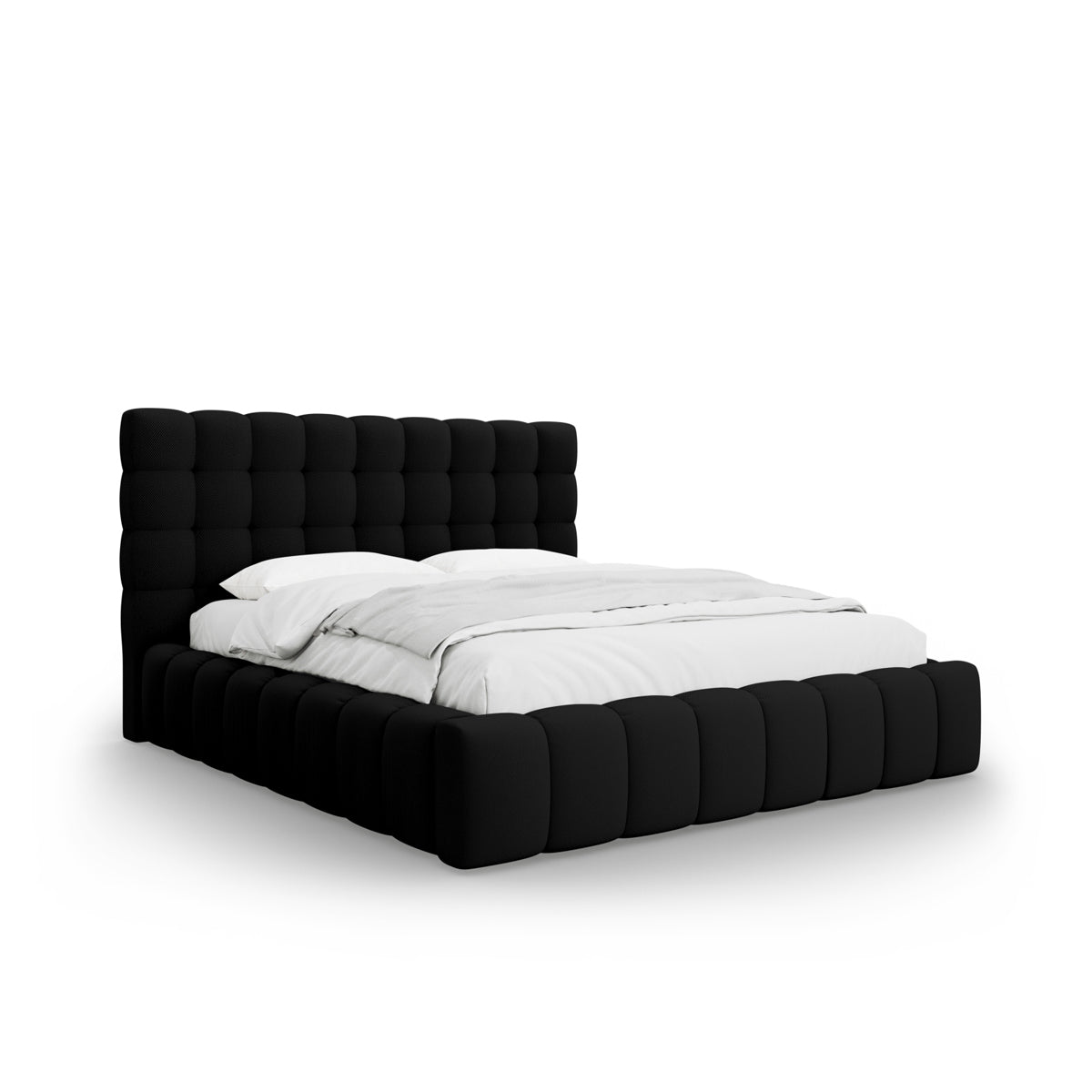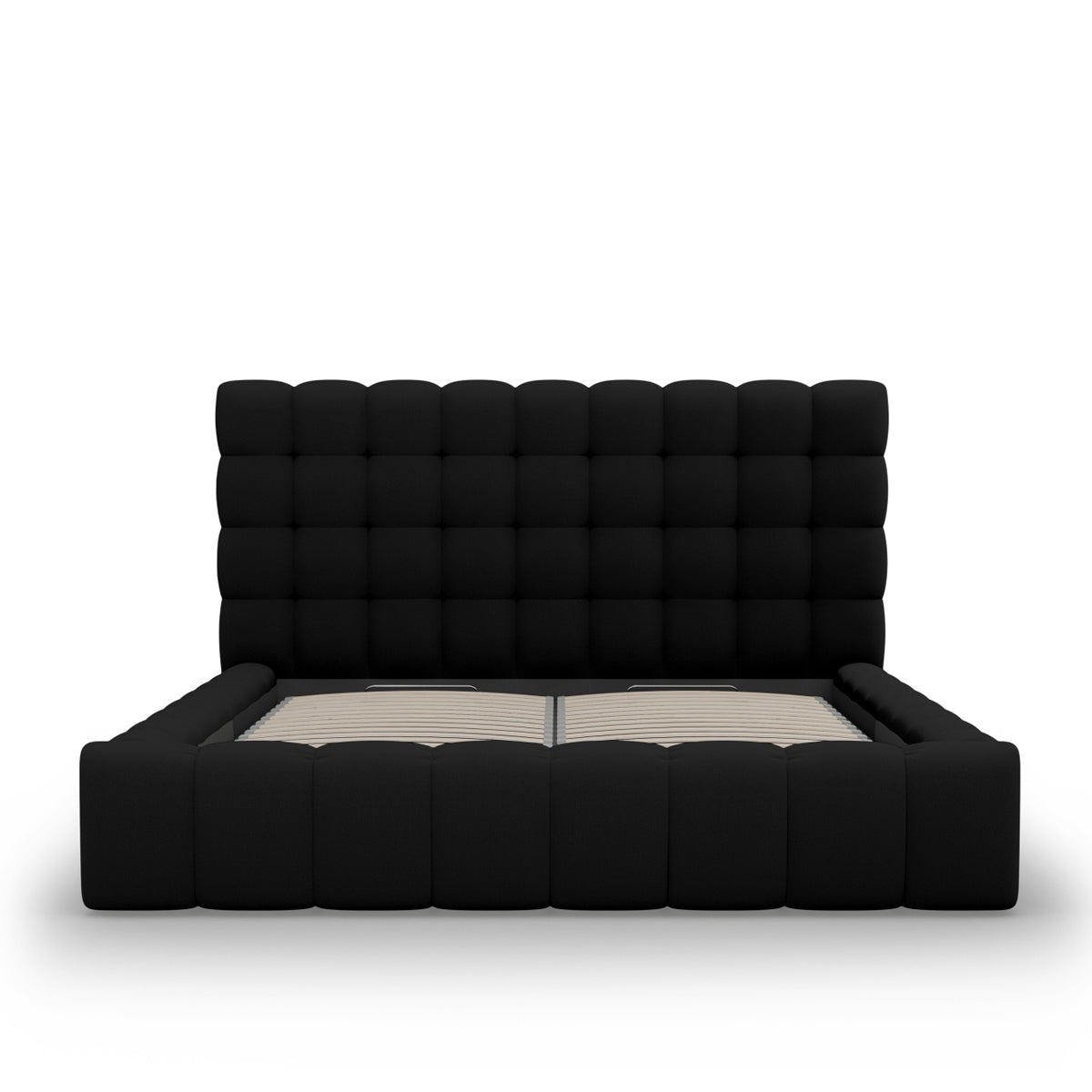 Pat tapițat în ţesatură structurată neagră, cu tăblie și ladă de depozitare.