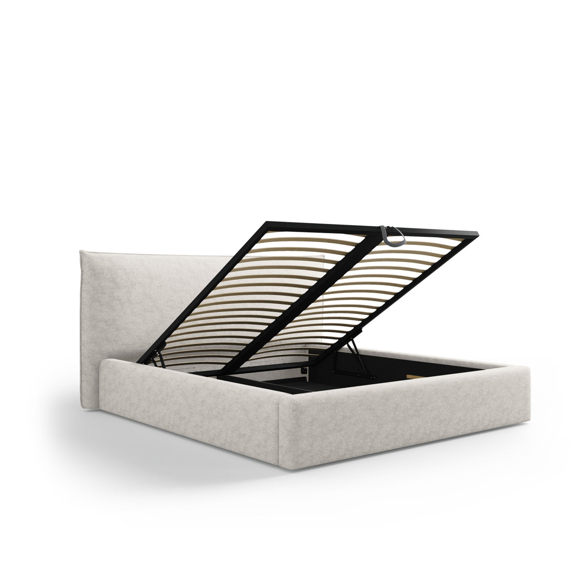 Pat tapițat în ţesatură de chenilă bej deschis, cu tăblie și ladă de depozitare.